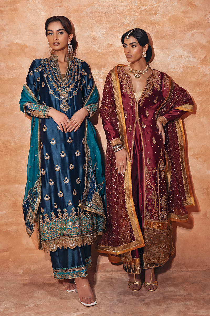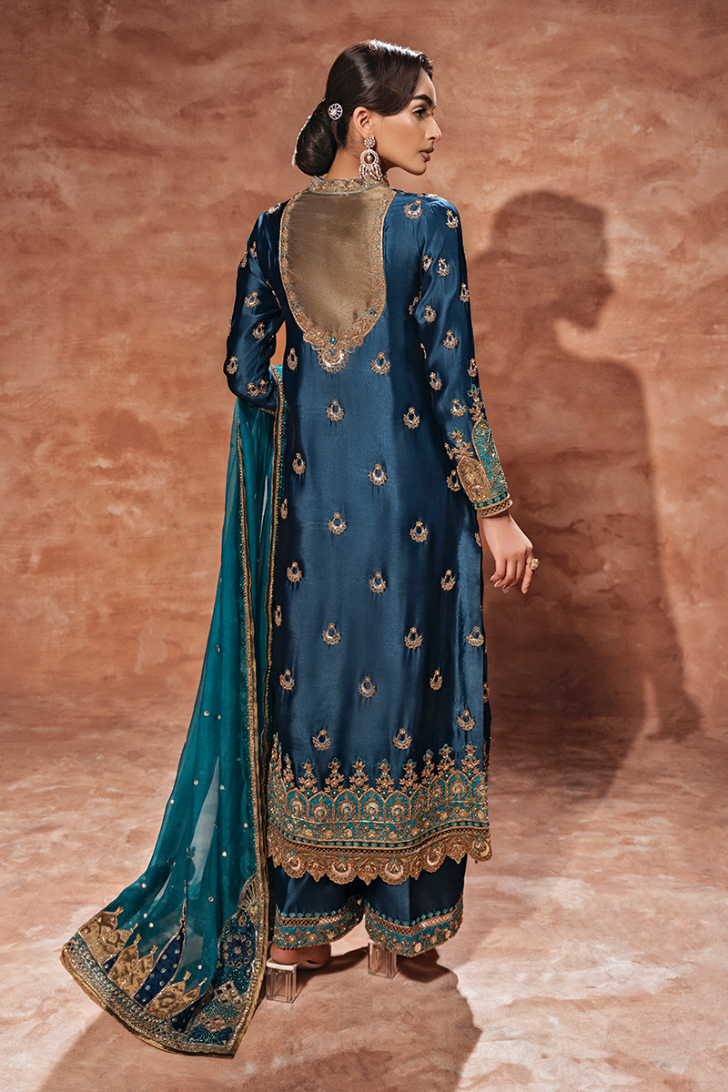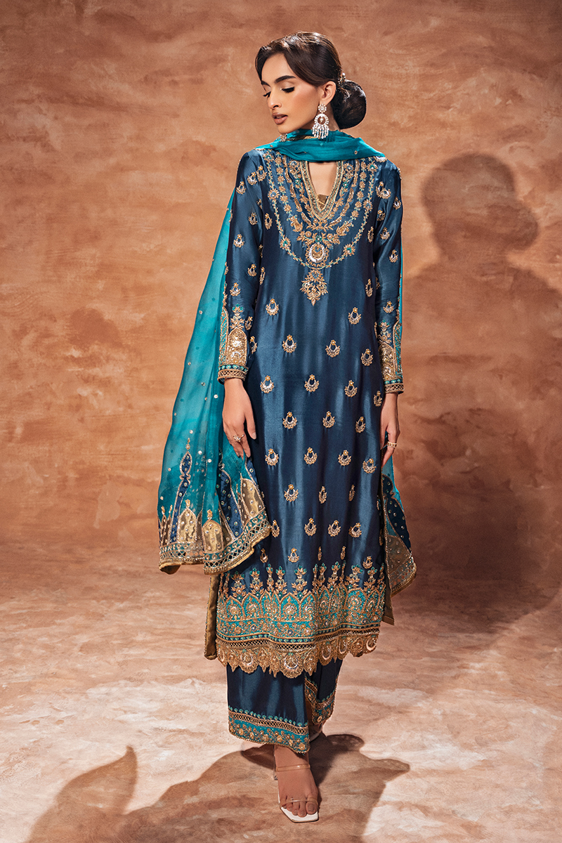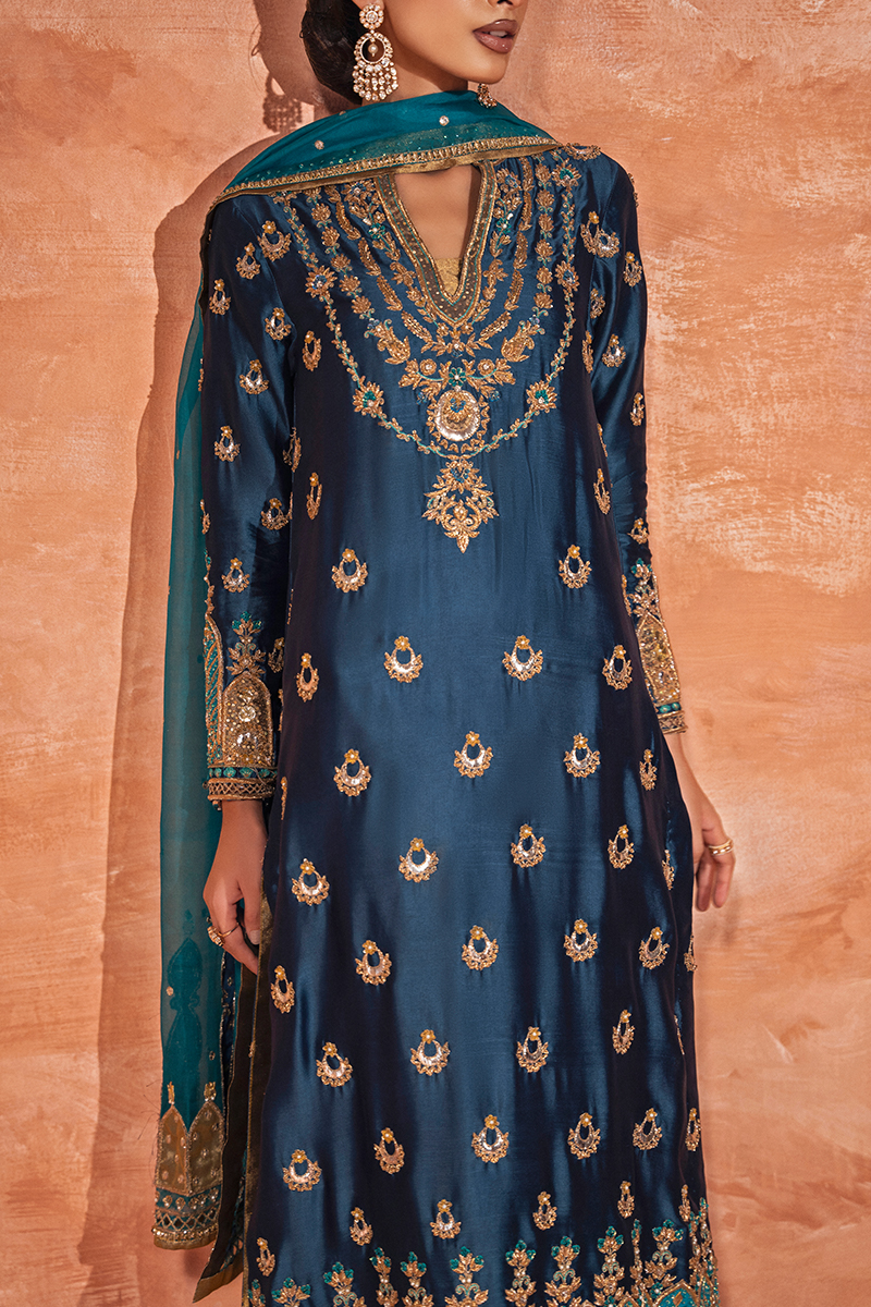 Elevate your style with this breathtaking, hand-embellished Tissue Silk Azure Relaxed fit shirt, paired with a diaphanous organza dupatta and a matching hand-embellished culotte. Showcasing a masterful blend of zari, sequins, resham, mukesh, cut dana, and gotta work, this ensemble is a true masterpiece of craftsmanship.