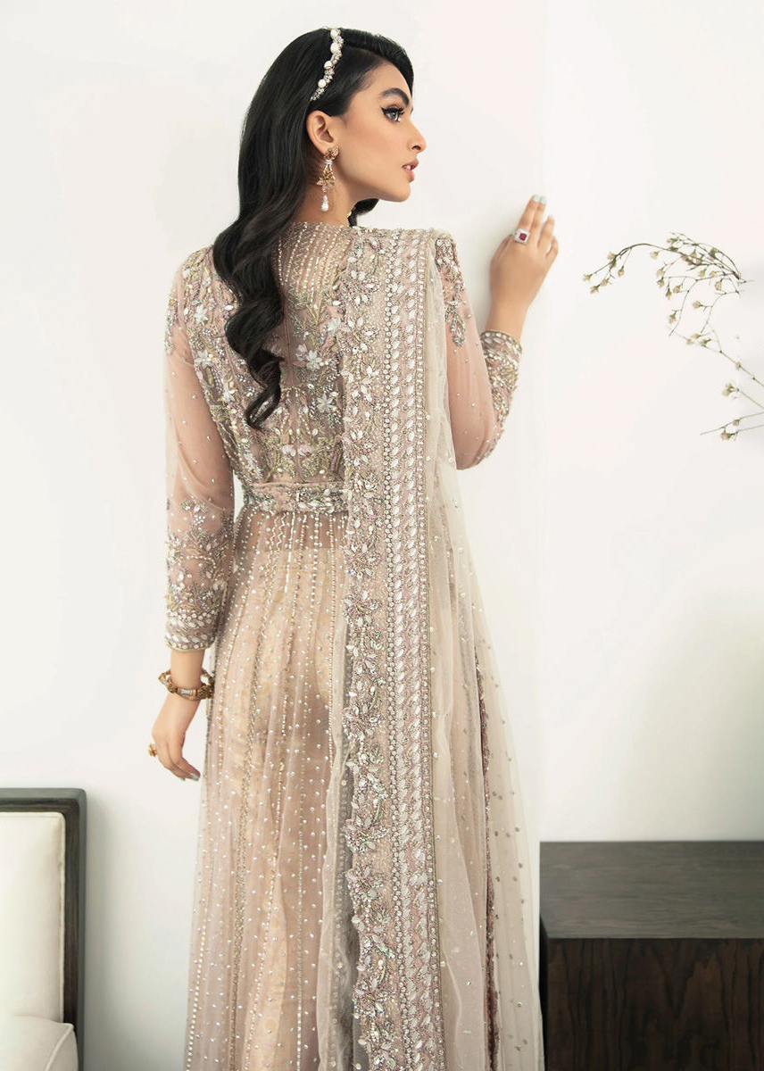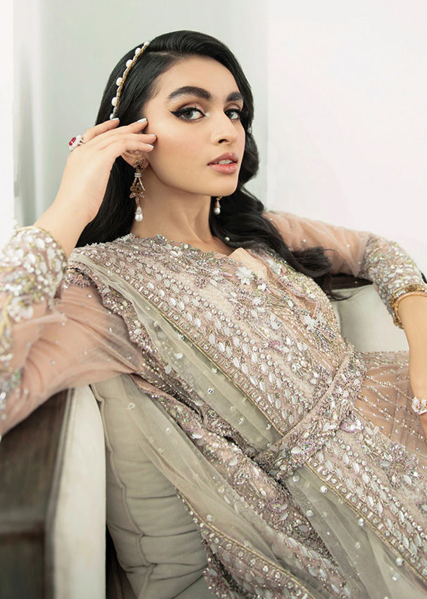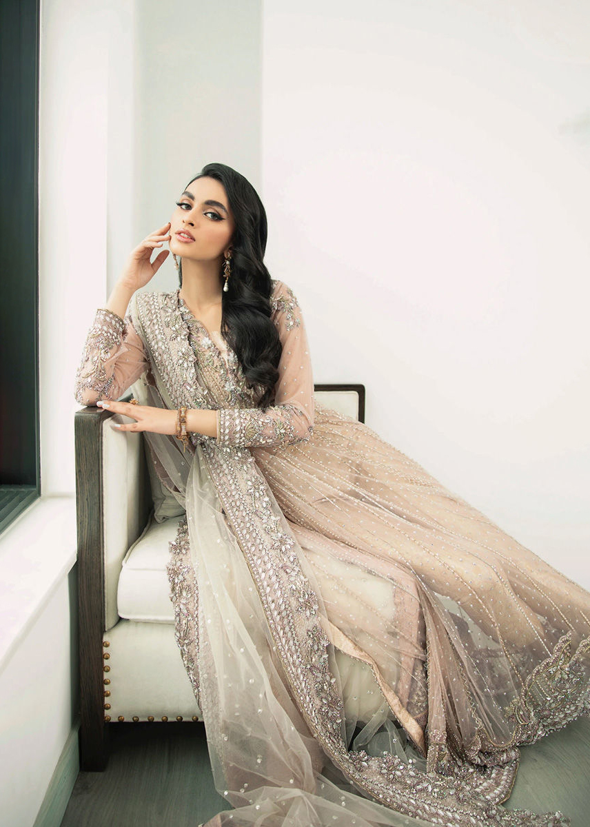 A beautiful amalgamation of nude pastels with delicate detailing makes for a stellar ensemble. The modern tailored cut with the statement work on the gown displays contemporary elegance which is paired with straight jamawar pants and blouse. The outfit comes with sequin spray dupatta. Note: The heavy embellished dupatta sold separately.