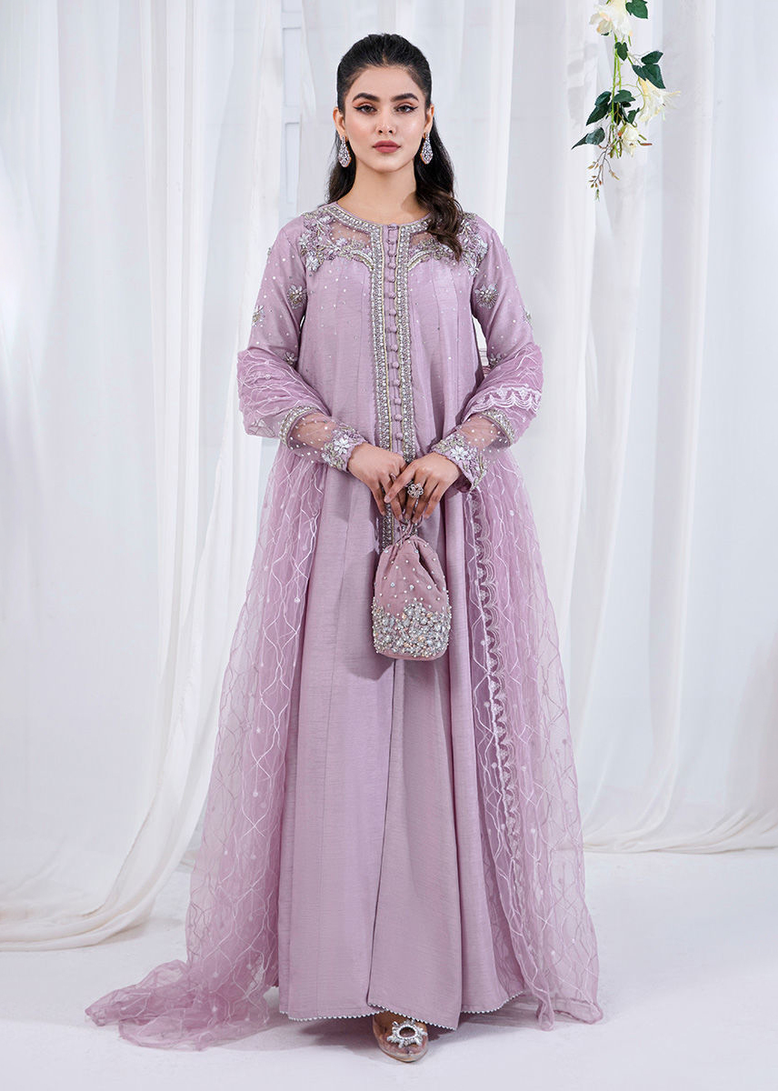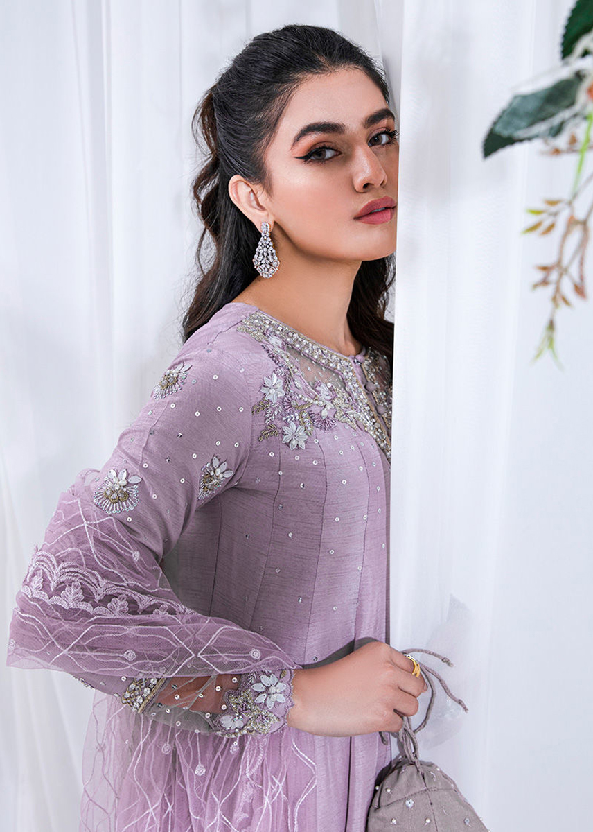 This gorgeous silk kalidar has a hand embellished neckline and sleeves with dainty french motifs and trellises paired with sequin worked embroidered tulle dupatta and silk pants.