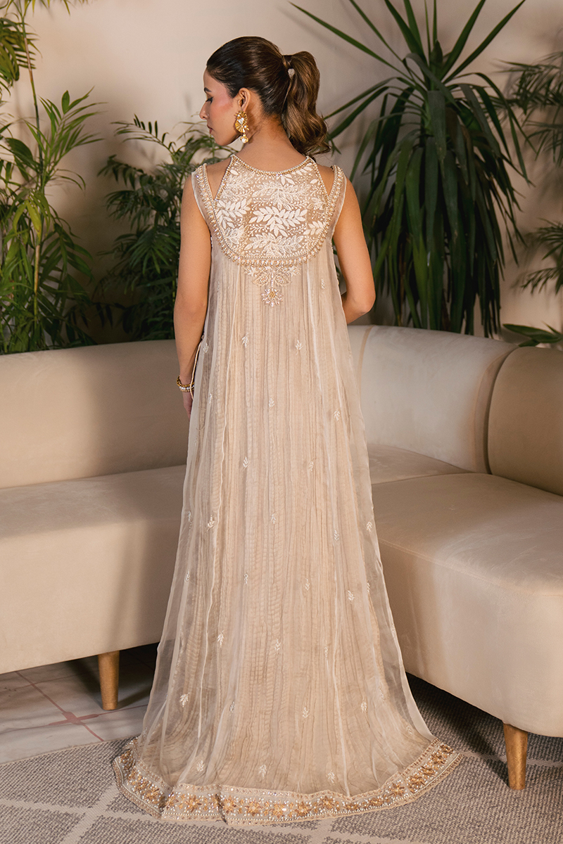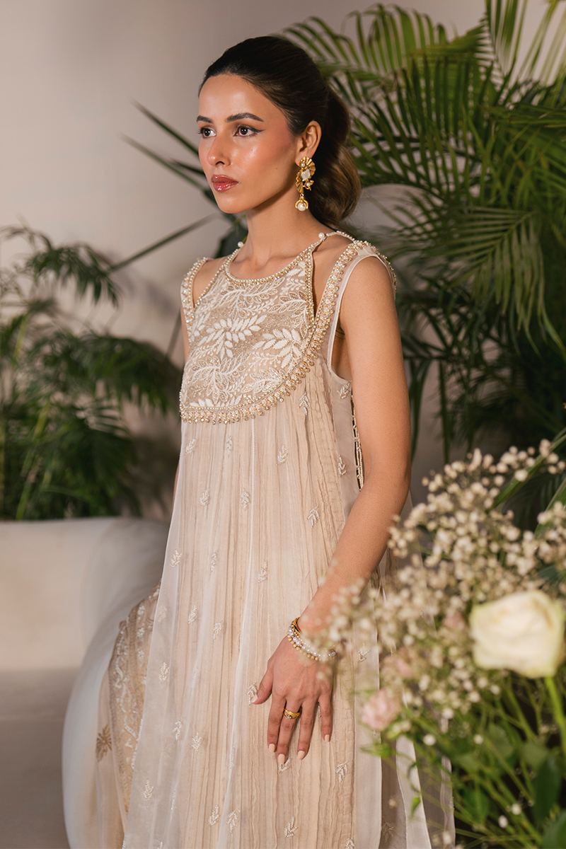 This is a beautifully crafted beige ensemble featuring a flowy crushed silk slip adorned with intricate detailing. The outfit is paired with a sophisticated silk block-printed dupatta, adding elegance and charm.