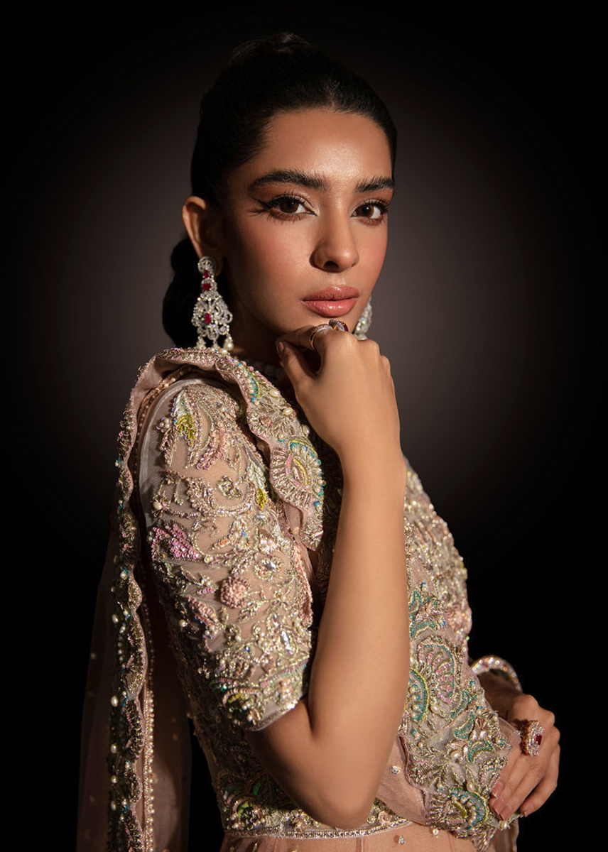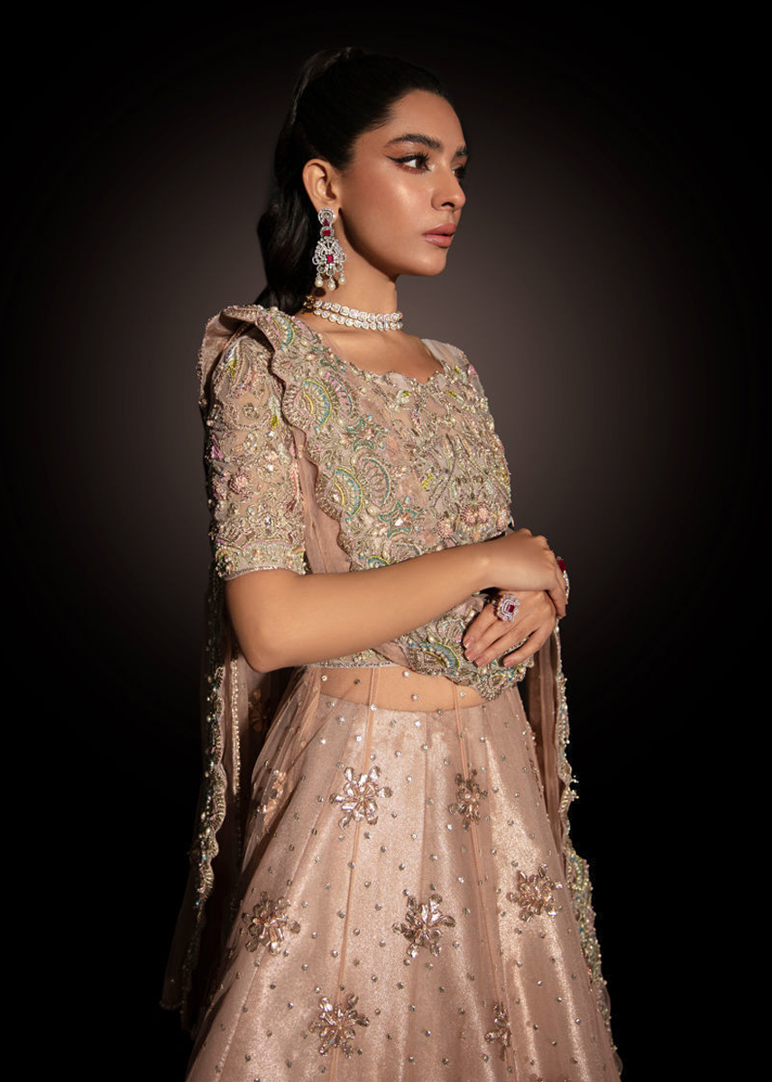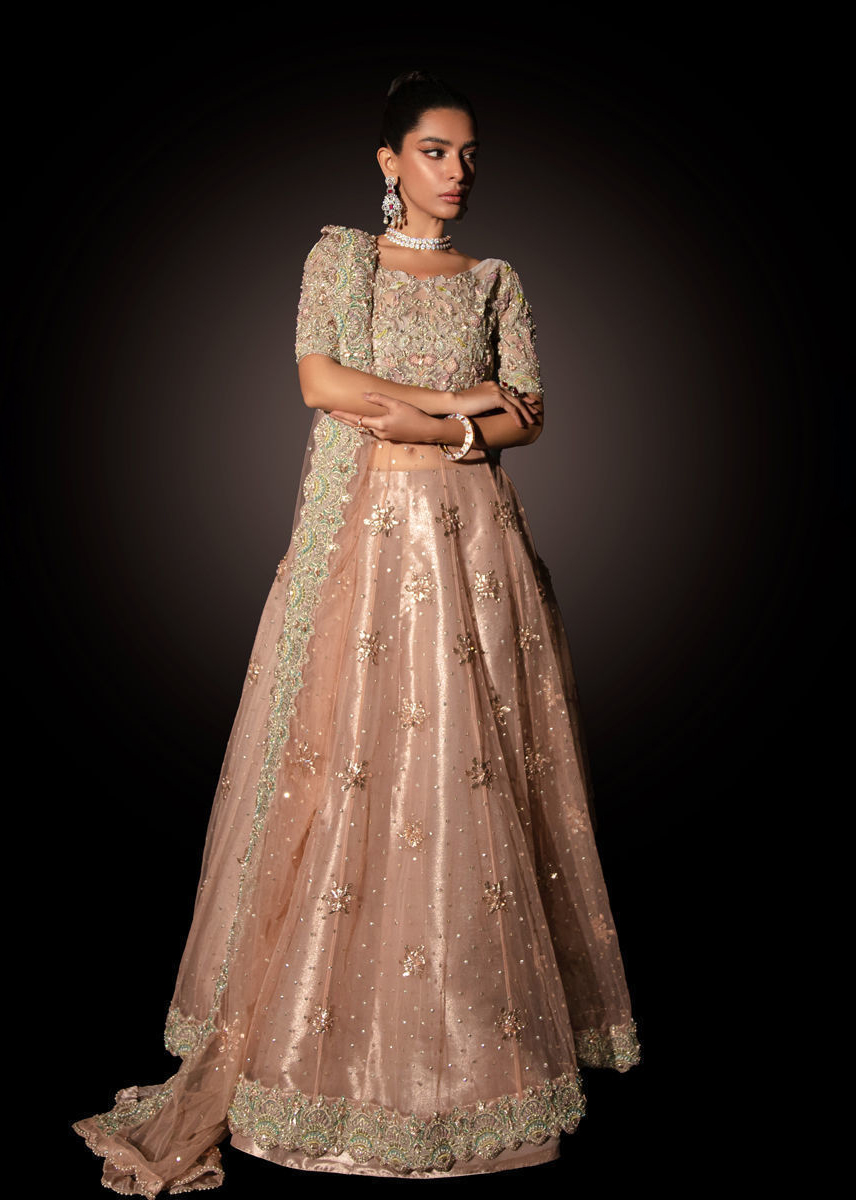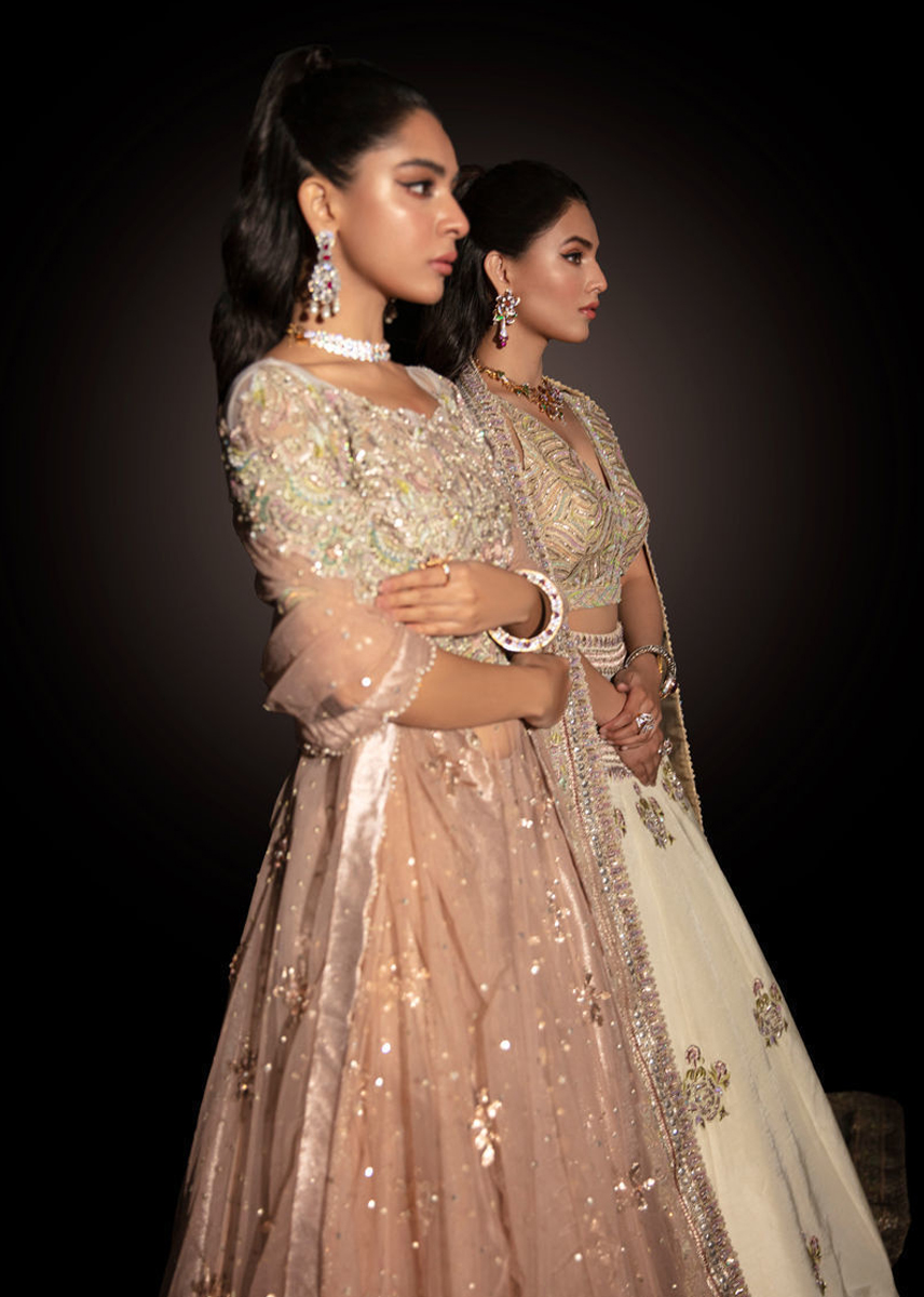 Hand embellished peshwas with delicate zardozi, dabka, resham, tilla, crystal, daimonte , gota and cutdana work all over the bodice and border along with heavy sitara spray and gota motifs on the kalis.Paired with a net dupatta with ghana sitar spray, gota motifs and hand embellished border one side of the dupatta and pearl and crystal scallops on rest three sides. The peshwas is paired with organza lame lehnga.