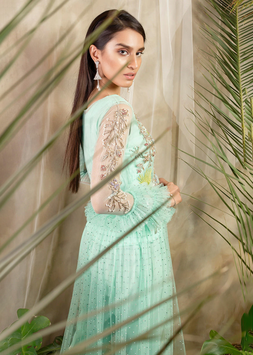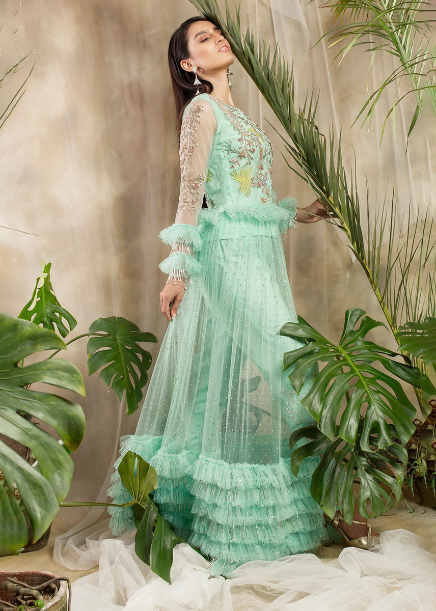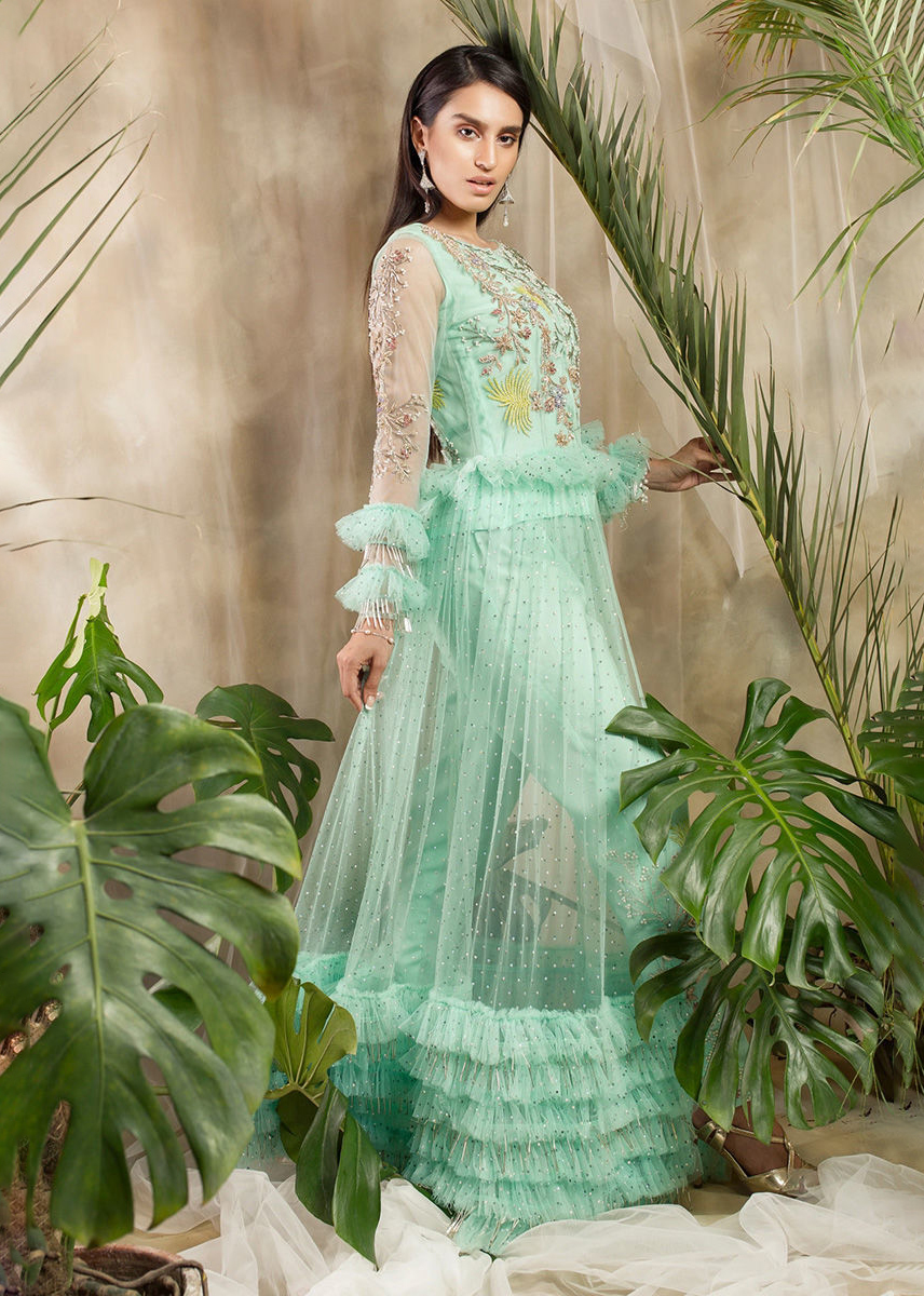 Sea Green tulle gown with intricate hand embellished bodice and tulle frill detail hem, paired with ailk blouse and pants.