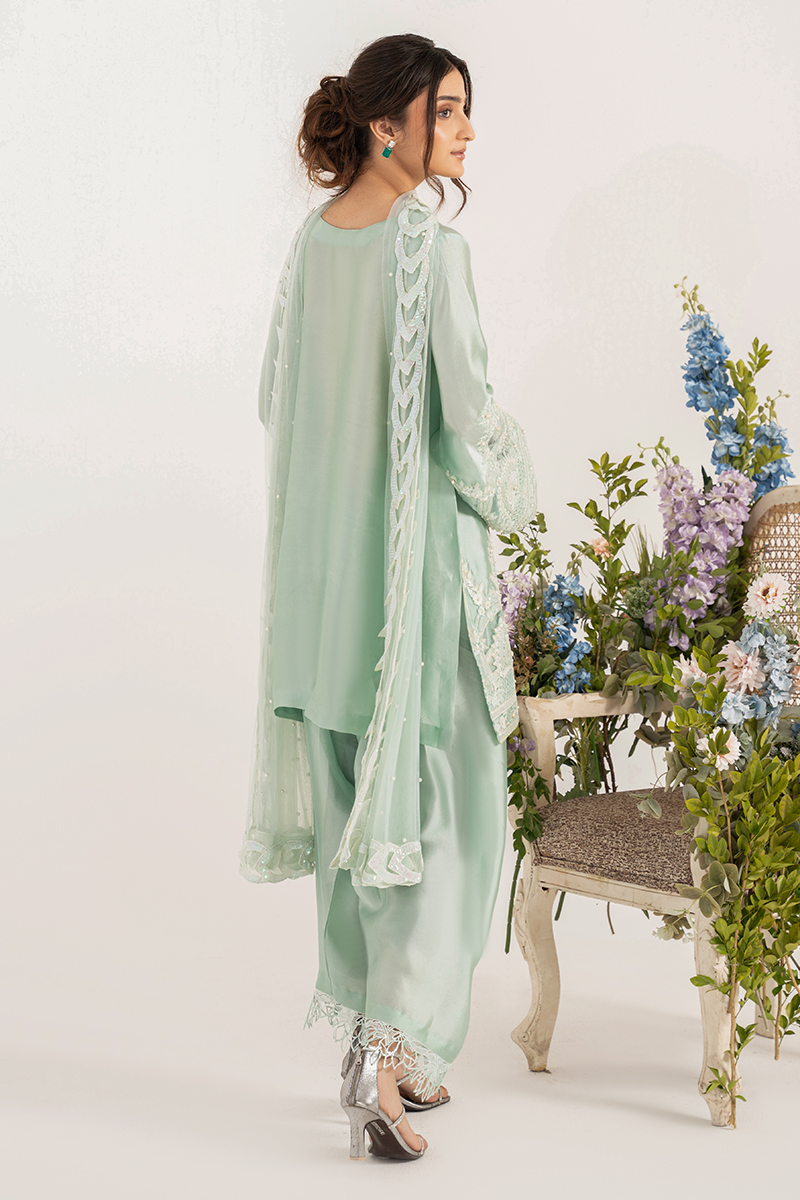 A classic mint Sheesha Silk shirt with an intricate cutwork border and sleeves with subtly shimmering silver work embellished with Swarovski, pearl, cut dana, crystal, and silk French knots. Pair it with a striking dupatta with intricate sequin cutwork on the borders and pearl spray all over. Complete your outfit with our Sheesha Silk shalwar with a sequin embellished cutwork hem (as shown) to feel instantly dressed up. Styled with high heels, gold jewels, and a high ponytail you have an eternally stylish look