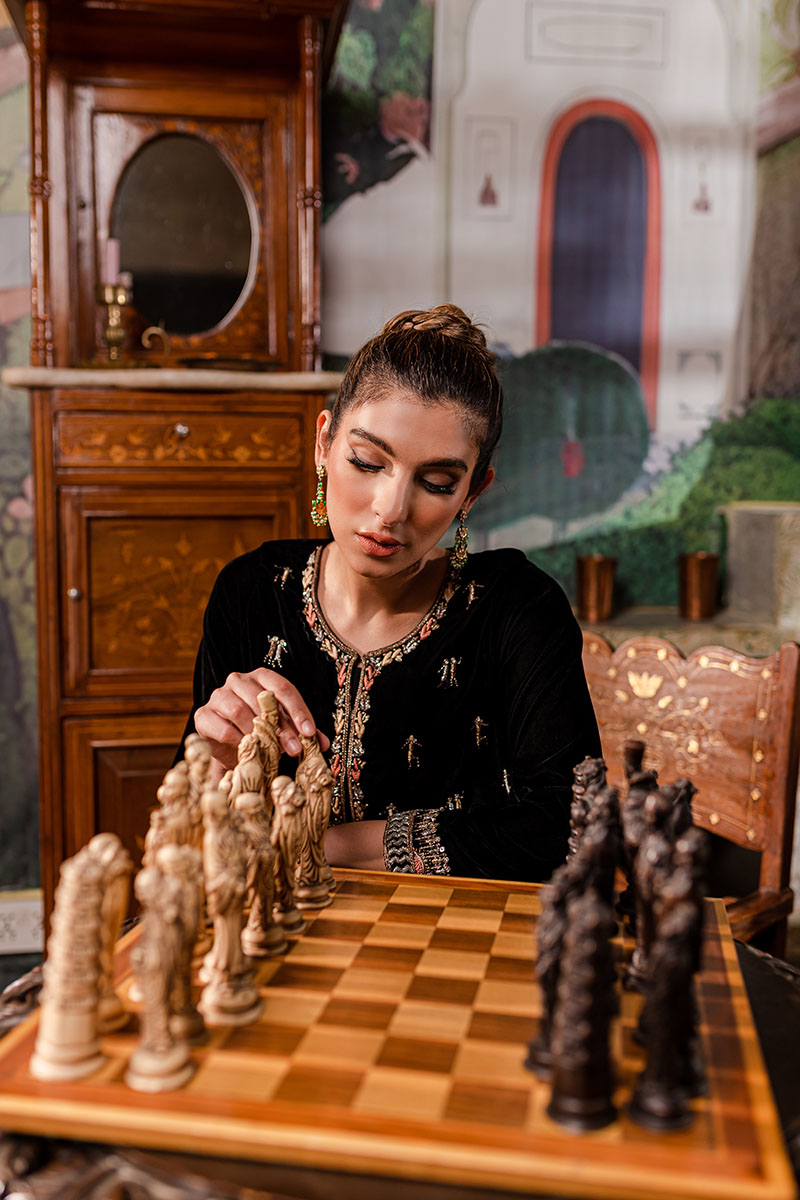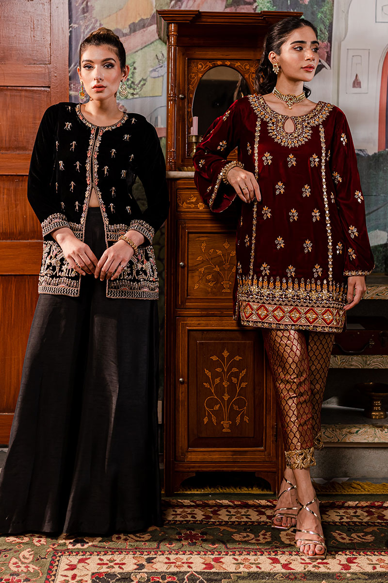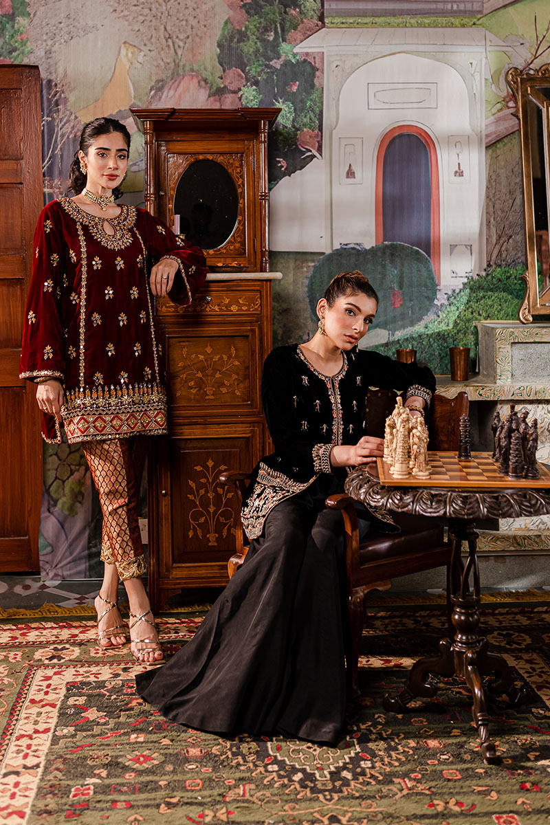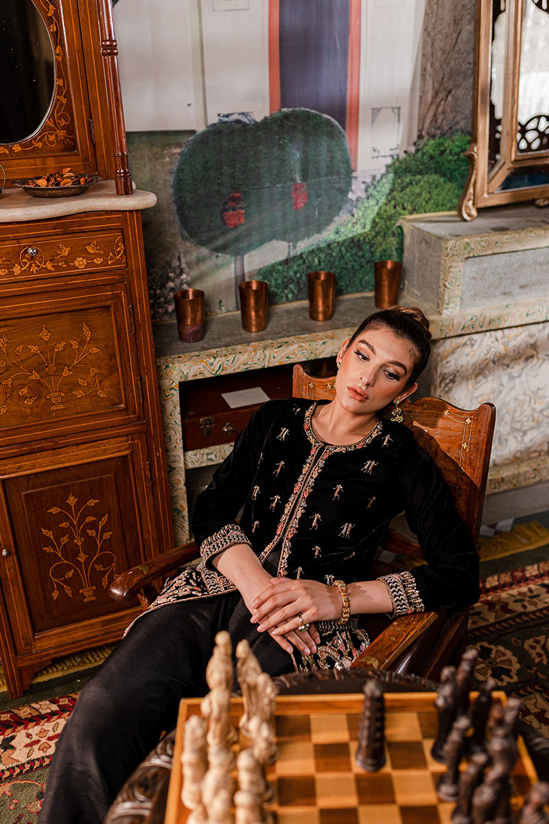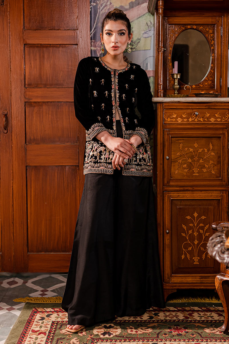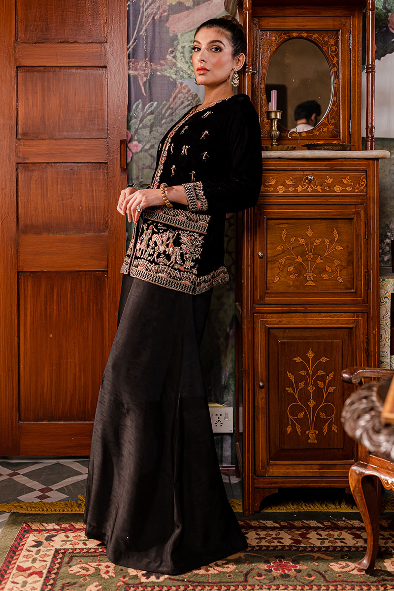 A nod to modern day glamour with the Mira ensemble, perfect to carry you from day weddings to night festivities. Stand apart in hand embellished tantalizing black velvet cut to comfort and flatter for years to come. A stunning romantic ensemble with generously hand embellished jacket with in striking silver and golden work zero size hand work to make your winter festive dressing so chic and stylish. The must have black front open jacket is paired with a black silk blouse. Pair yours with the sleek, aline sharara (as shown for a scene stealing elevated look!!