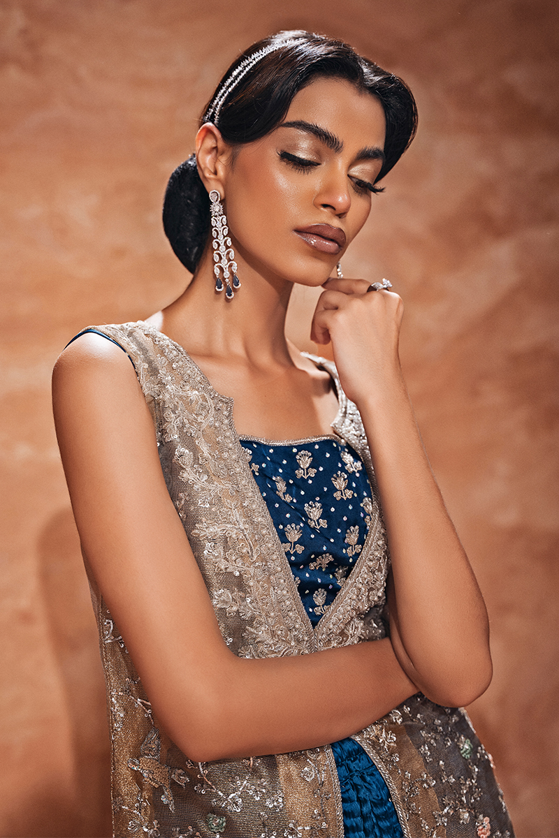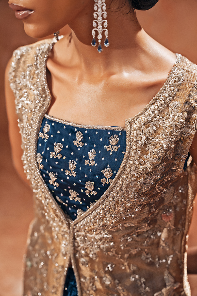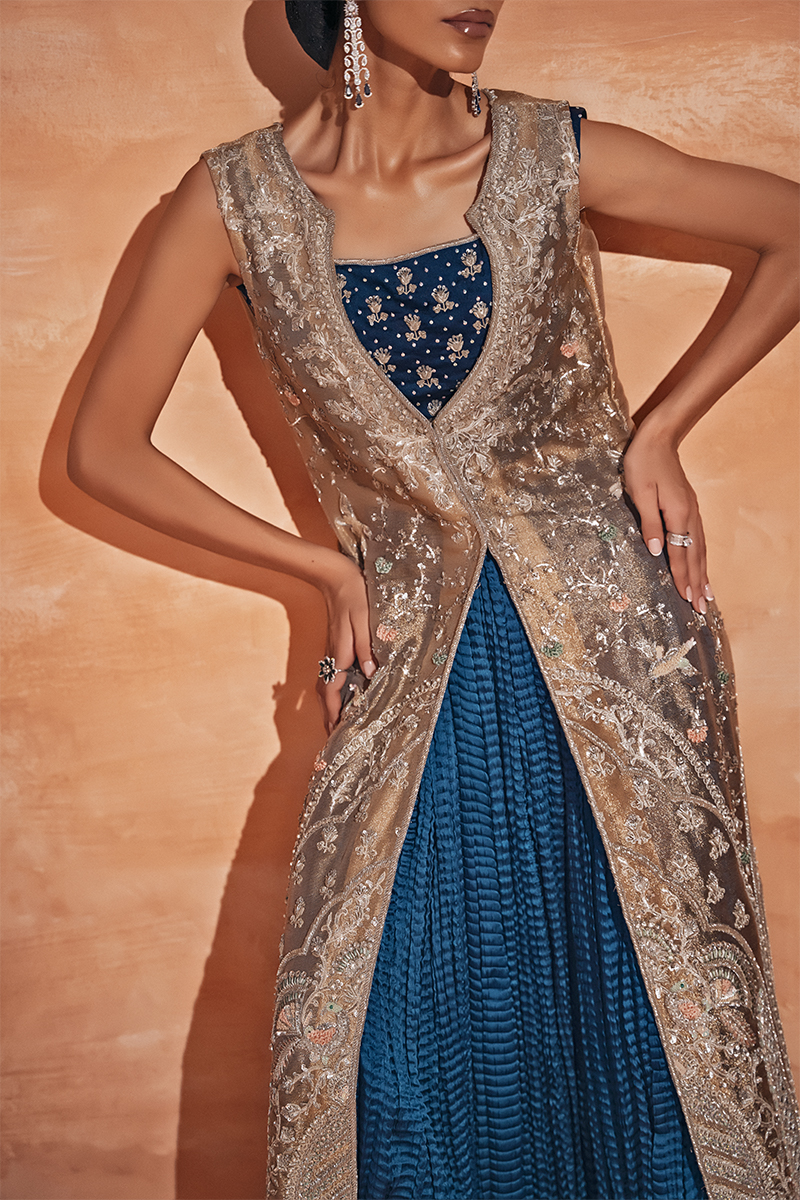 Exude elegance and sophistication in this stunning, hand-embellished Zari Silk front open Jacket, paired with sleek teal silk crushed pants and a beautifully hand-embellished blouse. This ensemble showcases exceptional craftsmanship, perfect for formal events and special occasions.