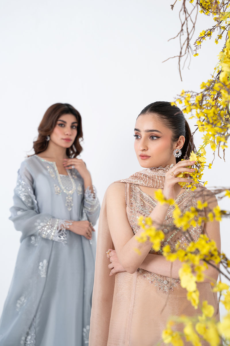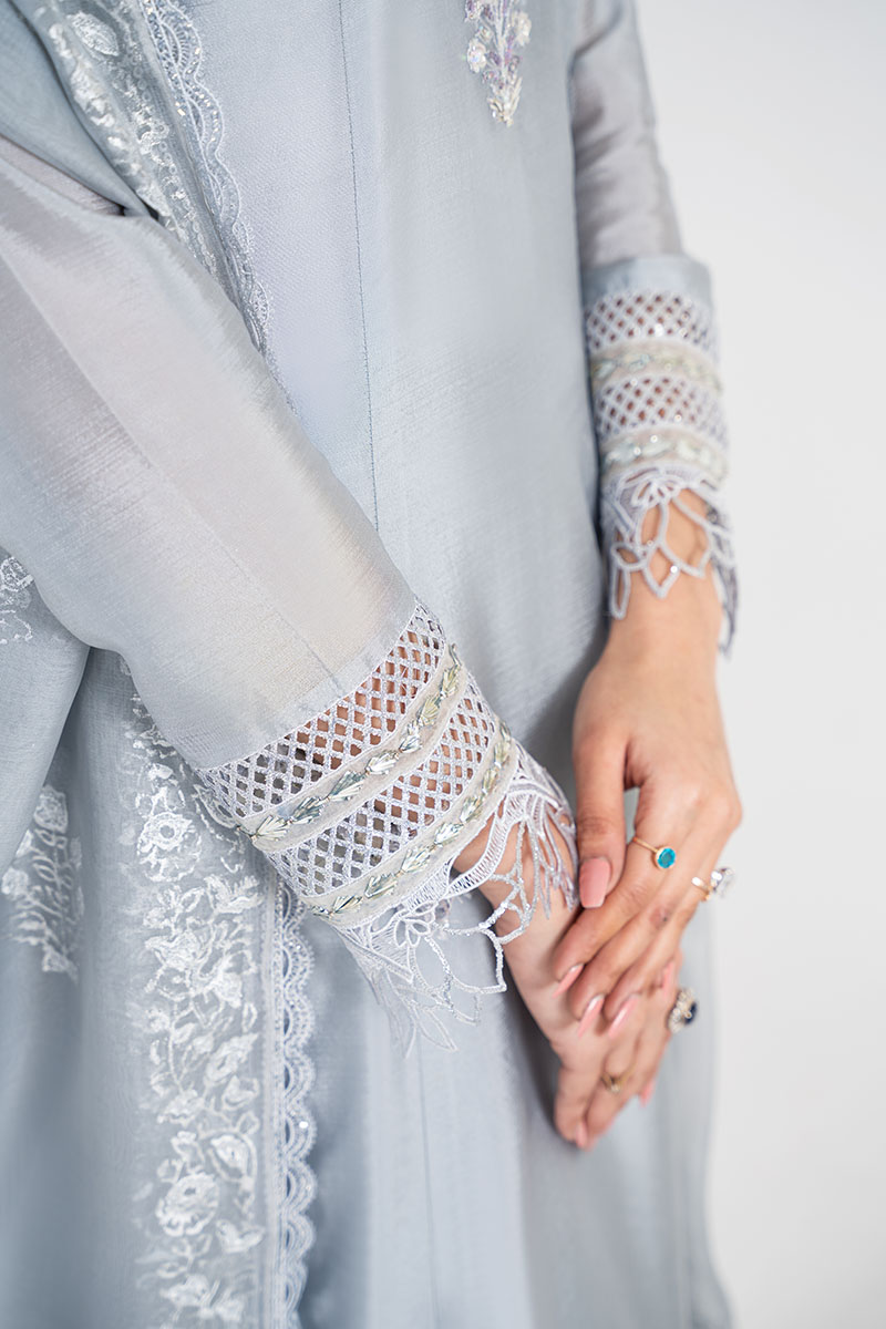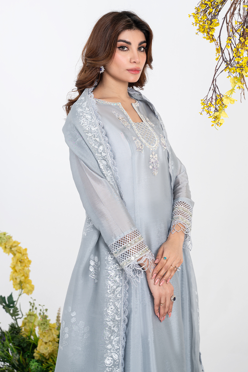 The enchanting ice blue kalidar is an ideal choice for a refreshing summer look. Crafted from breathable Khadi Silk, the shirt exudes elegance and comfort. The outfit is completed with a matching trouser in Cotton Silk, offering a smooth and lightweight feel. The pure organza dupatta adds a touch of sophistication