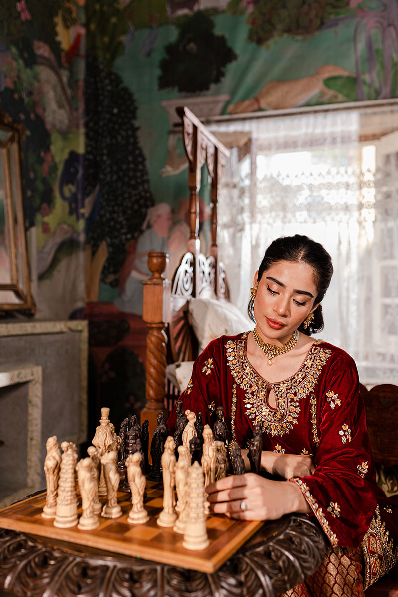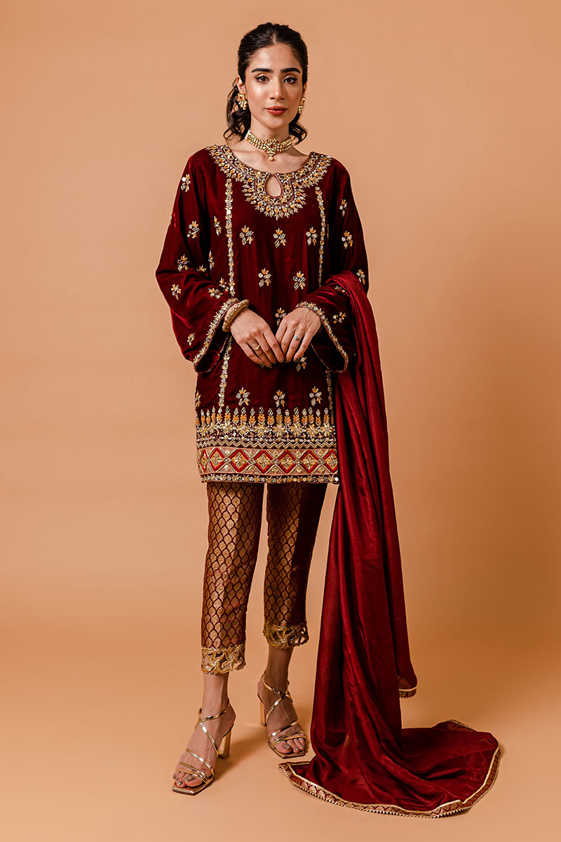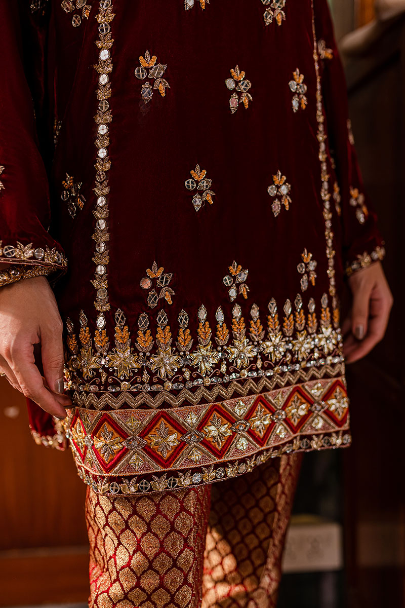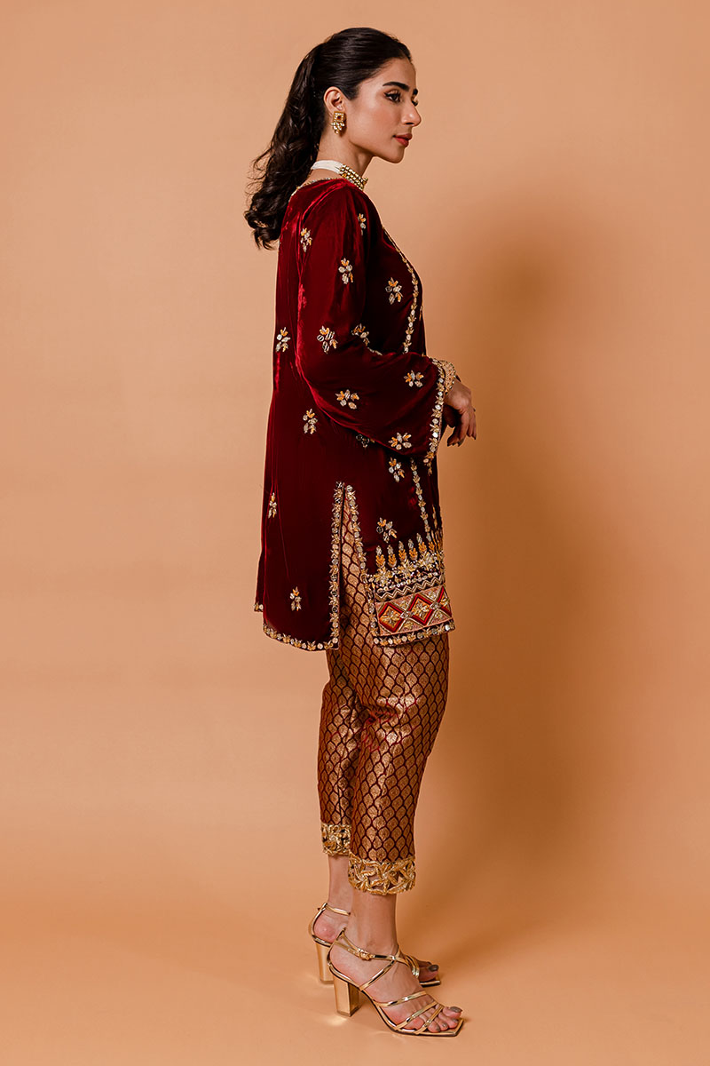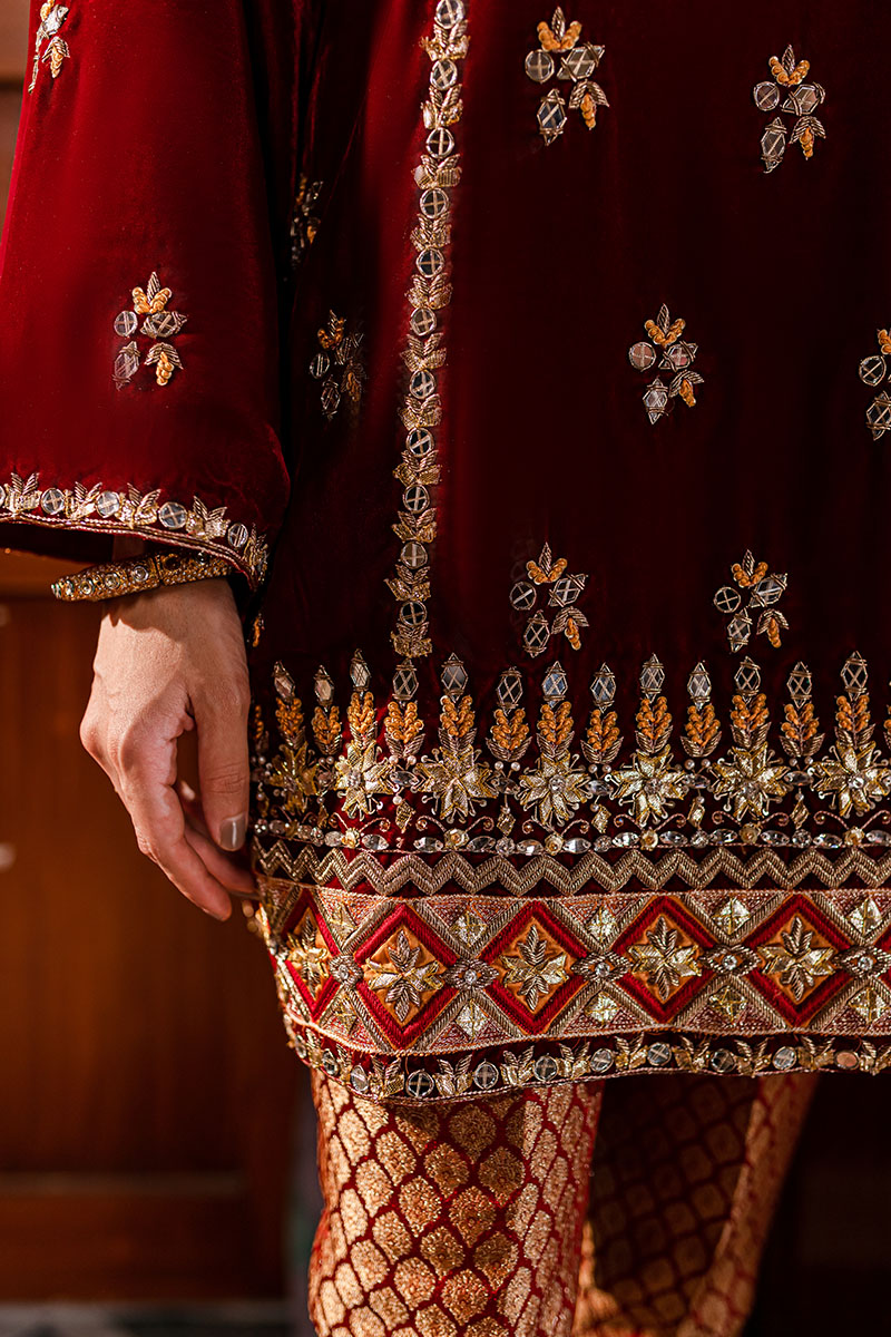 Here to make a statement this wedding season. The Nur kurta, cut from maroon French velvet with breathtakingly beautiful hand embellished key whole neckline with heavy zardozi, crystal, Swarovski, gota, sheesha and French knot detailing along with scattered gota, sheesha and zardozi motifs all over along with a heavily embellished hemline reflects light making a heavenly lasting impression. Paired with a jamawar cut work trouser (as shown) and a medium silk dupatta elevated the outfit to new levels. Dress it up with fav hold high heals, investing in a timeless fashion statement lasting years!