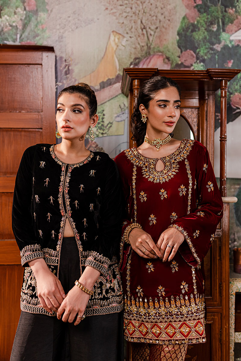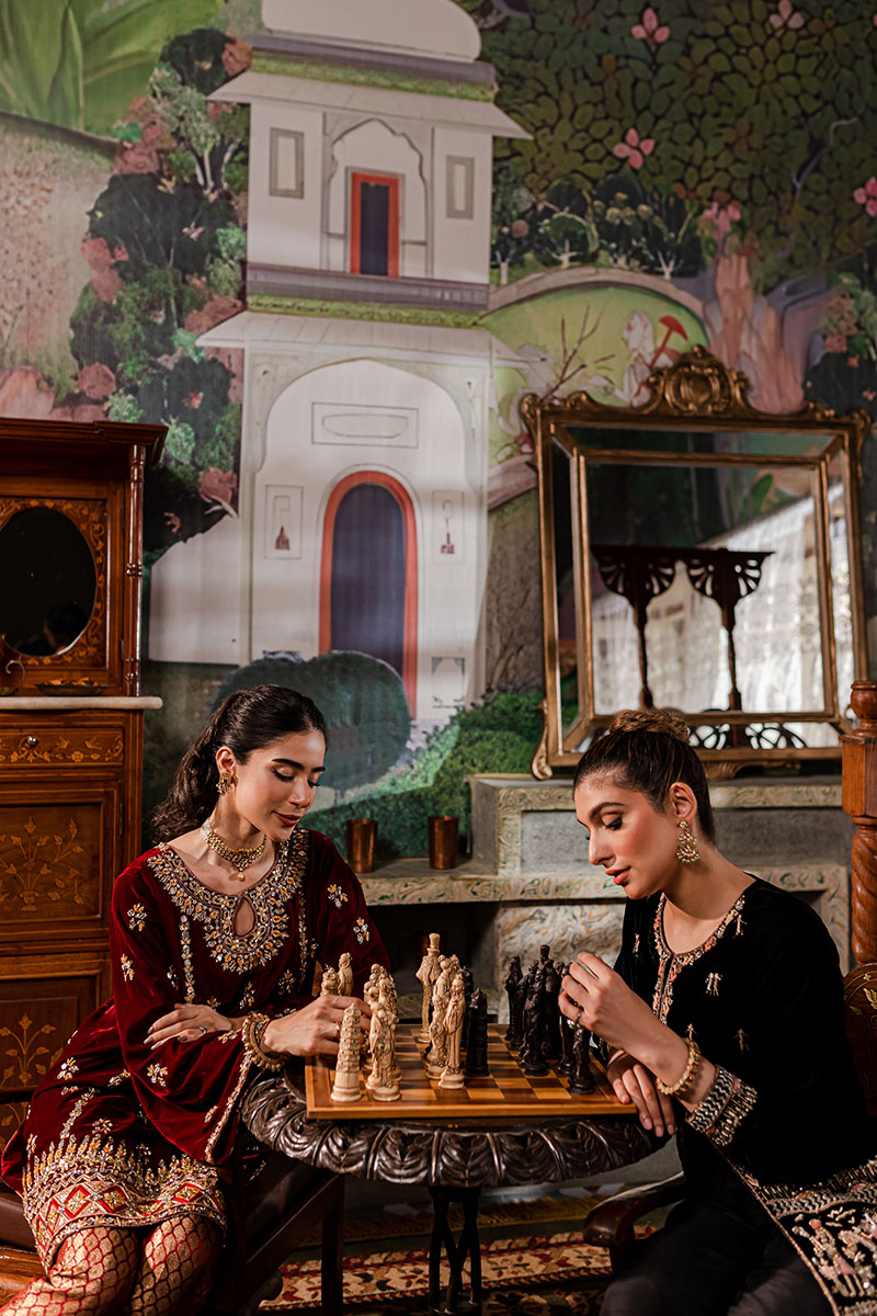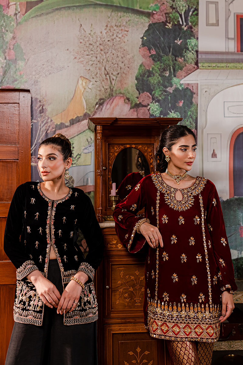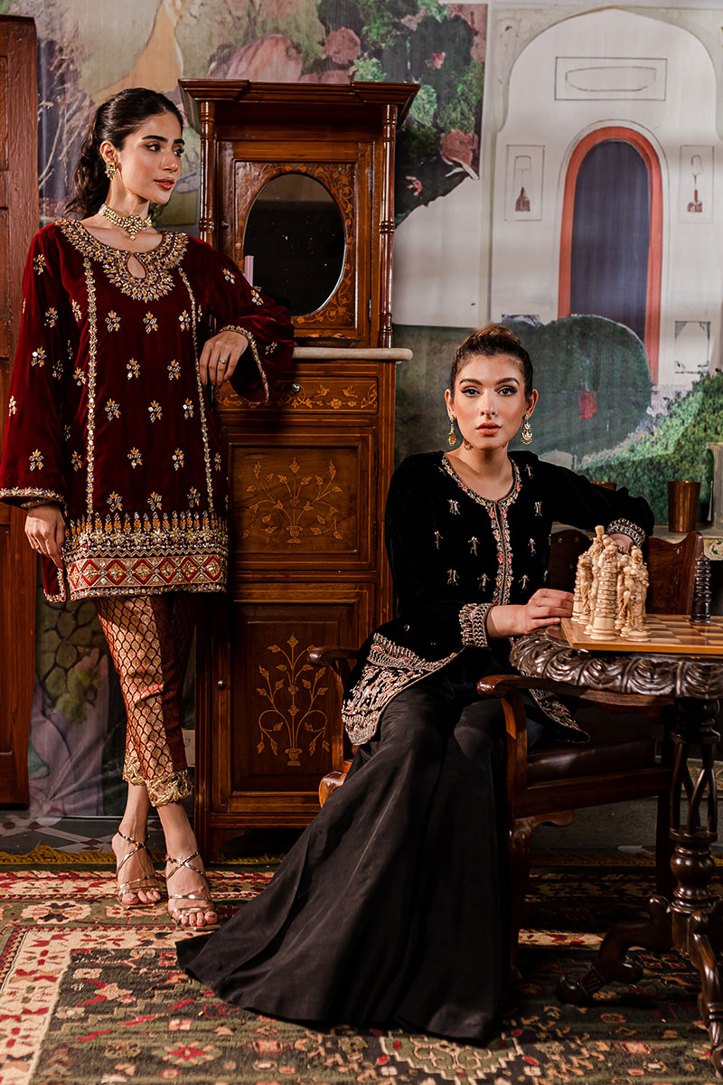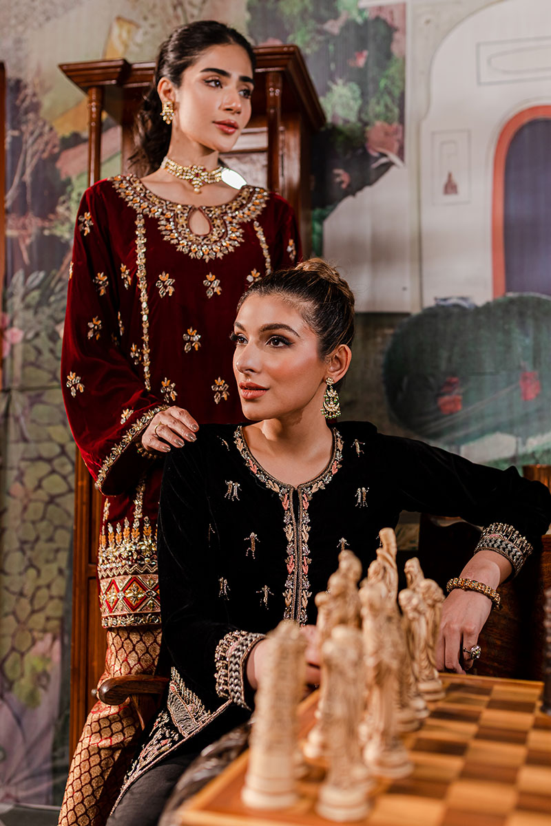 Here to make a statement this wedding season. The Nur kurta, cut from maroon French velvet with breathtakingly beautiful hand embellished key whole neckline with heavy zardozi, crystal, Swarovski, gota, sheesha and French knot detailing along with scattered gota, sheesha and zardozi motifs all over along with a heavily embellished hemline reflects light making a heavenly lasting impression. Paired with a jamawar cut work trouser (as shown) and a medium silk dupatta elevated the outfit to new levels. Dress it up with fav hold high heals, investing in a timeless fashion statement lasting years!