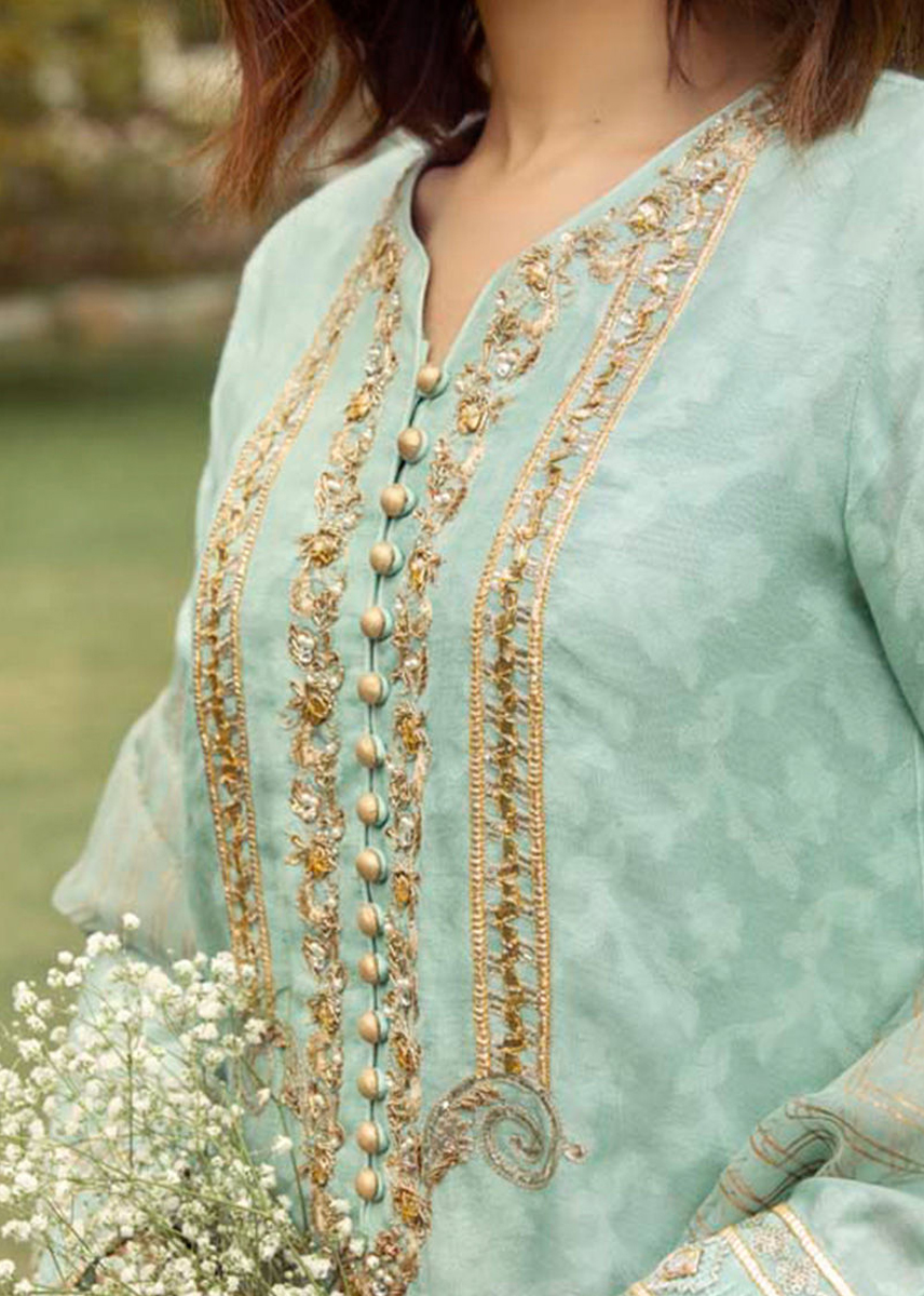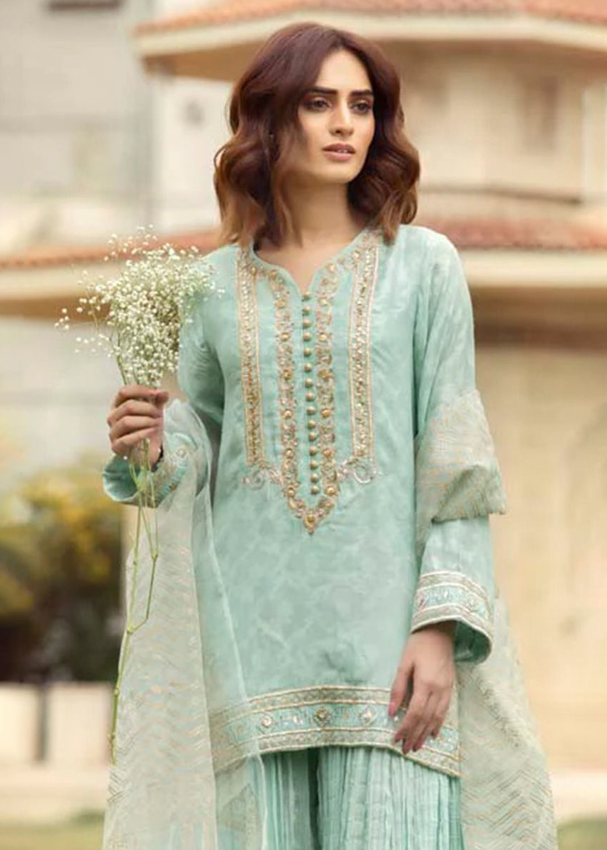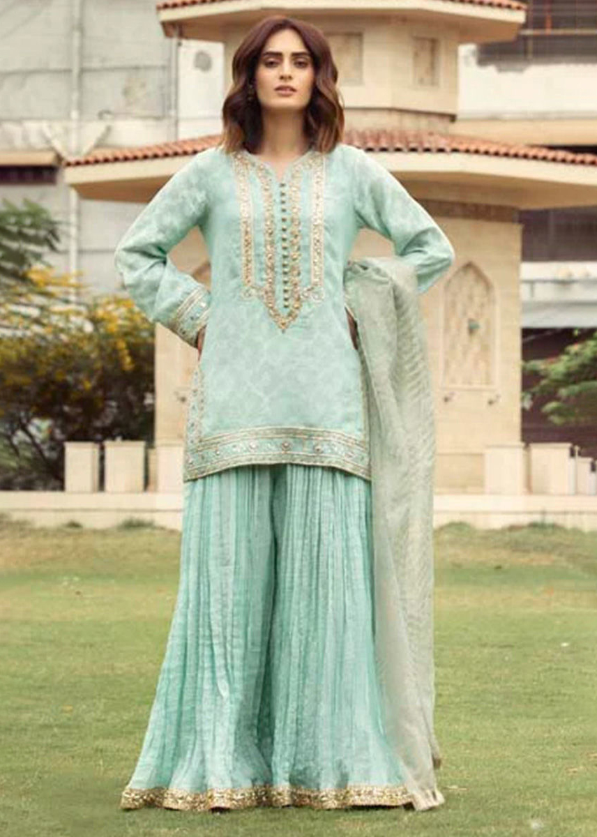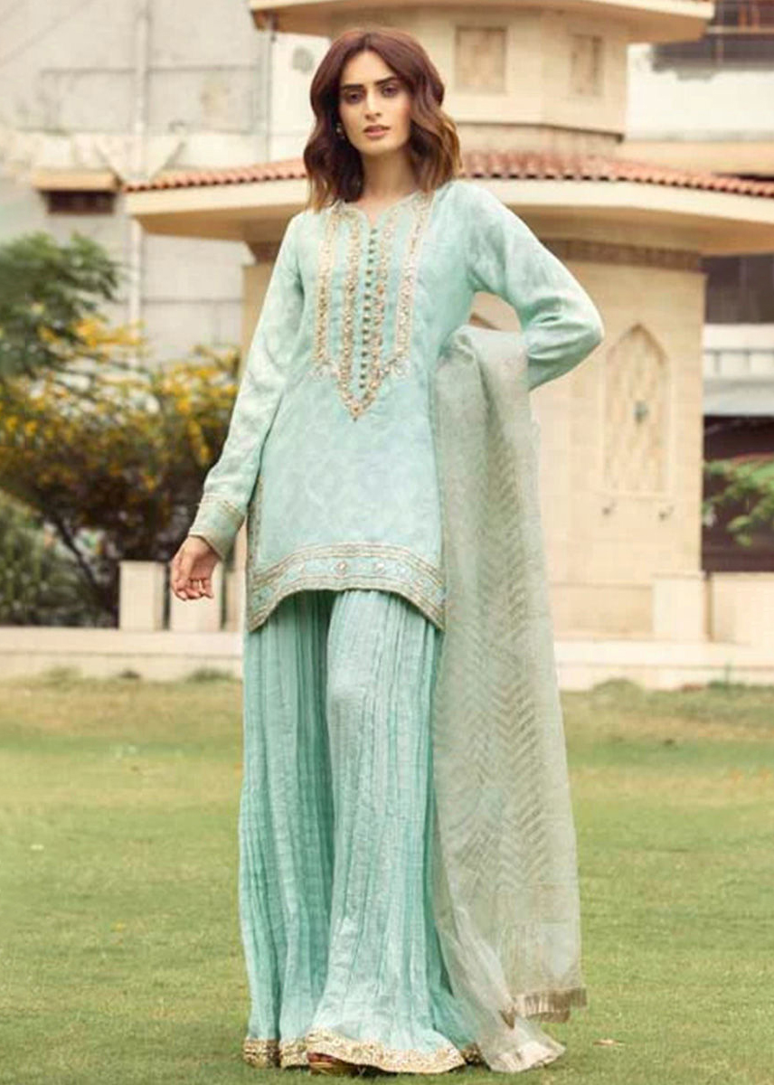 It is cotton net shirt with gota and zardozi hand embellishment paired with an organza block print dupatta and raw Silk crushed pants.
