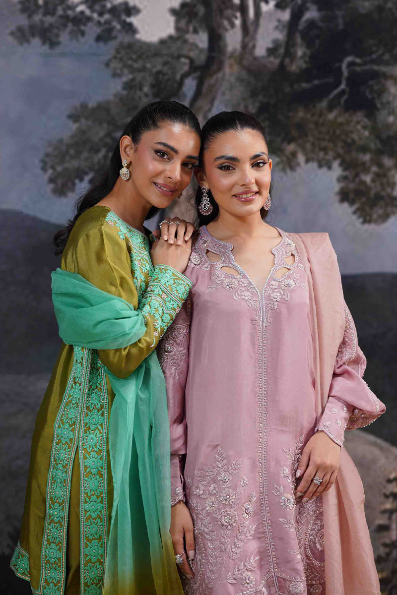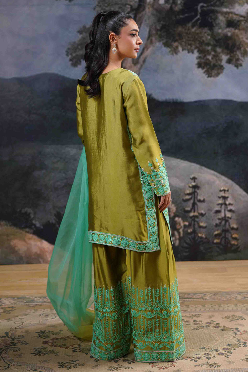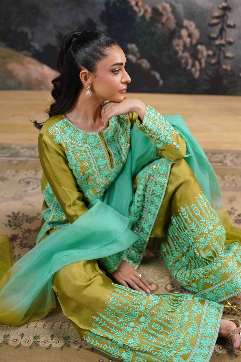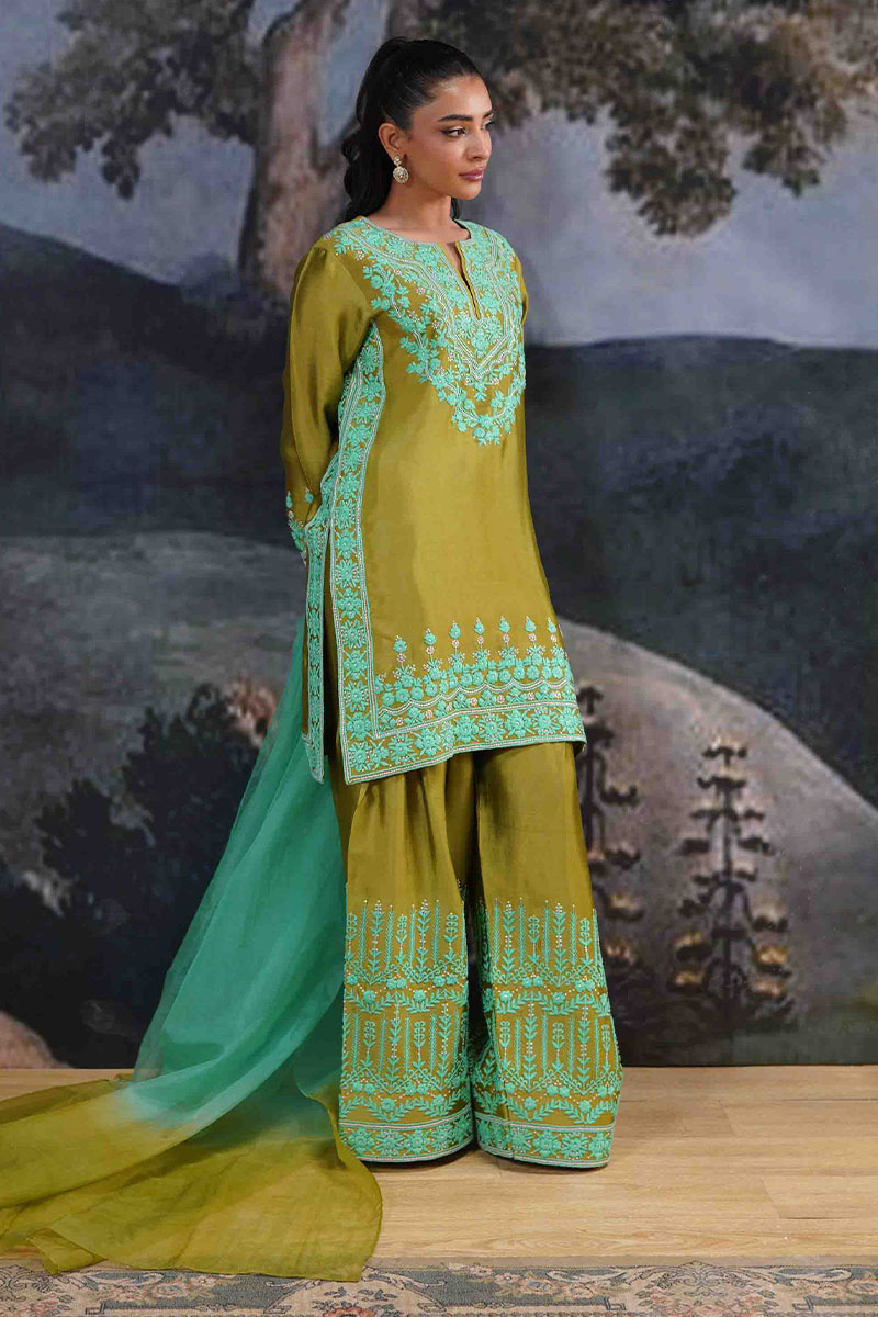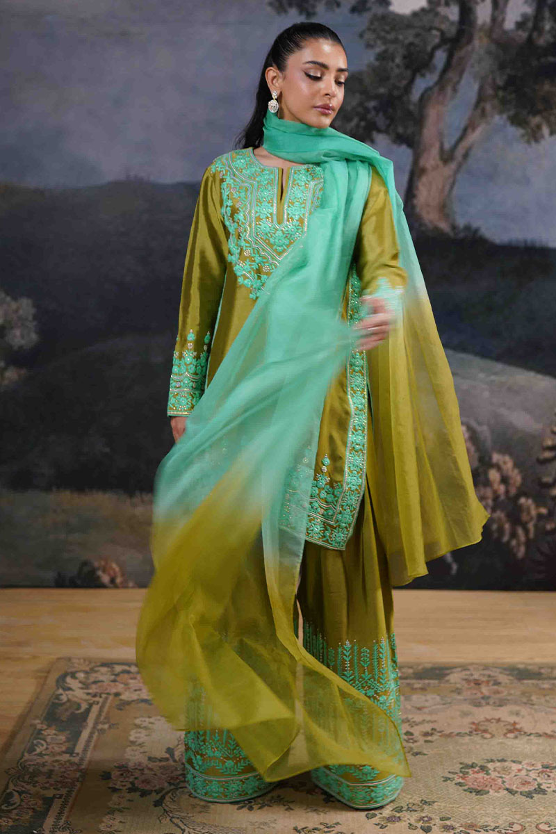 Step into the realm of timeless elegance with this exquisite olive and aqua ensemble. Crafted from rich, lustrous fabric, the kameez showcases intricate threadwork and glistening embellishments, creating a mesmerizing interplay of traditional artistry and contemporary design. The neckline features meticulously detailed embroidery, cascading down into a graceful hemline, while the sleeves are adorned with delicate motifs that echo the classic charm of handcrafted luxury.Paired with voluminous, wide-legged shalwar featuring symmetrical, floral embroidery, this outfit embodies sophistication and grandeur. The flowing, ombré aqua dupatta, with its soft, ethereal hues, adds a refreshing contrast, making this ensemble perfect for grand festivities and opulent gatherings.