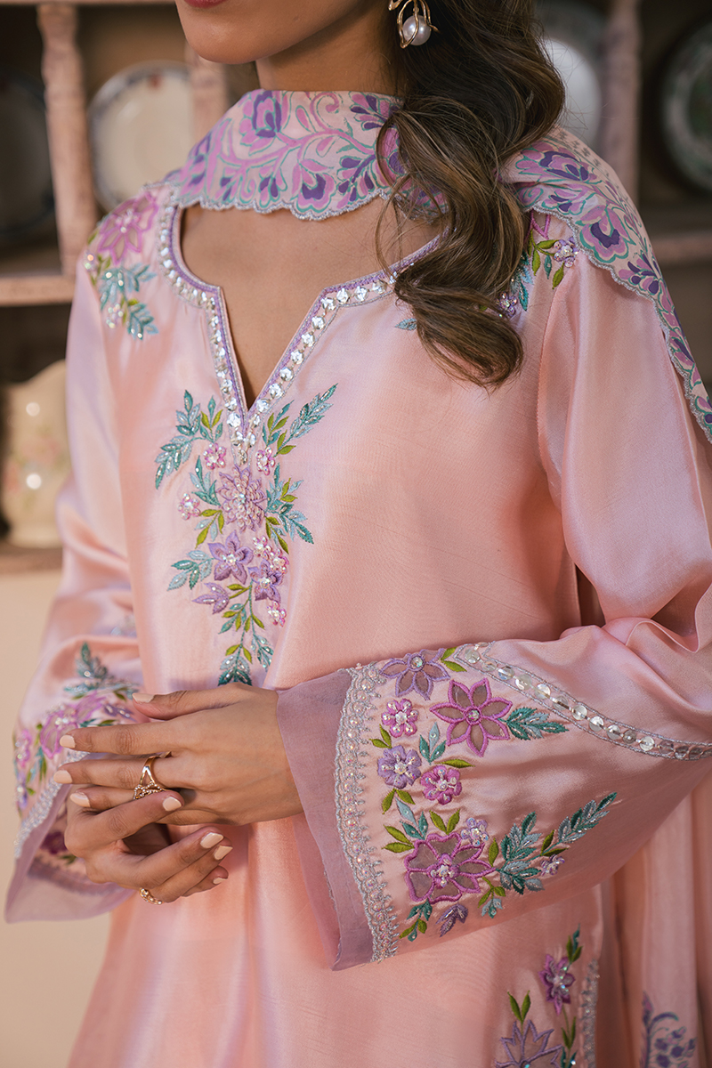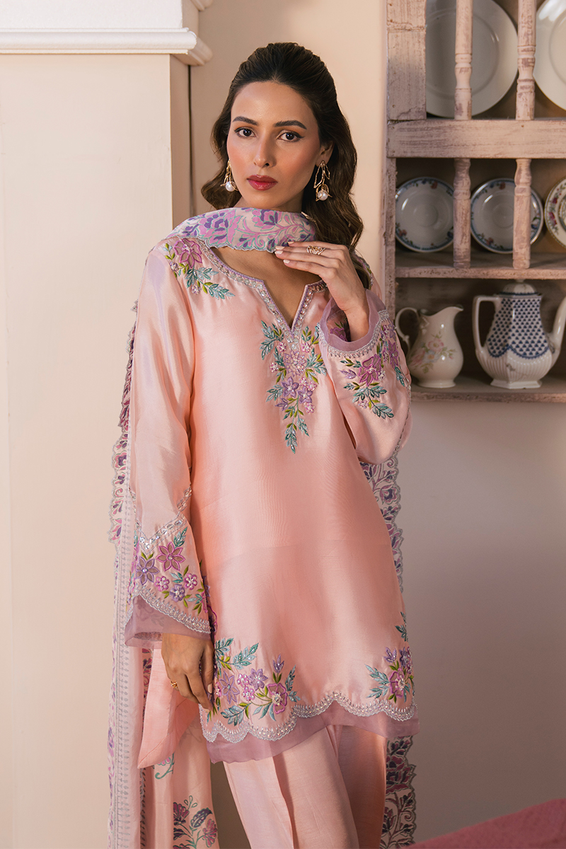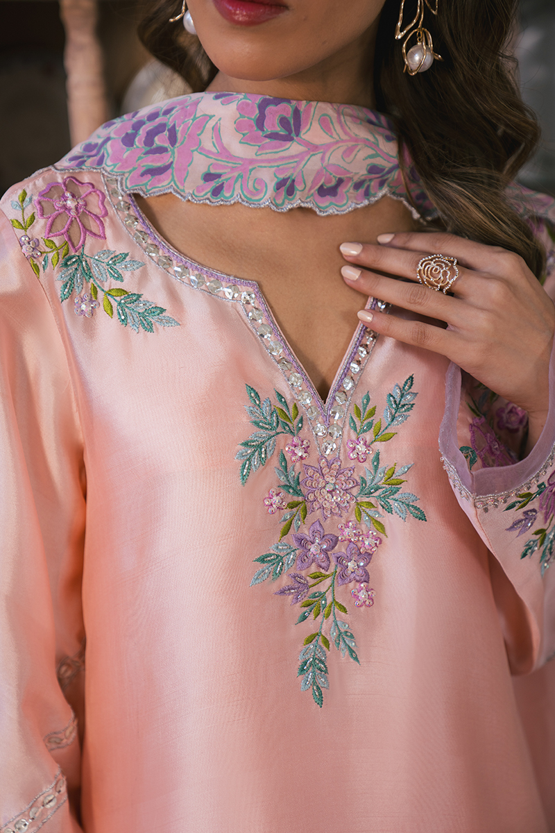 A stunning ensemble featuring a tissue silk embroidered shirt with delicate floral and geometric motifs for an elegant touch. The silk block-printed dupatta adds vibrance with traditional patterns and the fine edging.