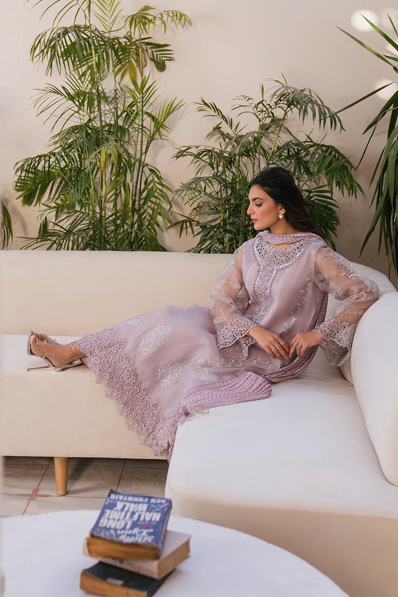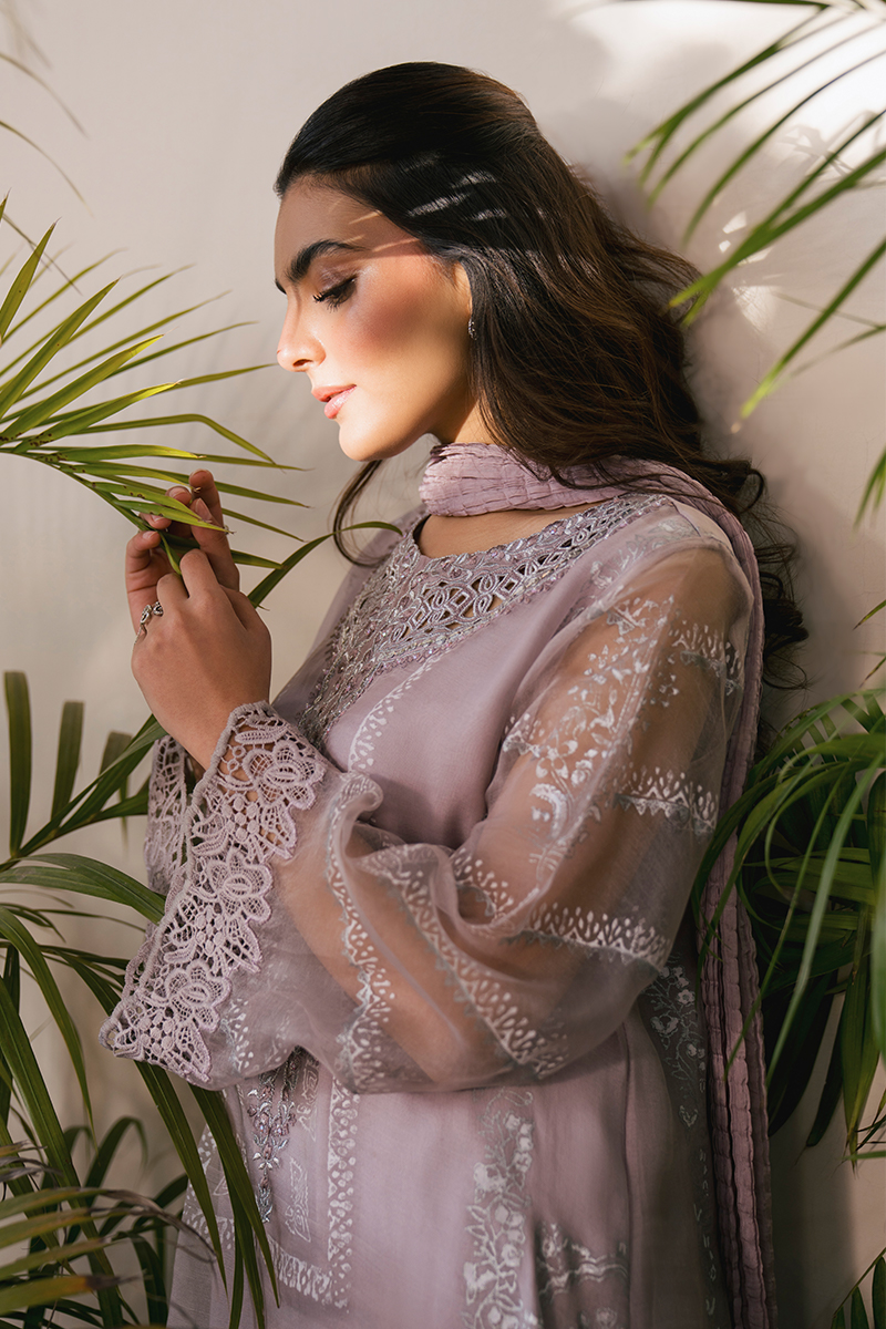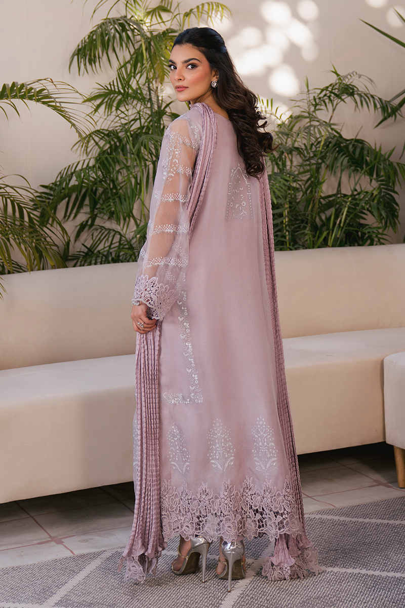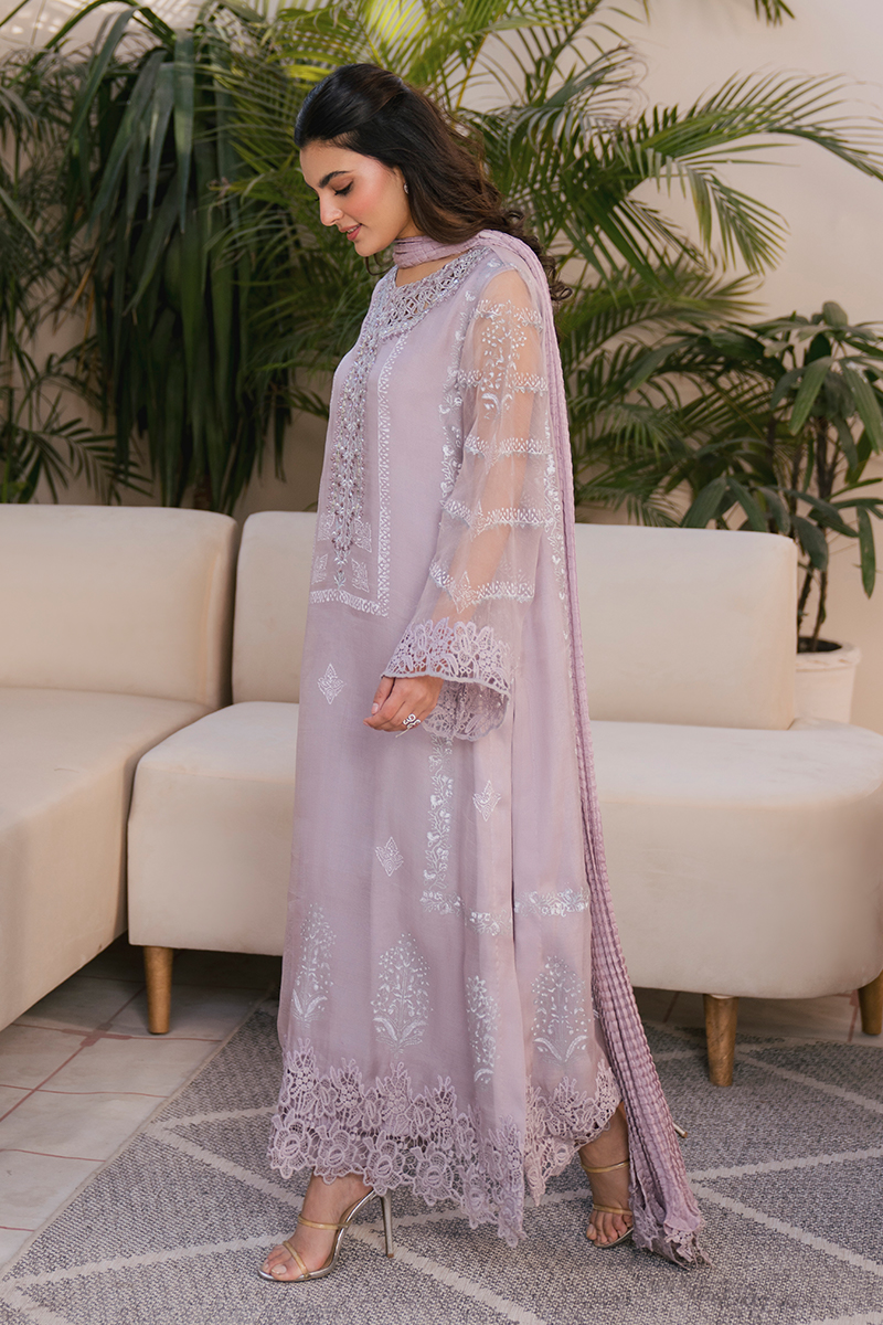 Lilac organza shirt featuring block print and delicate embroidery, paired with a silk dupatta. adorned with embroidered side borders and complementing silk trousers.