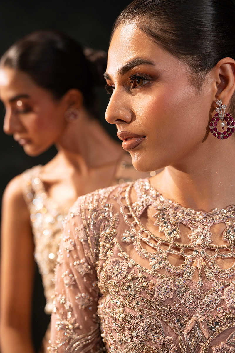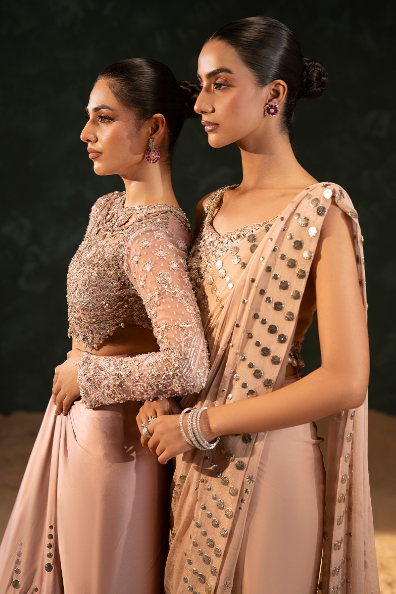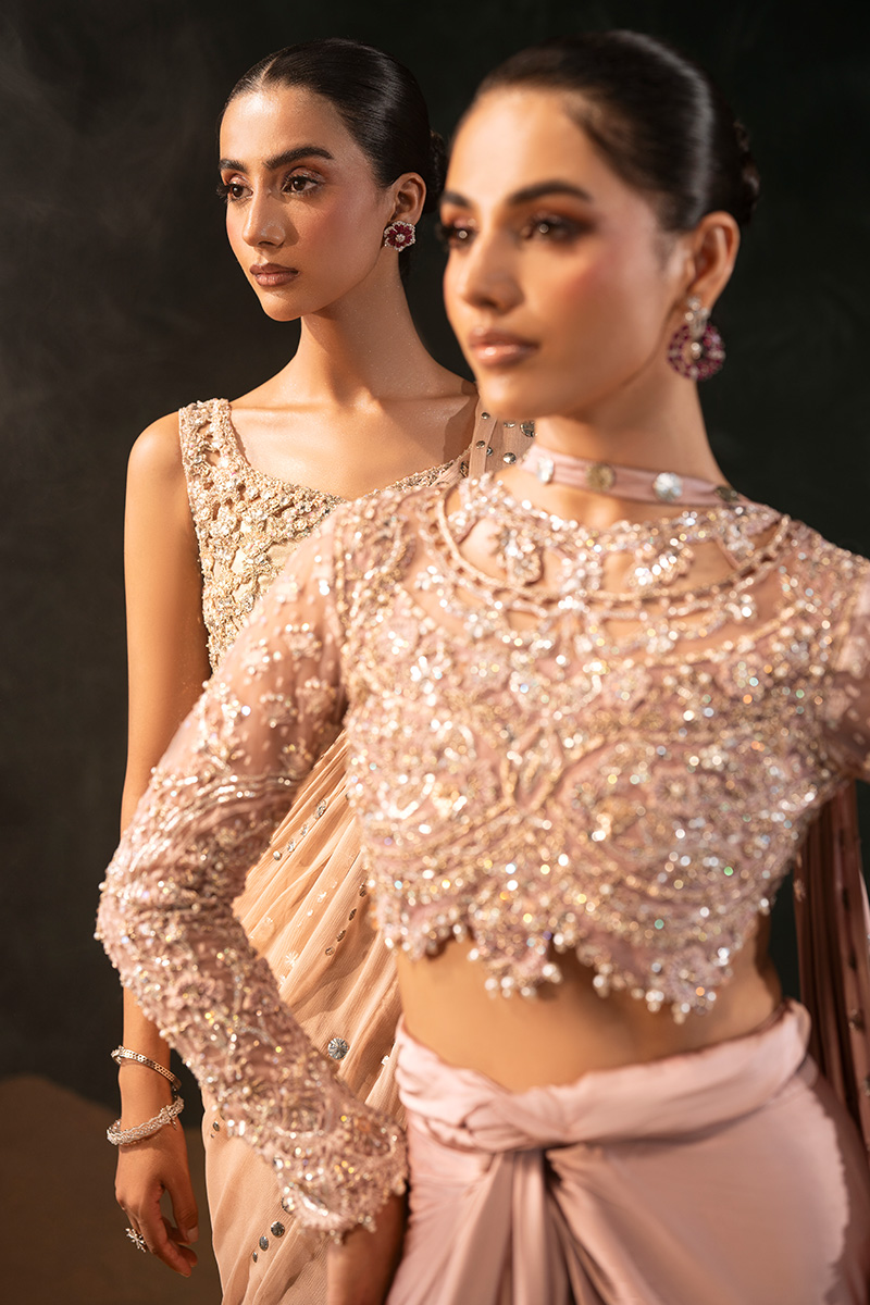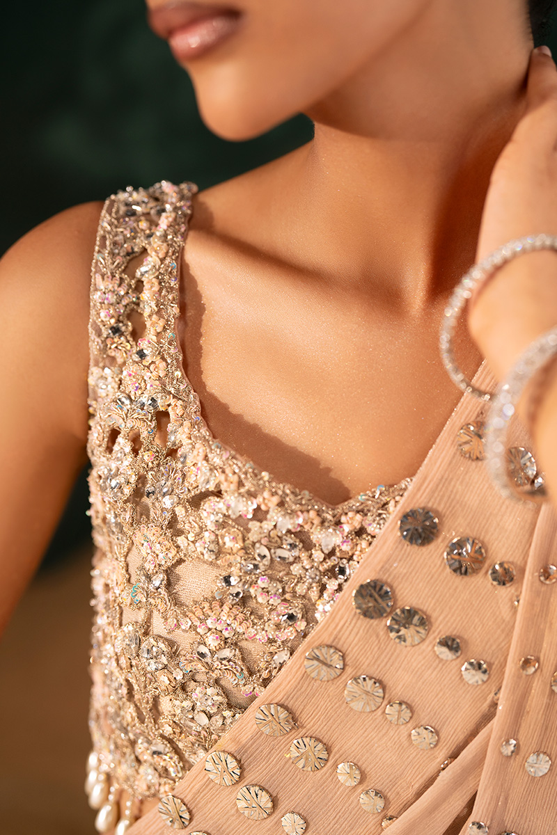 This elegant peach saree ensemble features a sleeveless blouse with a scoop neckline, crafted from intricate floral-patterned cutwork and lined with silk for structure and comfort. The embellishments include rhinestones, crystals, pearls, nakshi dabka, fine tilla embroidery, and scattered sequins with zero-size sitara that lend a soft shimmer. A delicate row of dangling pearl beads along the edge adds graceful movement and charm.The pure chiffon mukesh saree is traditionally draped over a patti coat, creating a layered and voluminous silhouette. Its flowing pallu and subtle sparkle enhance the ensemble’s ethereal elegance—perfect for festive and formal occasions.
