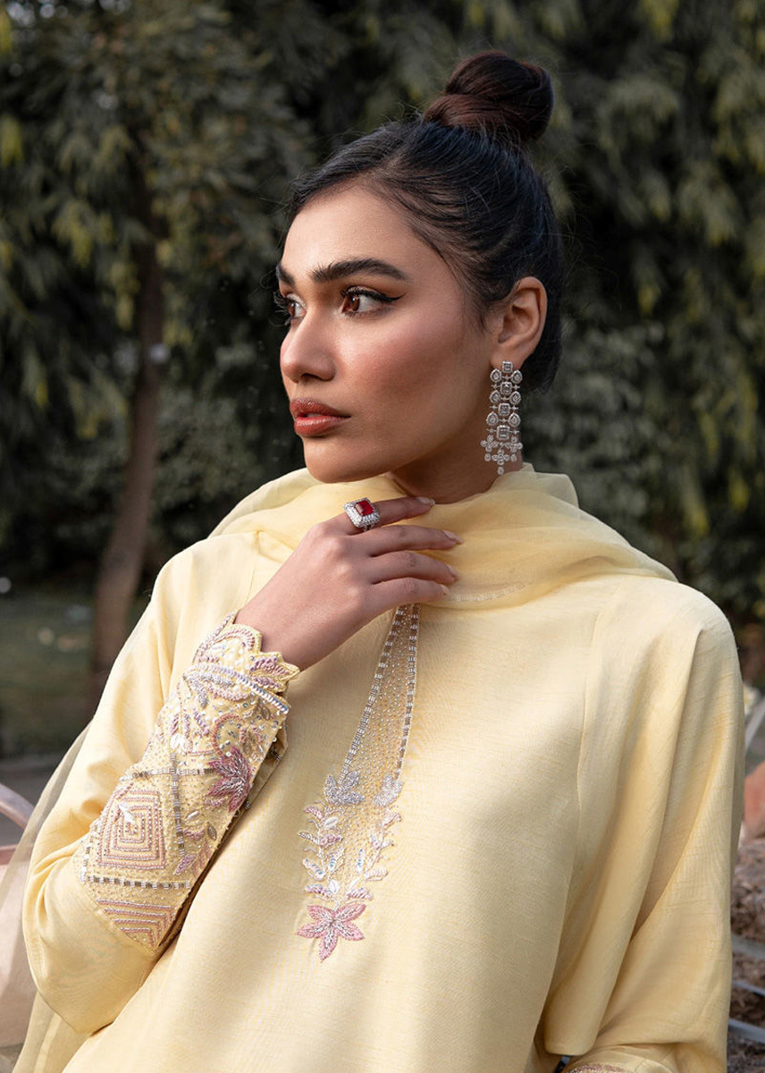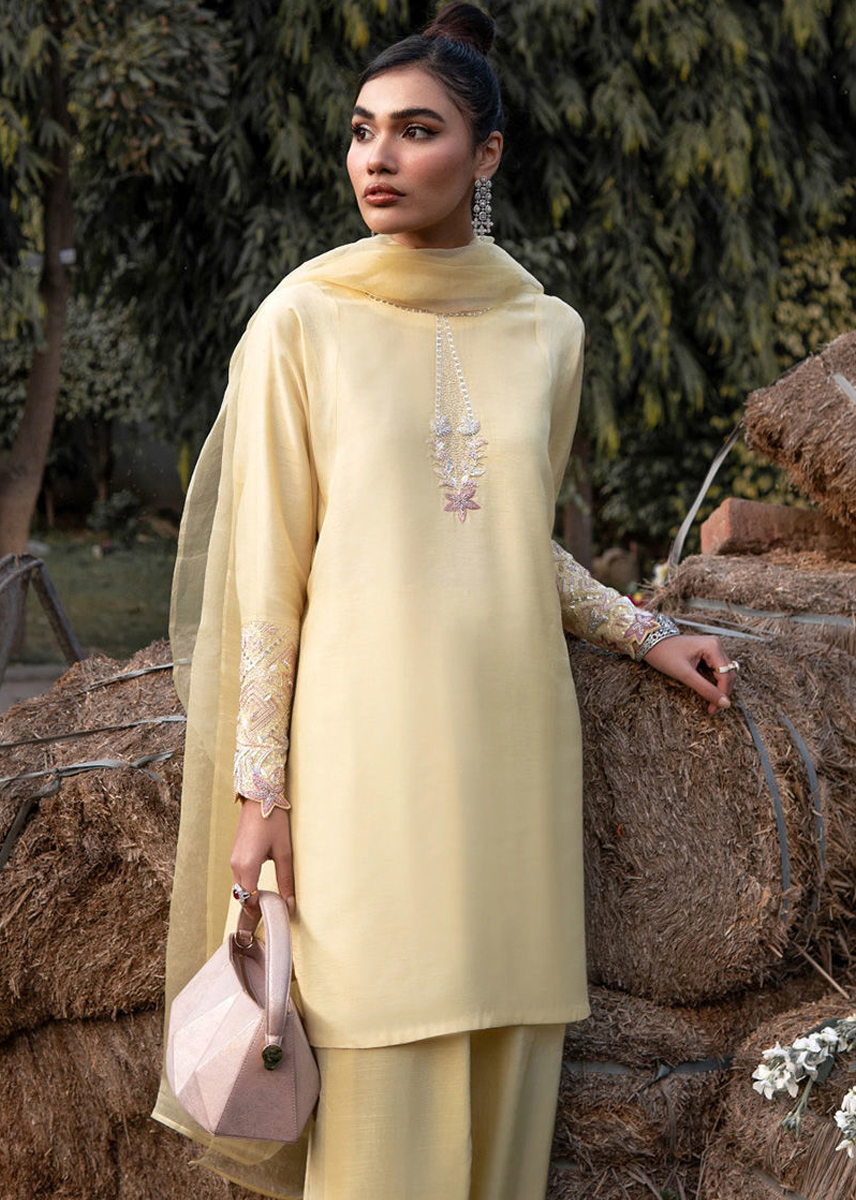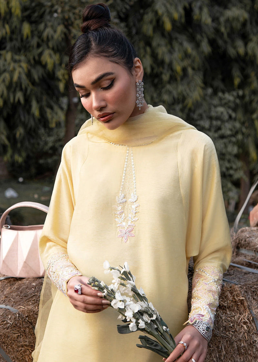 Pastel yellow batwing rawsilk shirt with an intricately embellished neckline and cuffs. Paired with a cullote and organza dupatta.