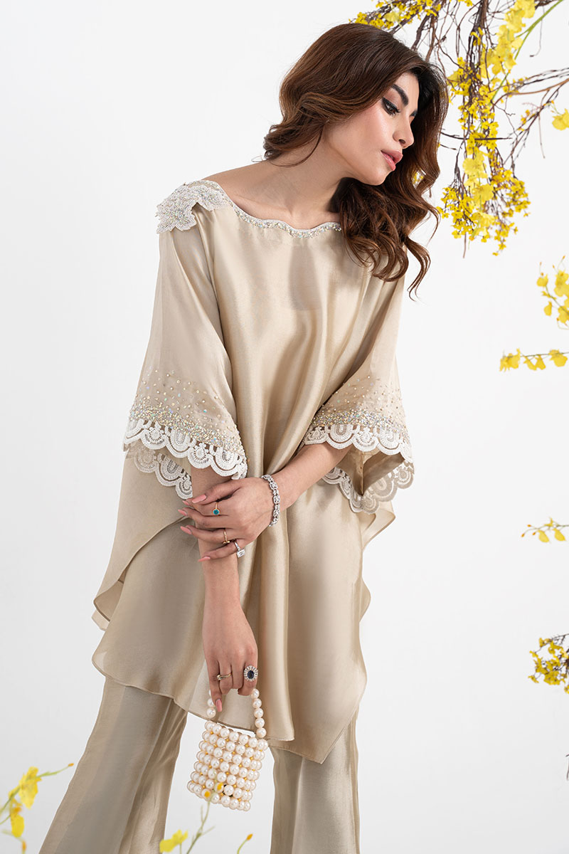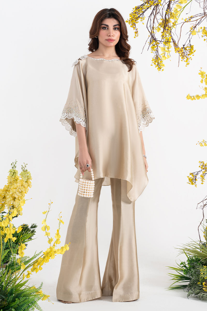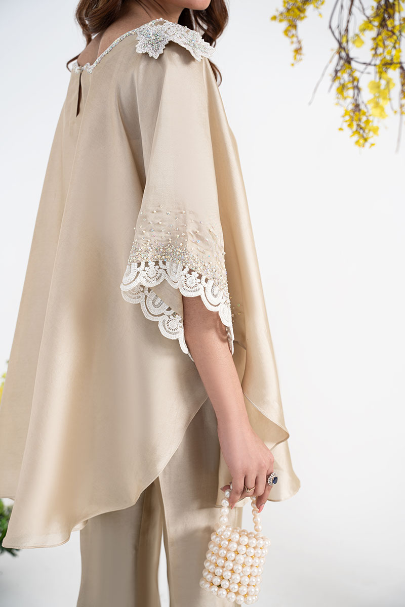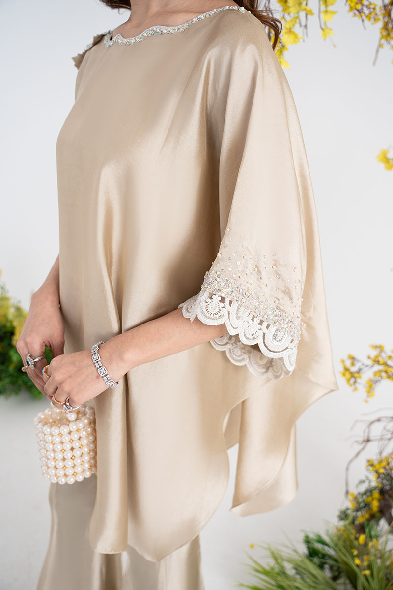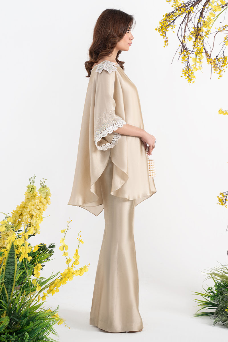 The exquisite Sheesha Silk kimono cape with glimmering hand-embellished neckline and statement gradient embellishment on sleeves is the perfect day-to-night outfit. Paired with a Sheesha Silk boot cut. Whether it is lunch or a formal evening out, the outfit can be dressed up and dressed down to make a gracefully modern-day style statement.