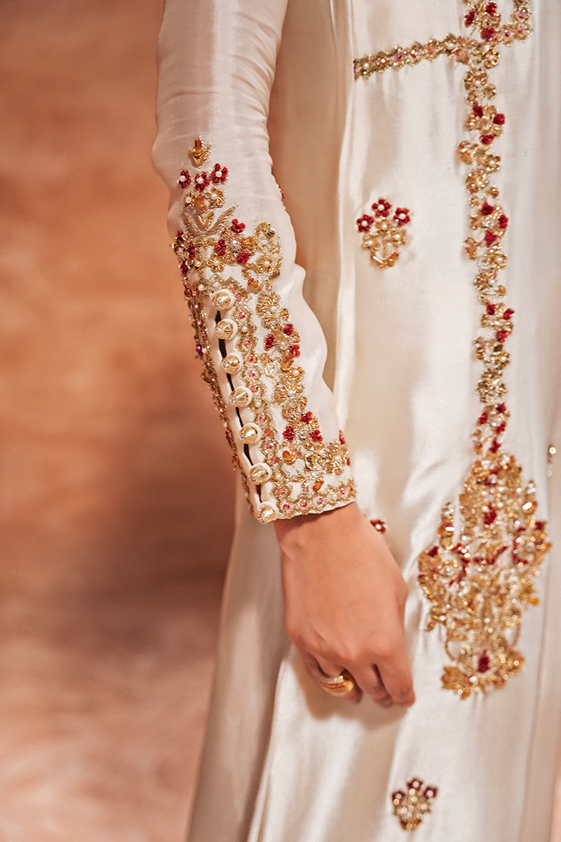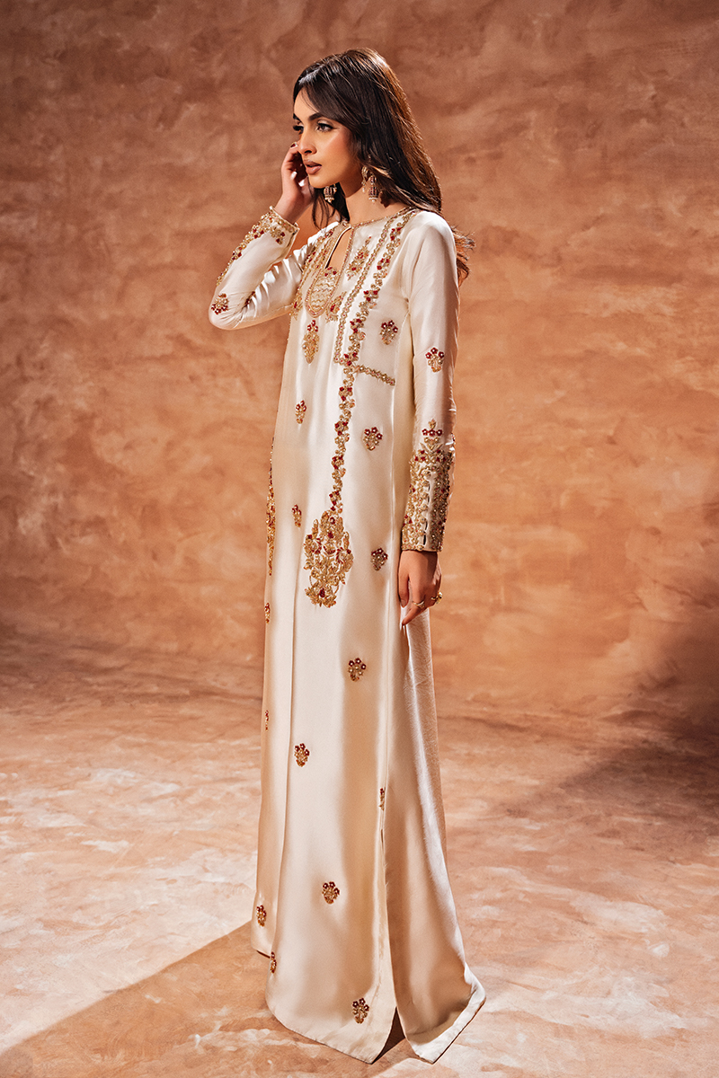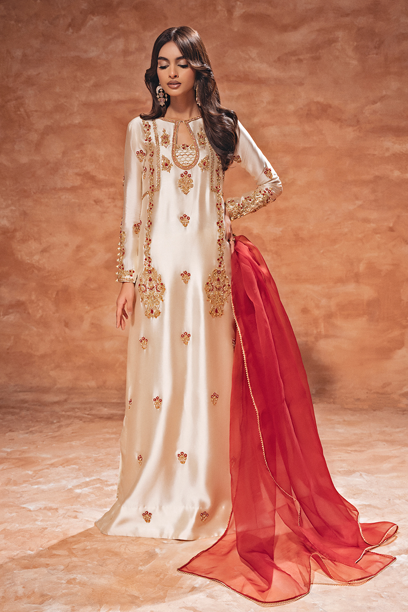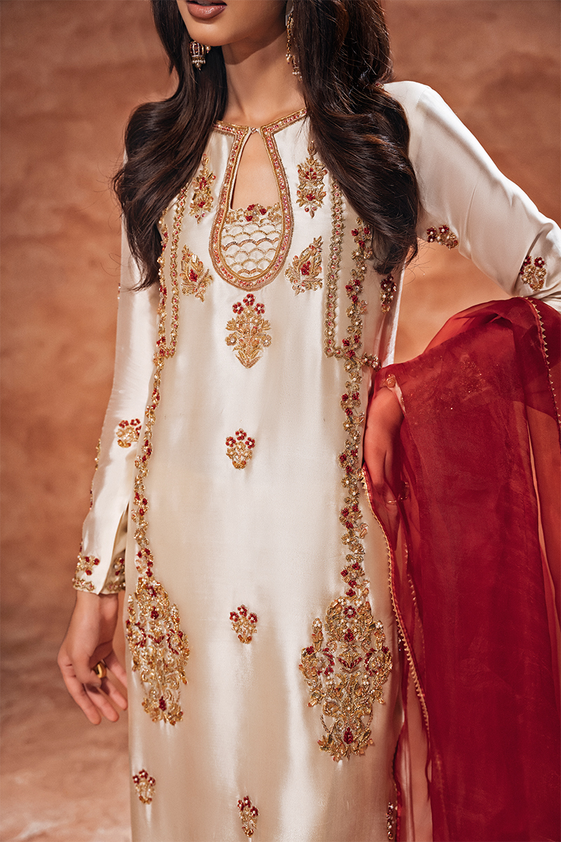 Make a statement with this exquisite, hand-embellished Tissue Silk kaftan shirt, paired with a luxurious organza dupatta. The kaftan's flowy silhouette and intricate embellishments with hints of crimson resham work and hues of pink and antique gold on the ivory silk canvas create a truly regal look, perfect for special occasions.