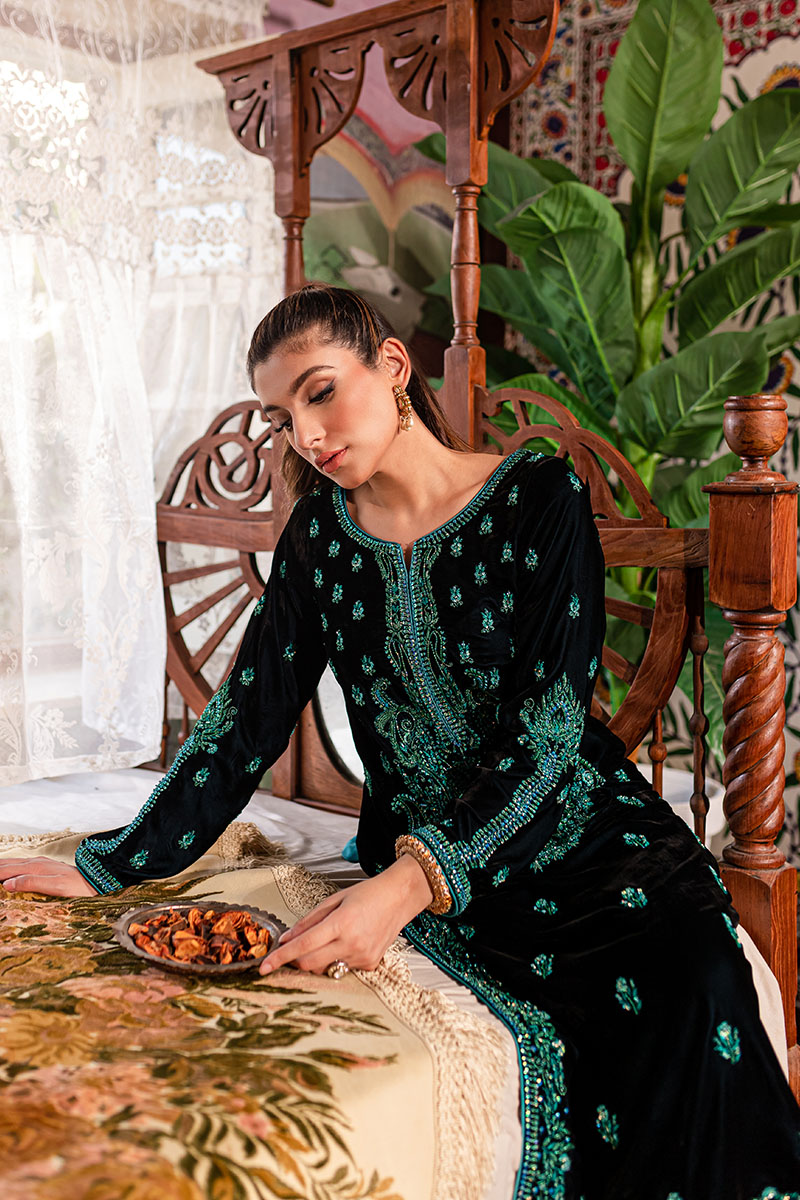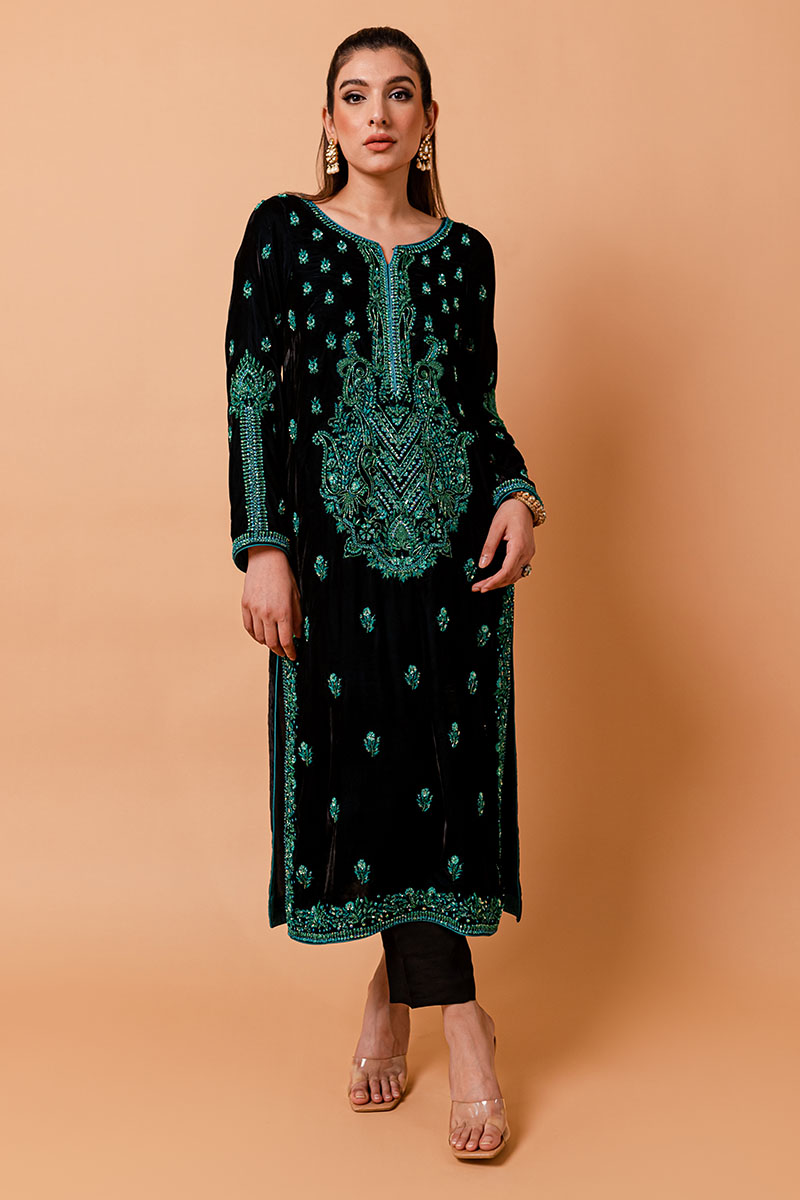 The Rena shirt is cut from plush teal two tone velvet and lavishly adorned with an elaborately hand-worked neckline. The contrasting, pure medium silk dupatta is trimmed with delicate details is for a complete look and can be added on to this look. Luscious velvet with that irresistible sheen and a stunning heavy embellished gala with motifs spread all over the shirt. The intricate hand embellishment along the sides and on the daaman makes you instantly dressed up. Styled with high heels and our coordinating black pants (as shown) you have a comfortable yet eternally stylish look!