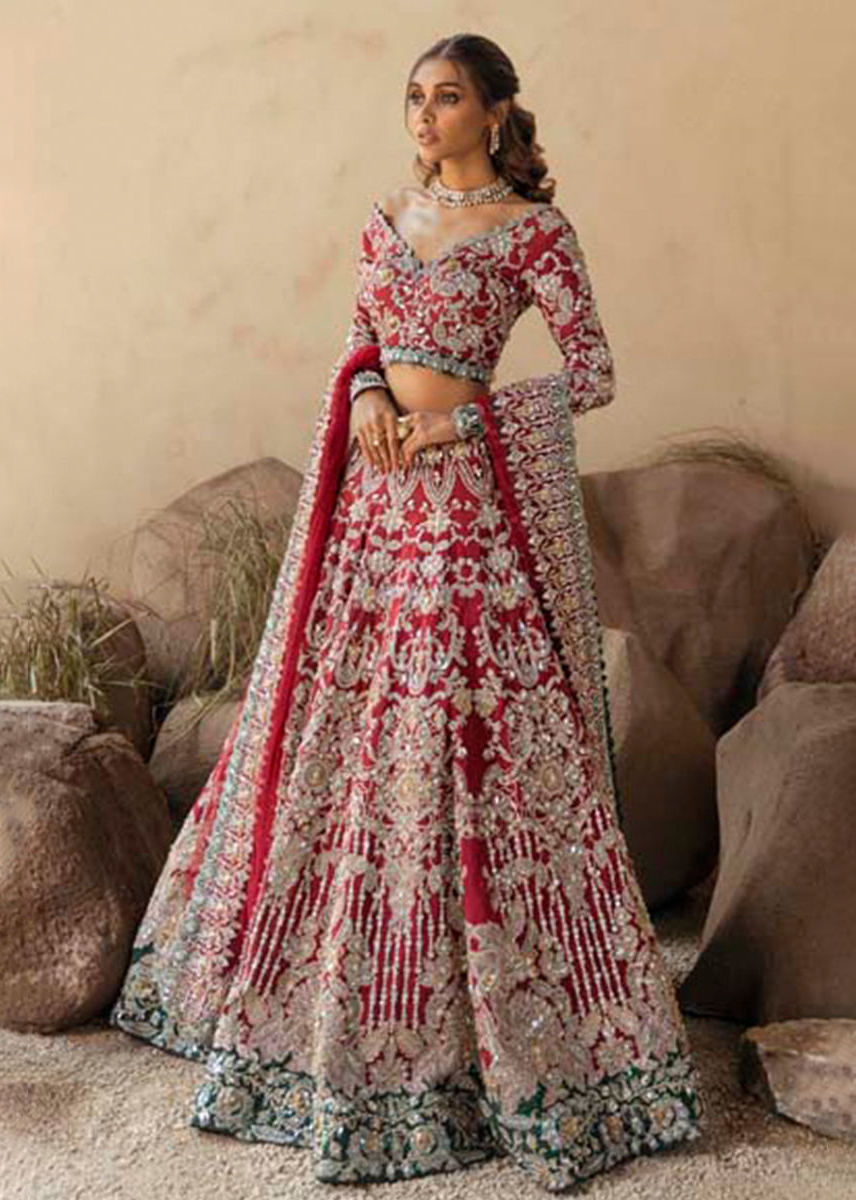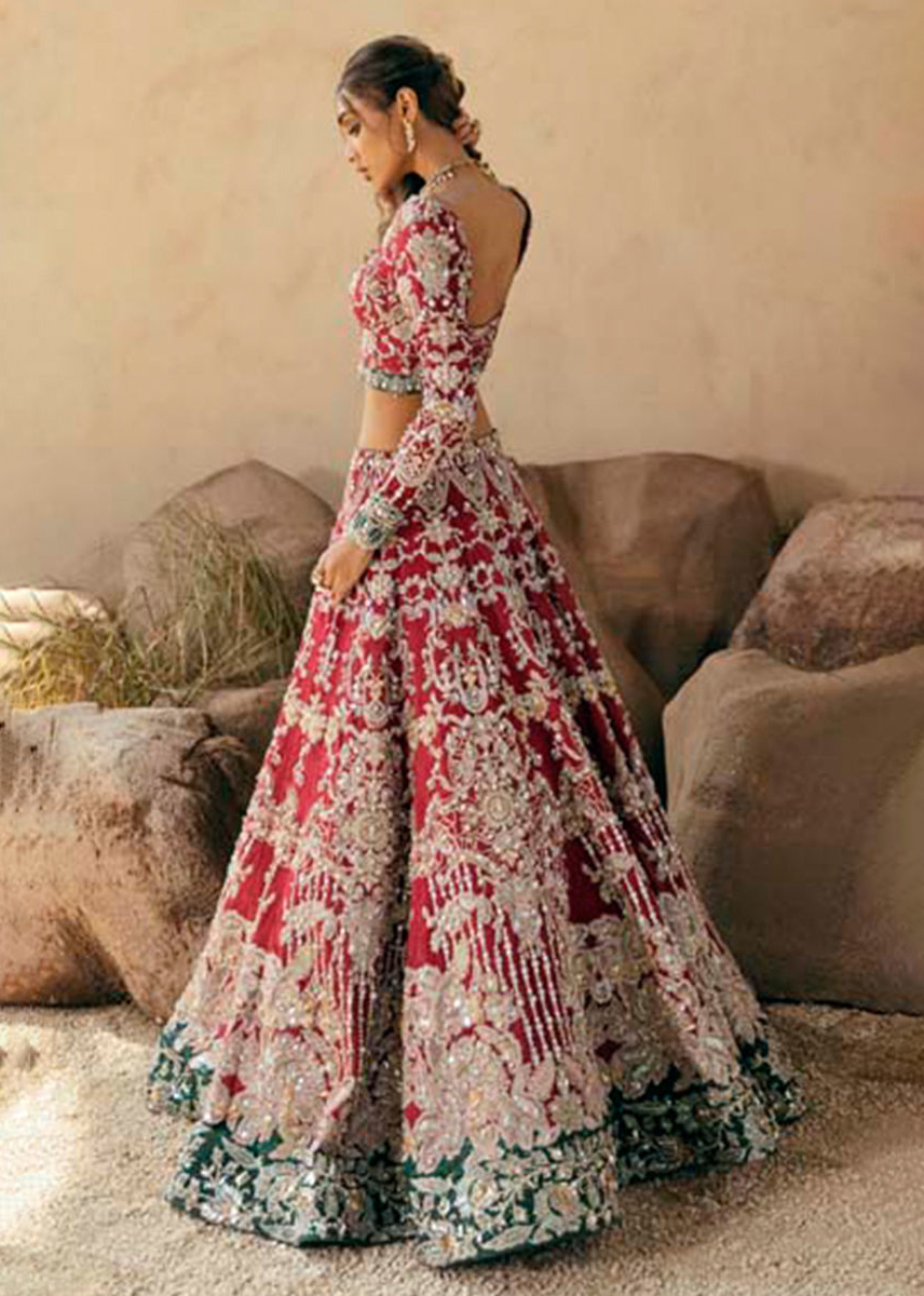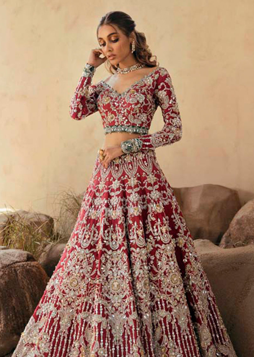 The regal maroon bridal encapsulates the traditional heritage of a statement bride and is infused with striking combination of ganga jamni embroidery and strokes of green hues. Incorporated with sophisticated tailoring techniques and cuts the ensemble asserts its glamorous outlook on luxurious pure rawsilk.
