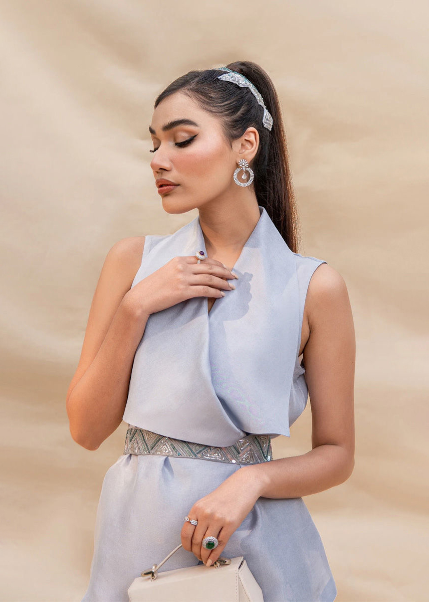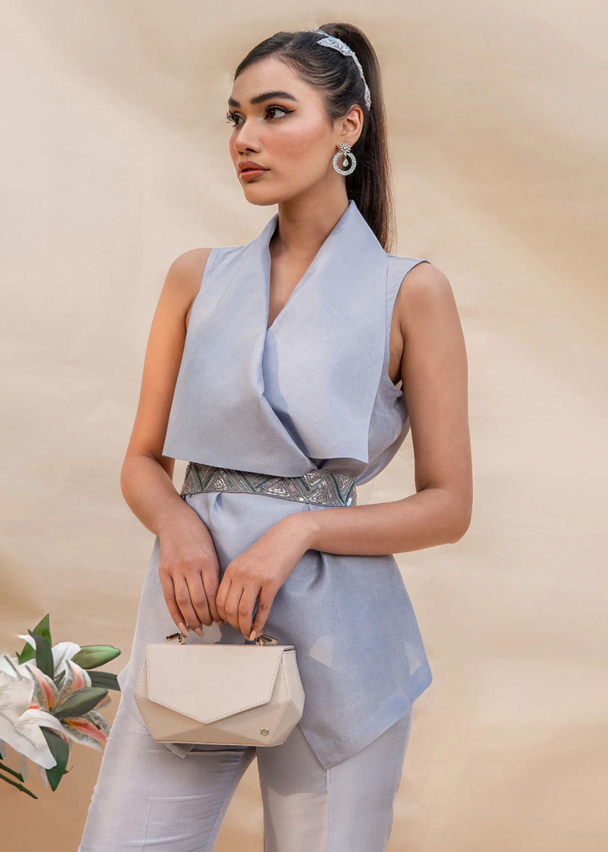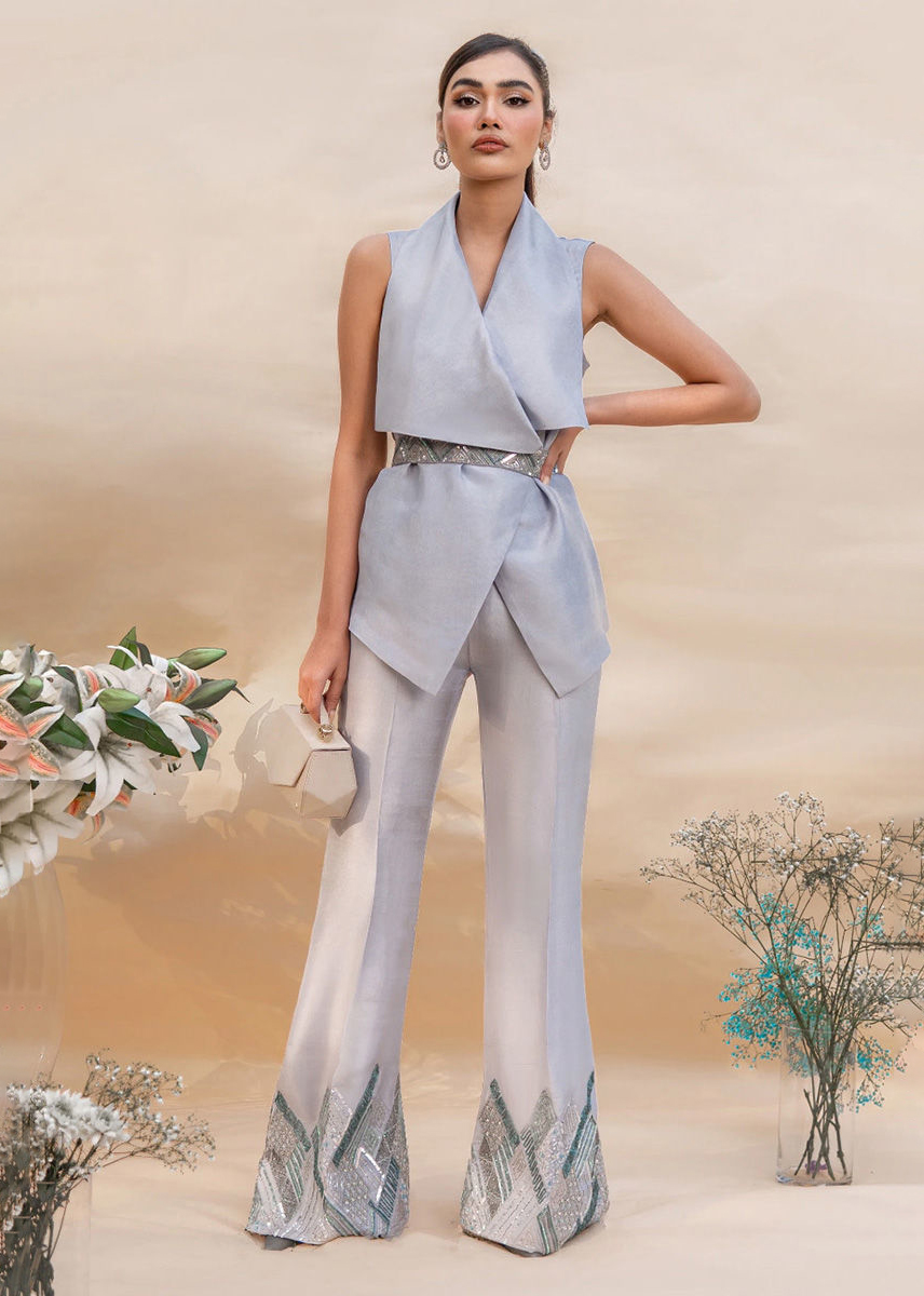 Double breasted rawsilk wrap with a statement embellished belt and heavy embellished bootcut pants featuring crystal, sequin, cut dana and resham work.