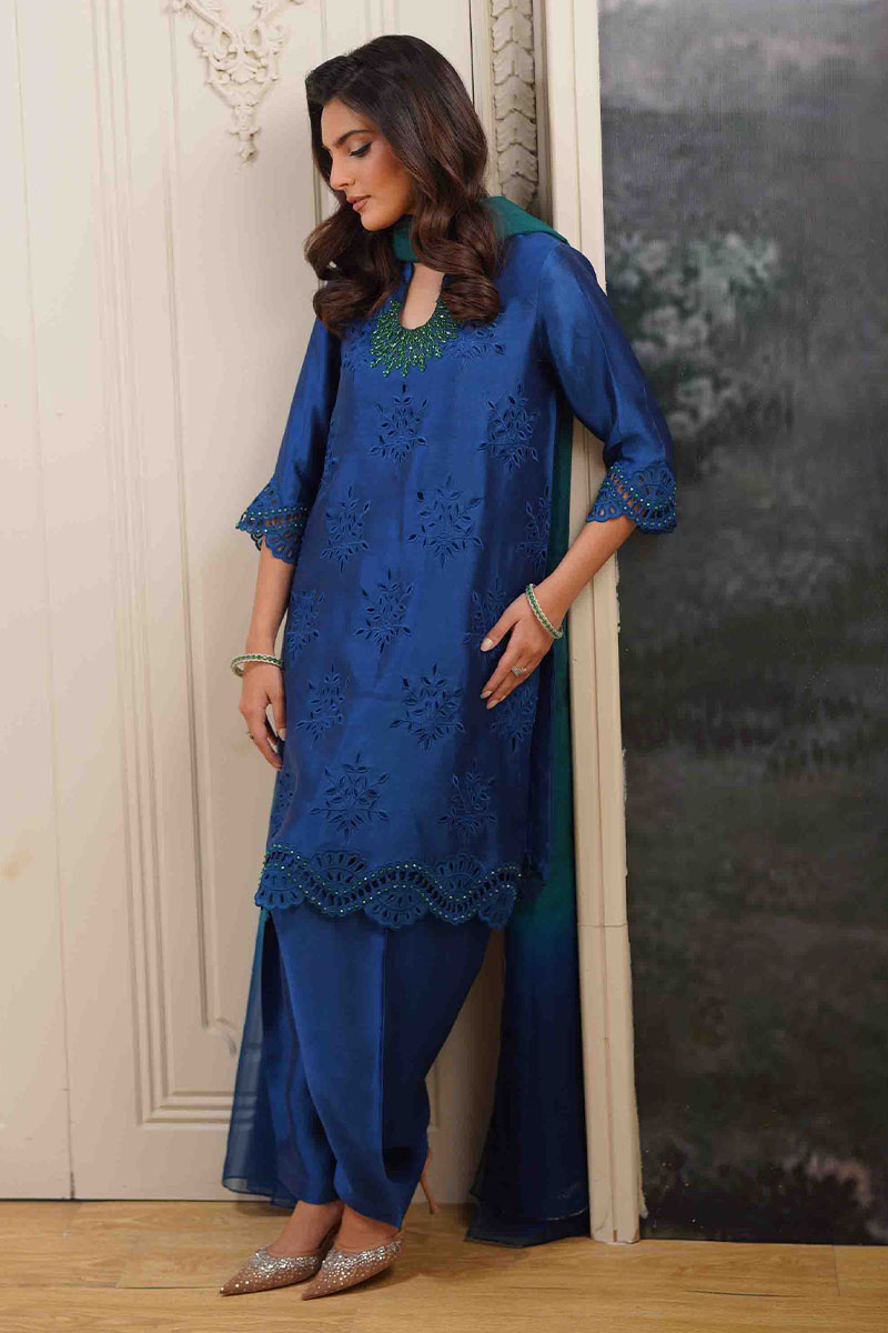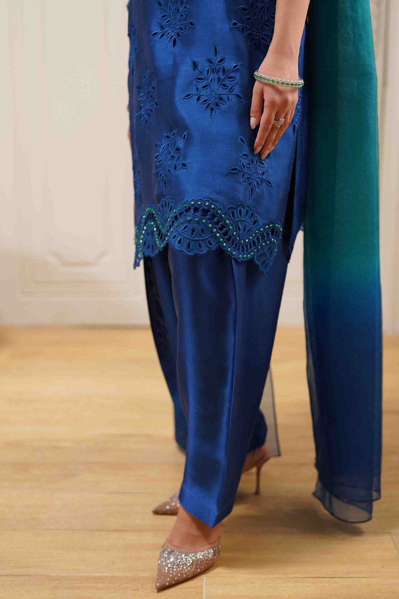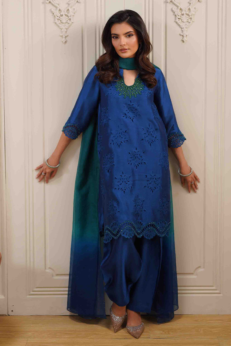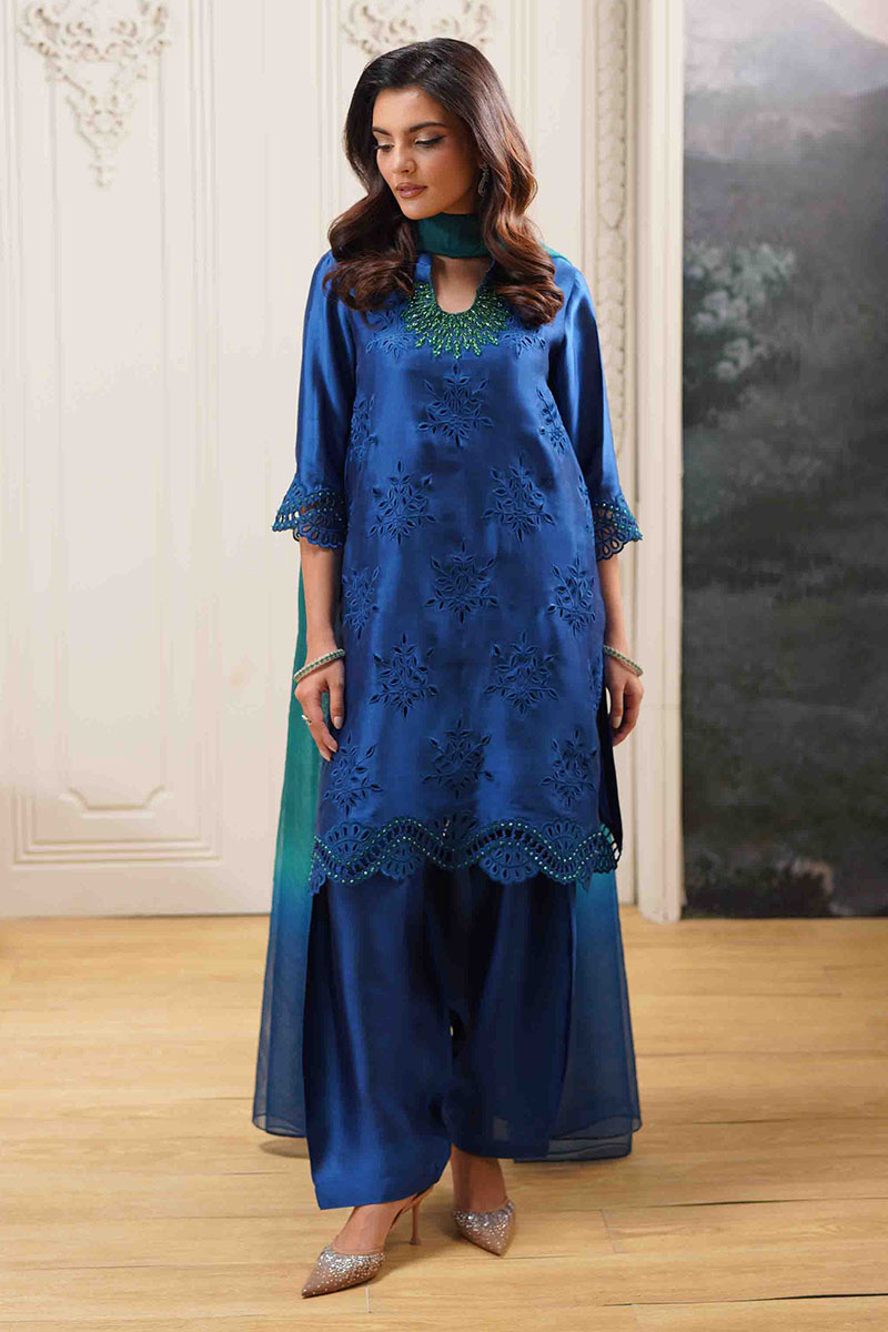 Elevate your wardrobe with this stunning deep sapphire blue ensemble, thoughtfully crafted from luxurious, lightweight silk for a refined look. The shirt features intricate floral cutwork embroidery, beautifully accentuated with rich green beadwork around the neckline and sleeve hems, adding a touch of glamour to this classic design. The delicately scalloped edges of the shirt and sleeves enhance the overall elegance, while the matching shalwar provide a sleek silhouette. Completing the set, the ombre two-tone dupatta in shades of teal and navy adds a sophisticated flair, making this outfit perfect for festive gatherings and special occasions.