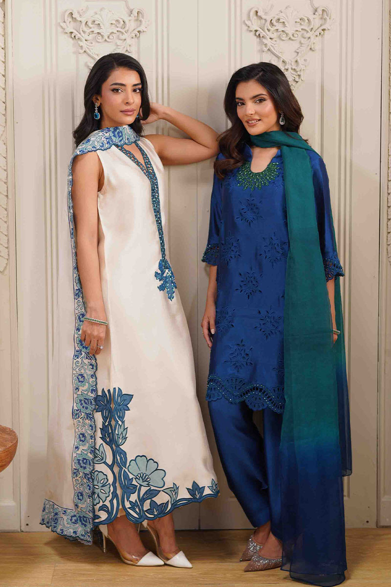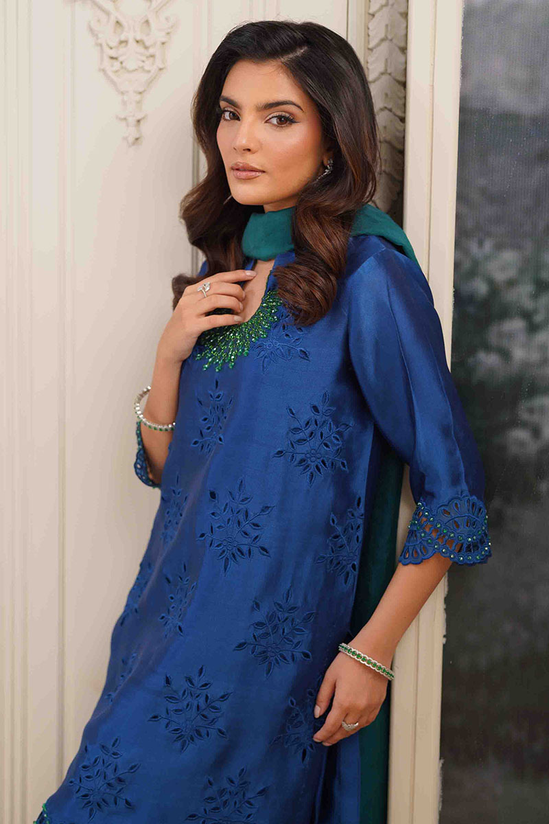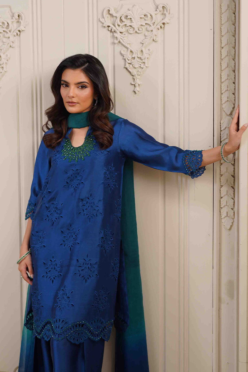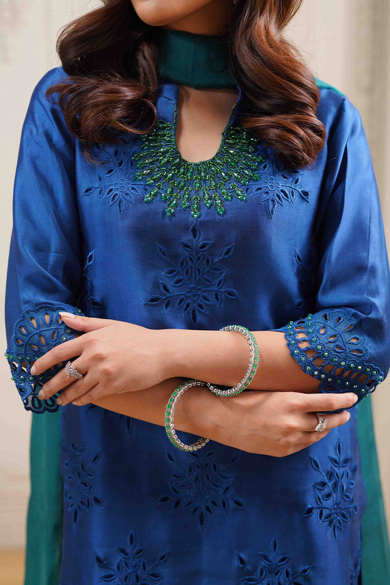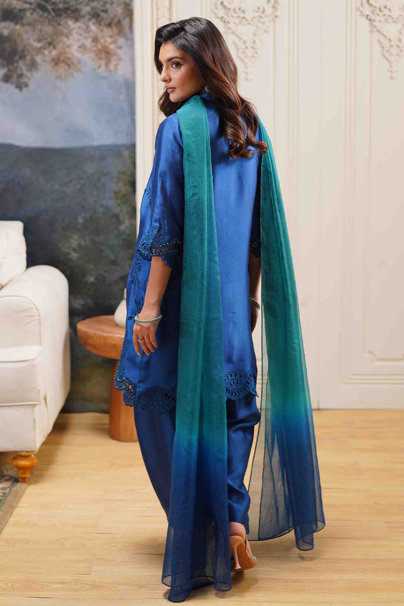 Elevate your wardrobe with this stunning deep sapphire blue ensemble, thoughtfully crafted from luxurious, lightweight silk for a refined look. The shirt features intricate floral cutwork embroidery, beautifully accentuated with rich green beadwork around the neckline and sleeve hems, adding a touch of glamour to this classic design. The delicately scalloped edges of the shirt and sleeves enhance the overall elegance, while the matching shalwar provide a sleek silhouette. Completing the set, the ombre two-tone dupatta in shades of teal and navy adds a sophisticated flair, making this outfit perfect for festive gatherings and special occasions.