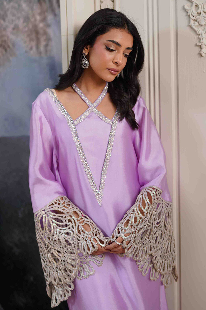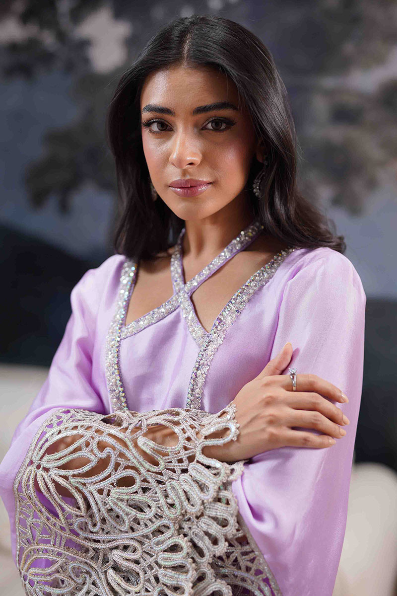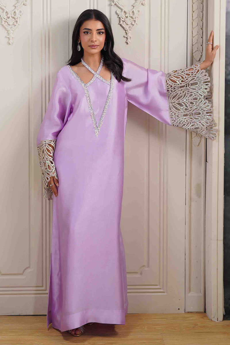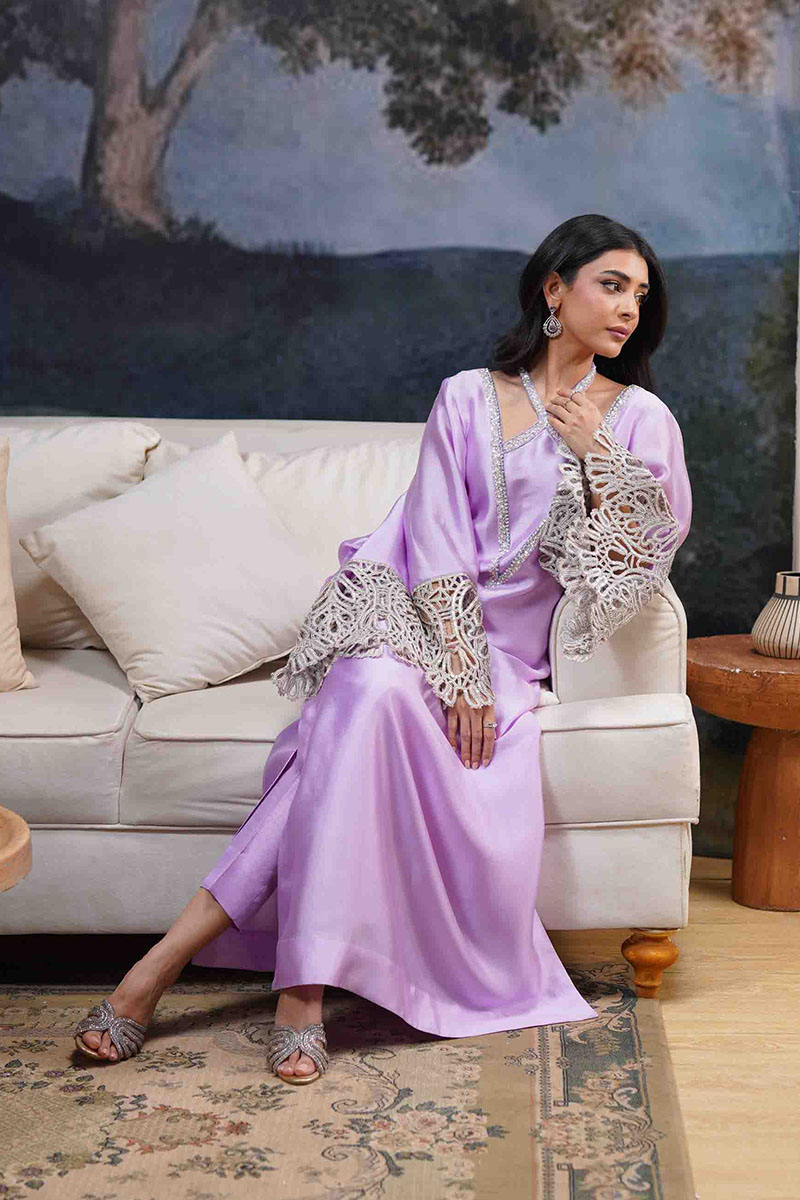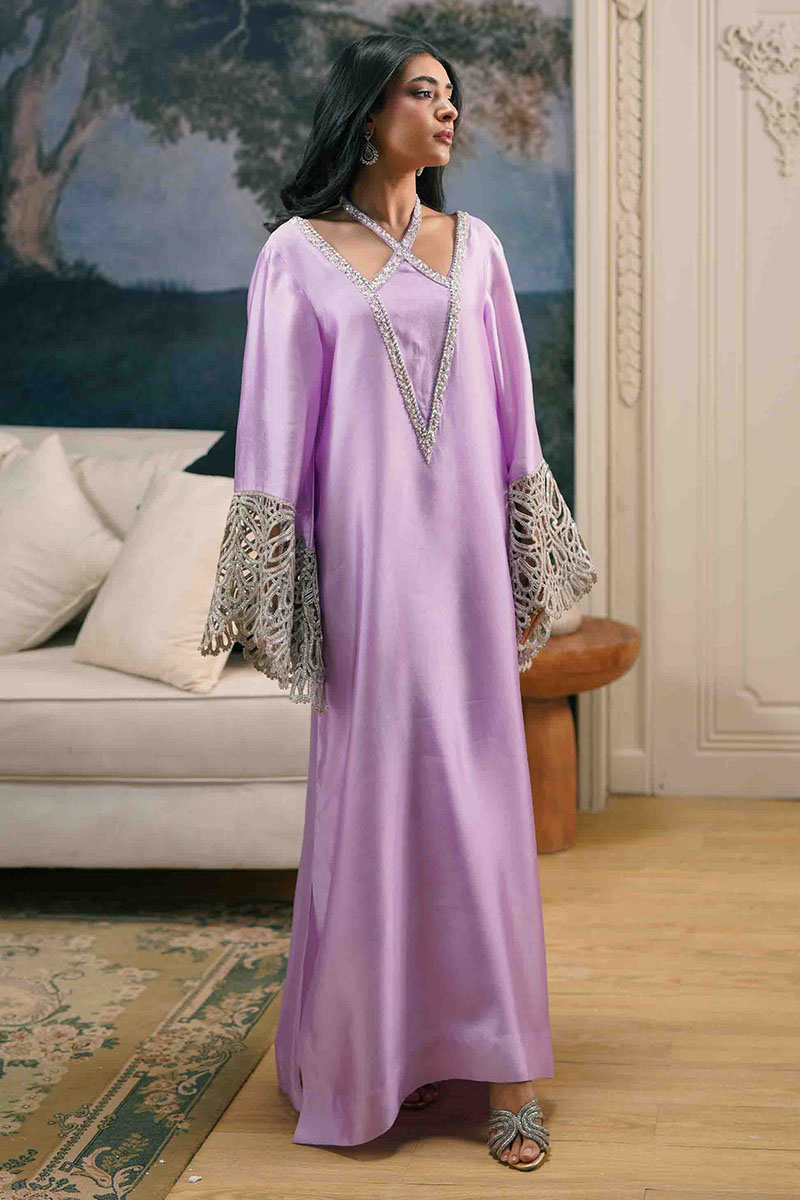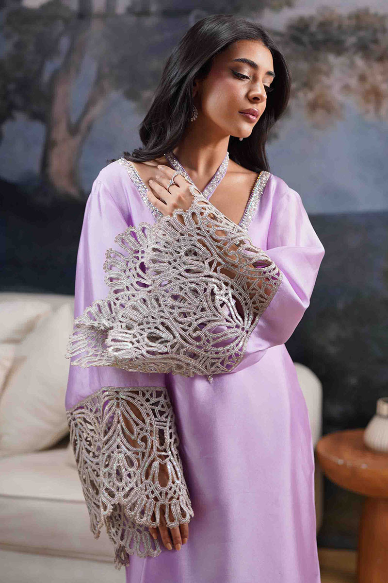 Step into luxury with this stunning lilac silk kaftan, designed for those who appreciate timeless elegance. Crafted from premium, lustrous silk, this flowing silhouette drapes gracefully, offering both comfort and sophistication. The kaftan features a unique, crisscross neckline adorned with delicate crystal embellishments, adding a touch of sparkle. The wide, airy sleeves are enhanced with exquisite, hand-cut lace detailing, creating an ethereal, statement look perfect for special occasions.