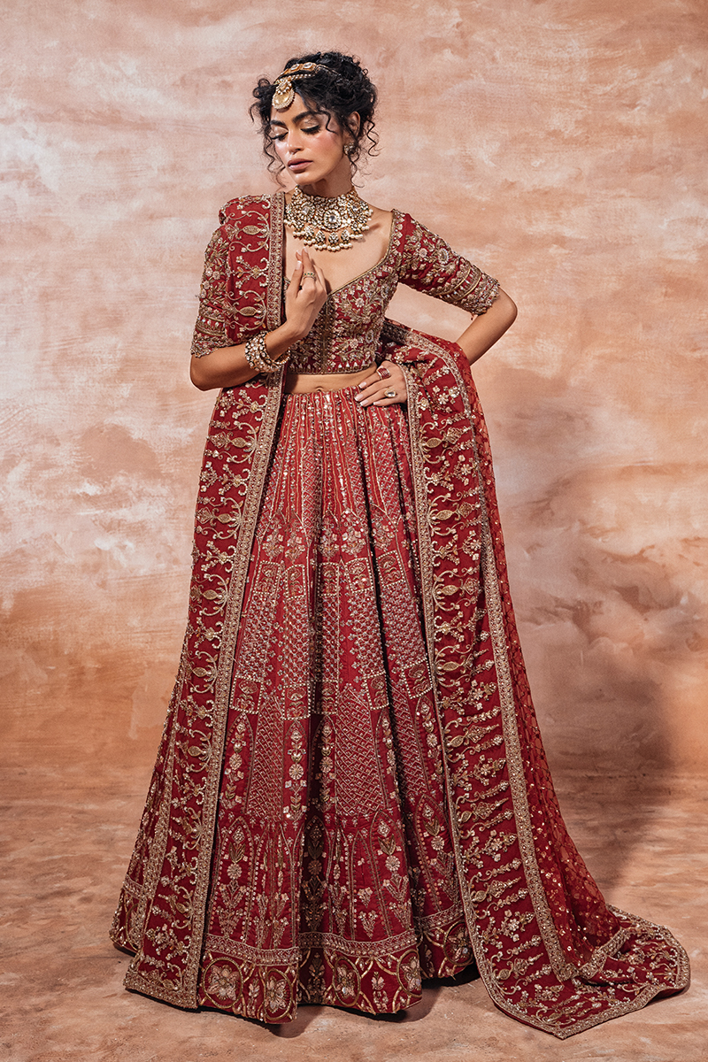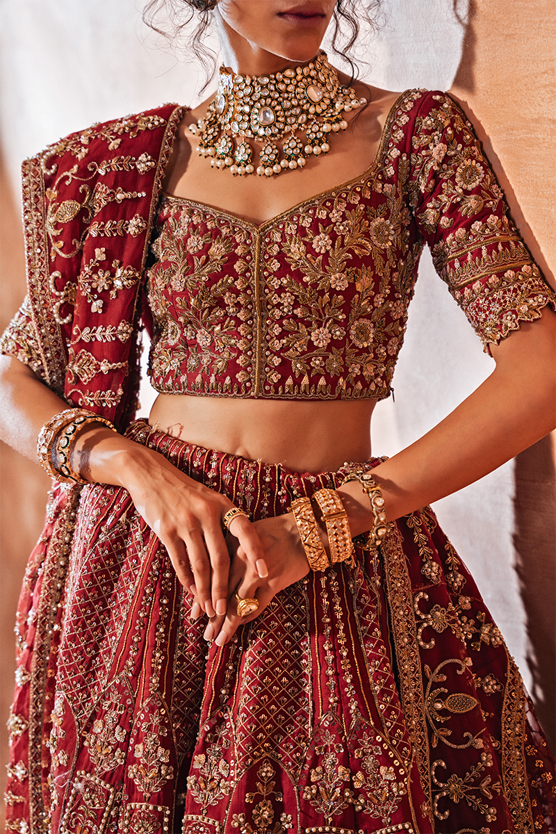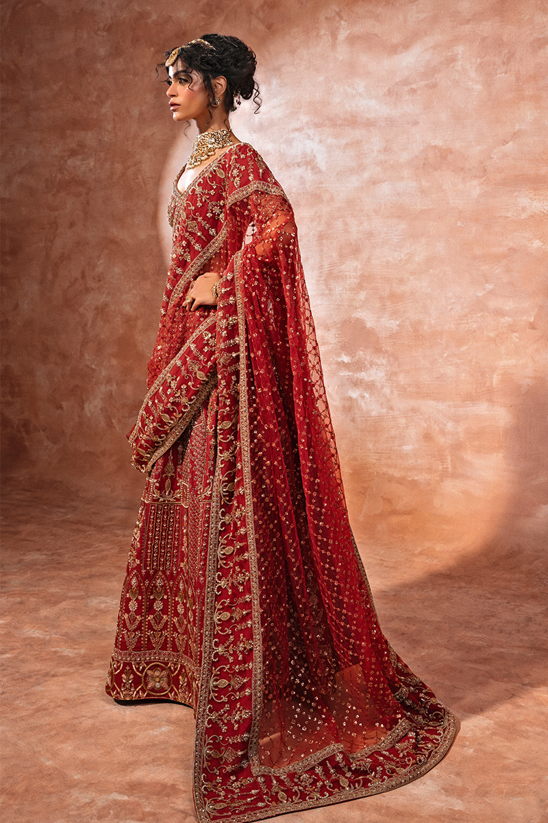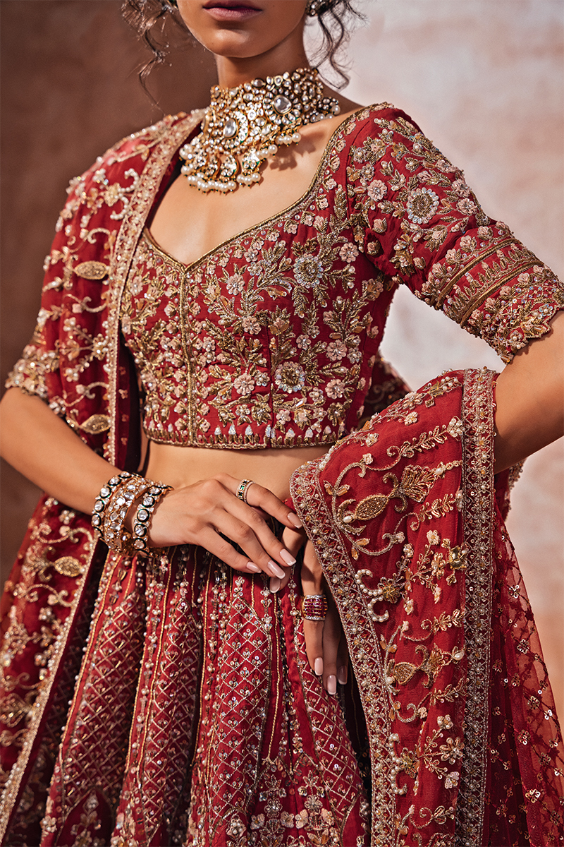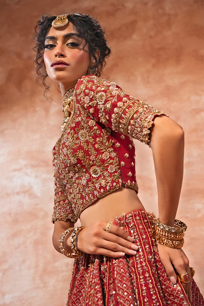 Make a regal statement on your special day in this breathtaking, hand-embellished Raw Silk deep red lehnga choli bridal. This exquisite ensemble showcases intricate zari, sequins, resham, cut dana, and gotta work on a bold red canvas, paired with a heavy hand-embellished bridal dupatta and a voluminous lehenga.