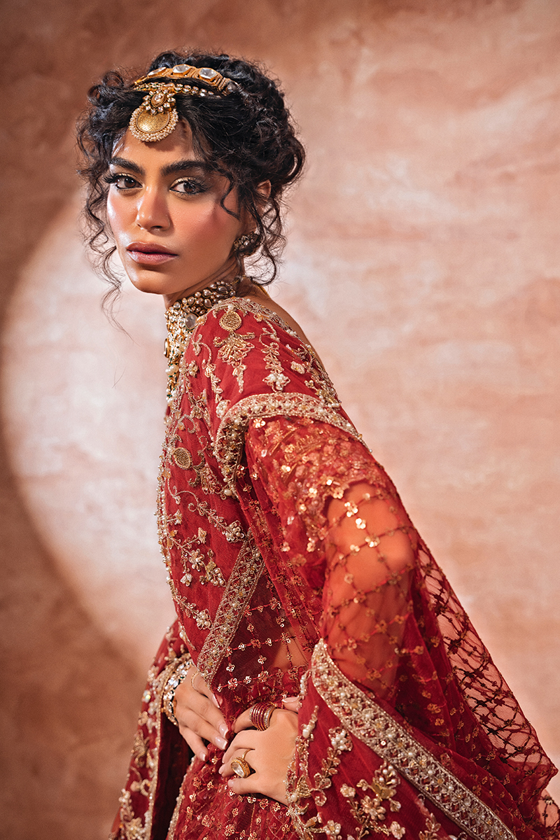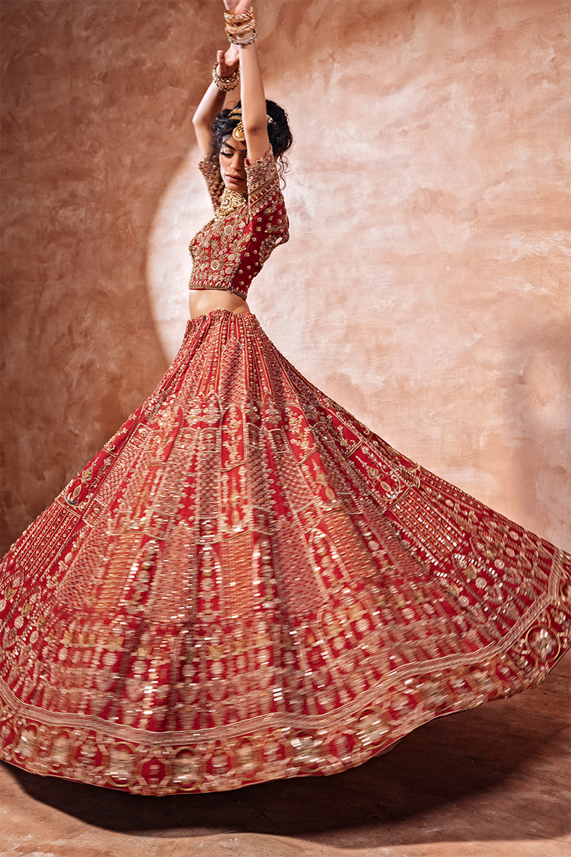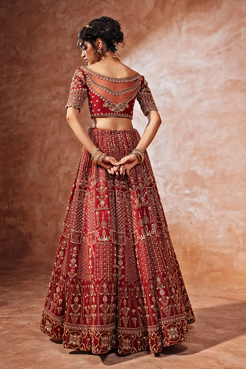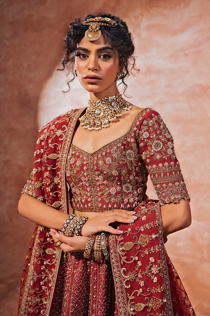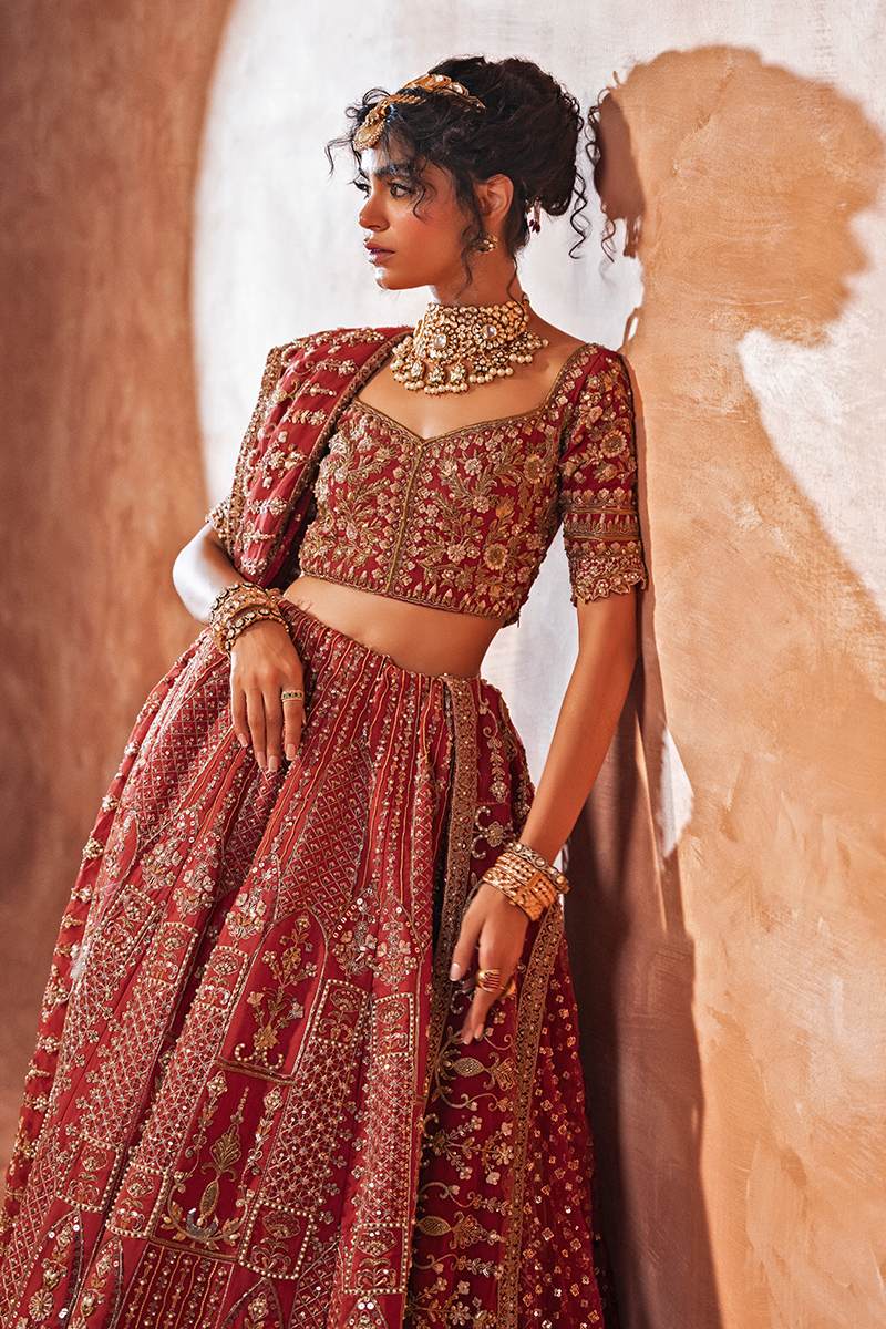 Make a regal statement on your special day in this breathtaking, hand-embellished Raw Silk deep red lehnga choli bridal. This exquisite ensemble showcases intricate zari, sequins, resham, cut dana, and gotta work on a bold red canvas, paired with a heavy hand-embellished bridal dupatta and a voluminous lehenga.