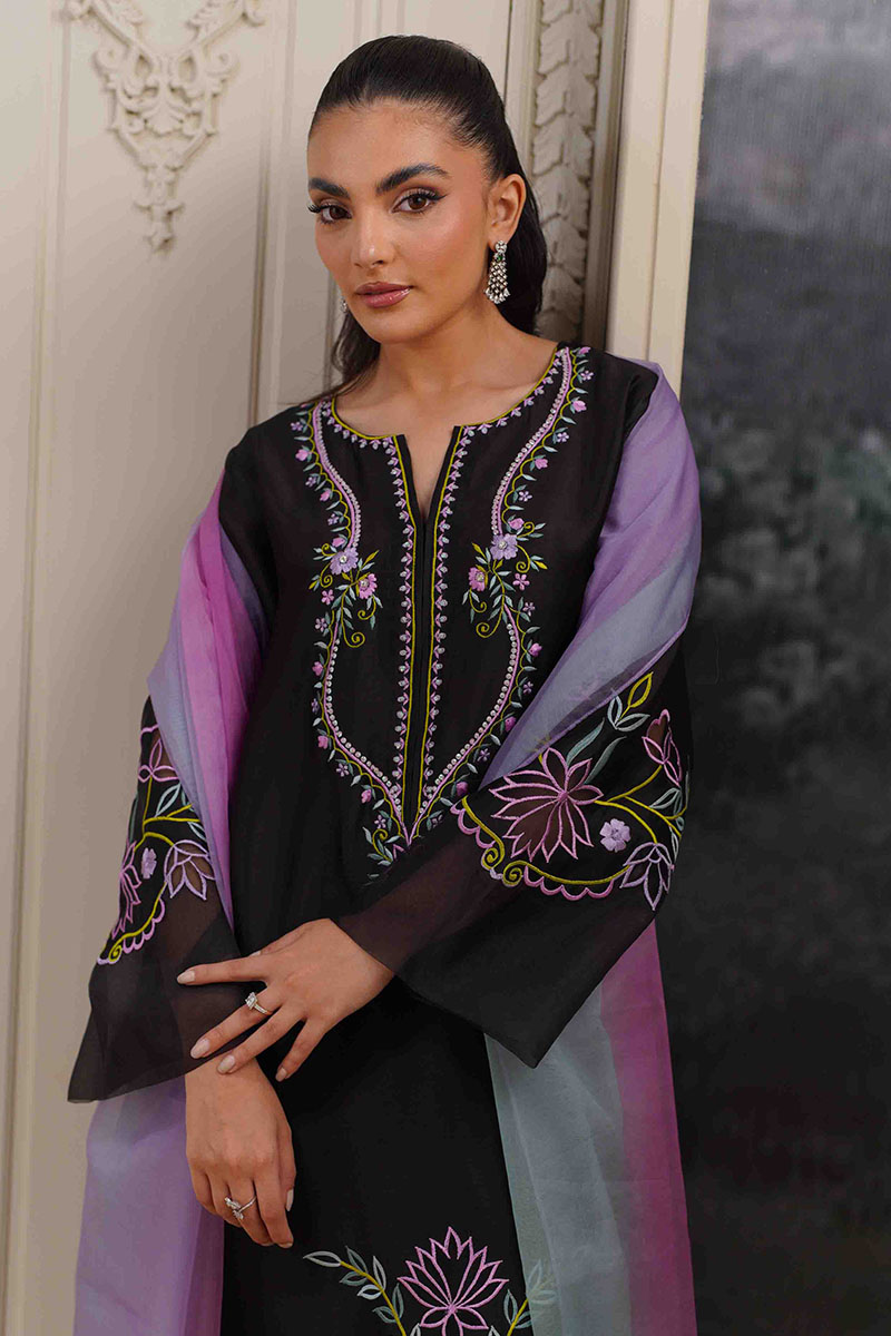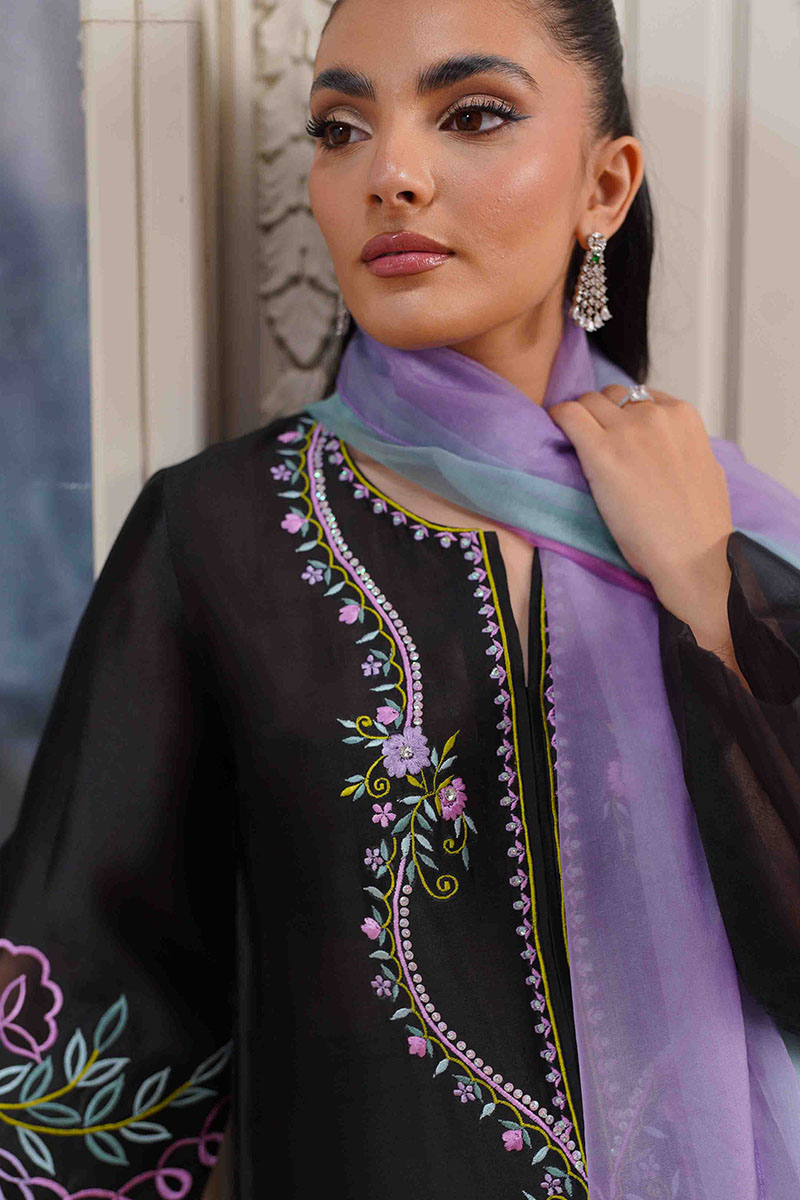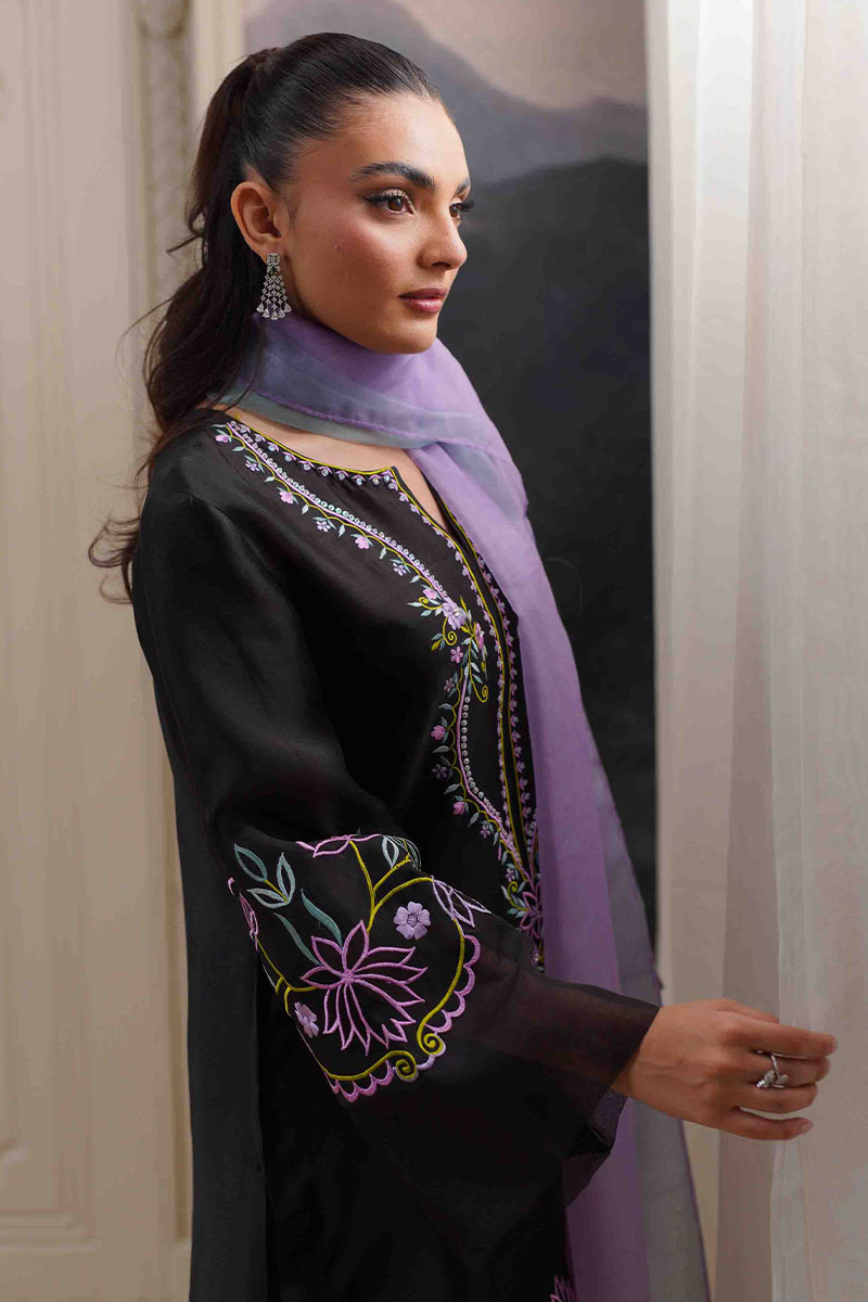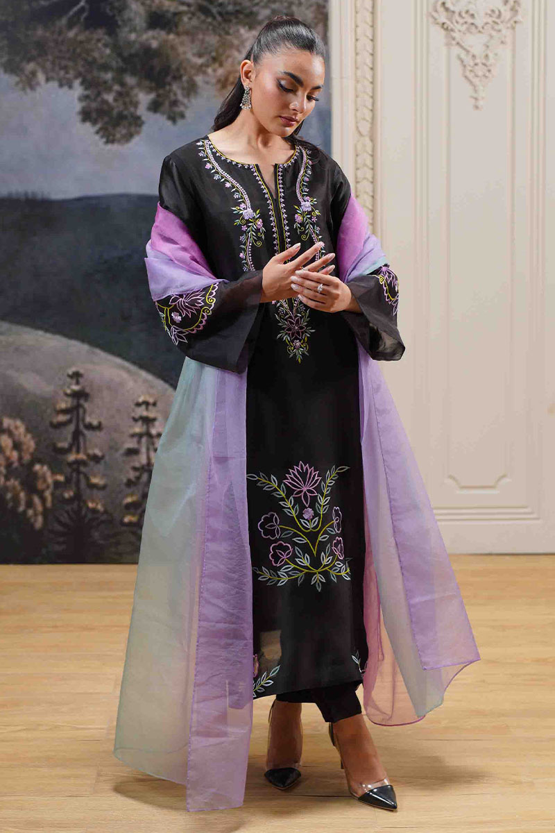 Step into a world of timeless elegance with this exquisite black silk ensemble, a masterpiece of artistry and craftsmanship. The ensemble embodies grace and sophistication, perfect for the discerning woman who values both style and tradition. The shirt is delicately adorned with intricate multicolored floral embroidery, showcasing a stunning blend of lavender, lilac, and mint green threads. The vibrant floral patterns are thoughtfully placed along the neckline, sleeves, and hemline, reflecting a garden in full bloom.