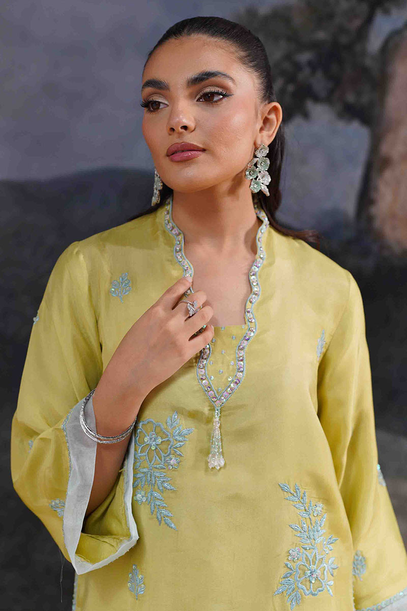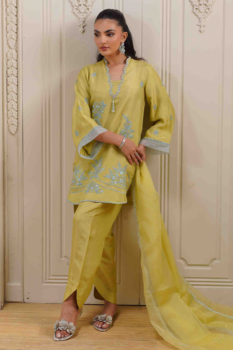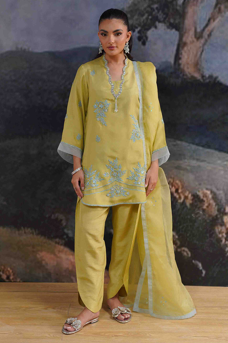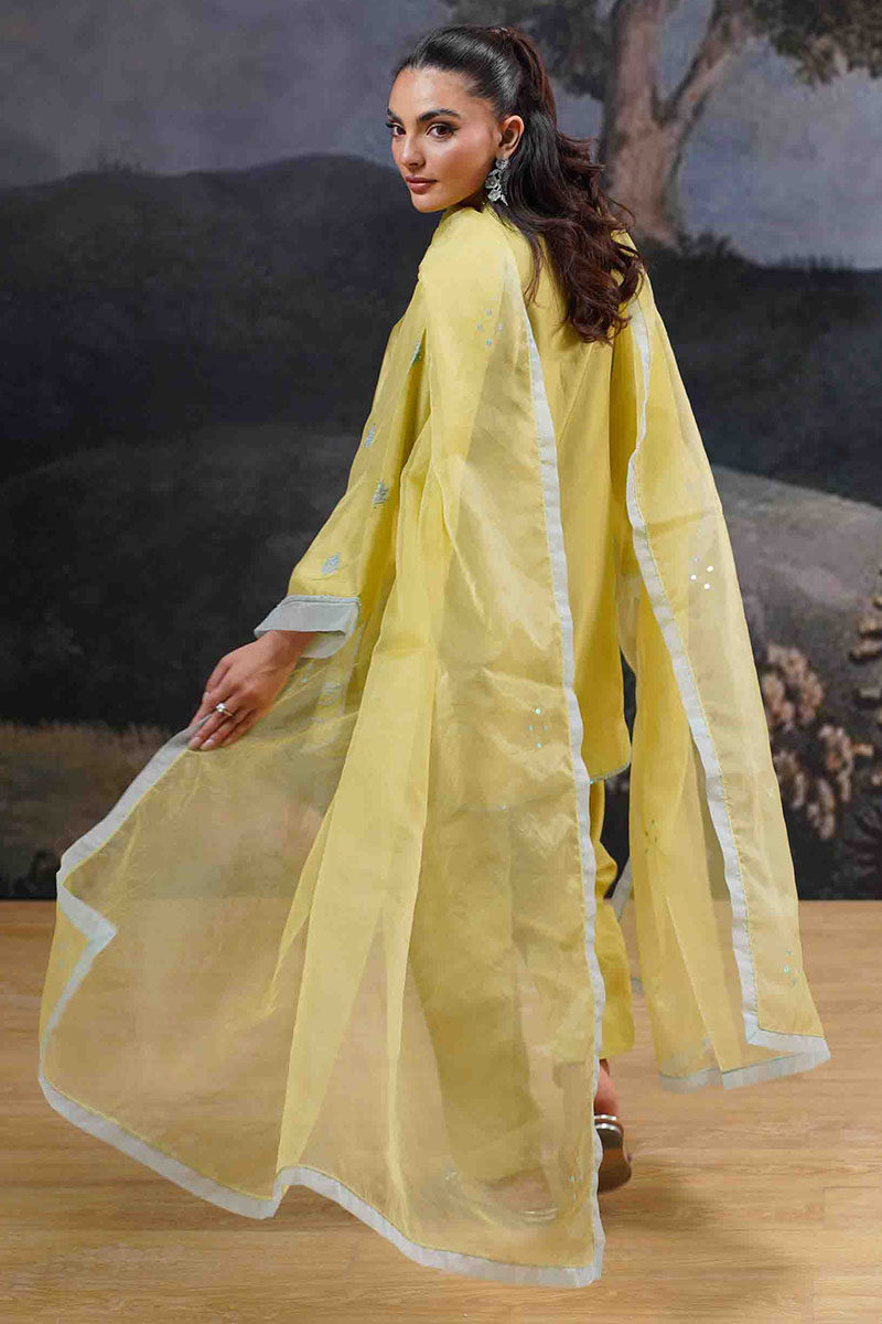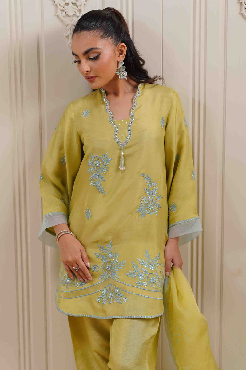 Elevate your wardrobe with this lime yellow ensemble, perfect for both festive occasions and casual gatherings. Crafted from premium, airy fabric, this outfit exudes grace and comfort. The outfits features; A flowy, straight-cut kurta adorned with delicate blue floral threadwork and shimmering sequin detailing, featuring a scalloped neckline with intricate hand embellishments and a graceful, rounded hem. Coordinating Korean rawsilk pants with a contemporary cut, providing a relaxed yet refined fit and a matching, sheer organza dupatta with a soft, contrasting border, adding a touch of ethereal elegance.