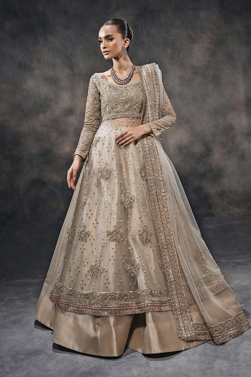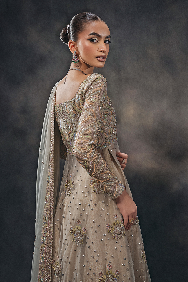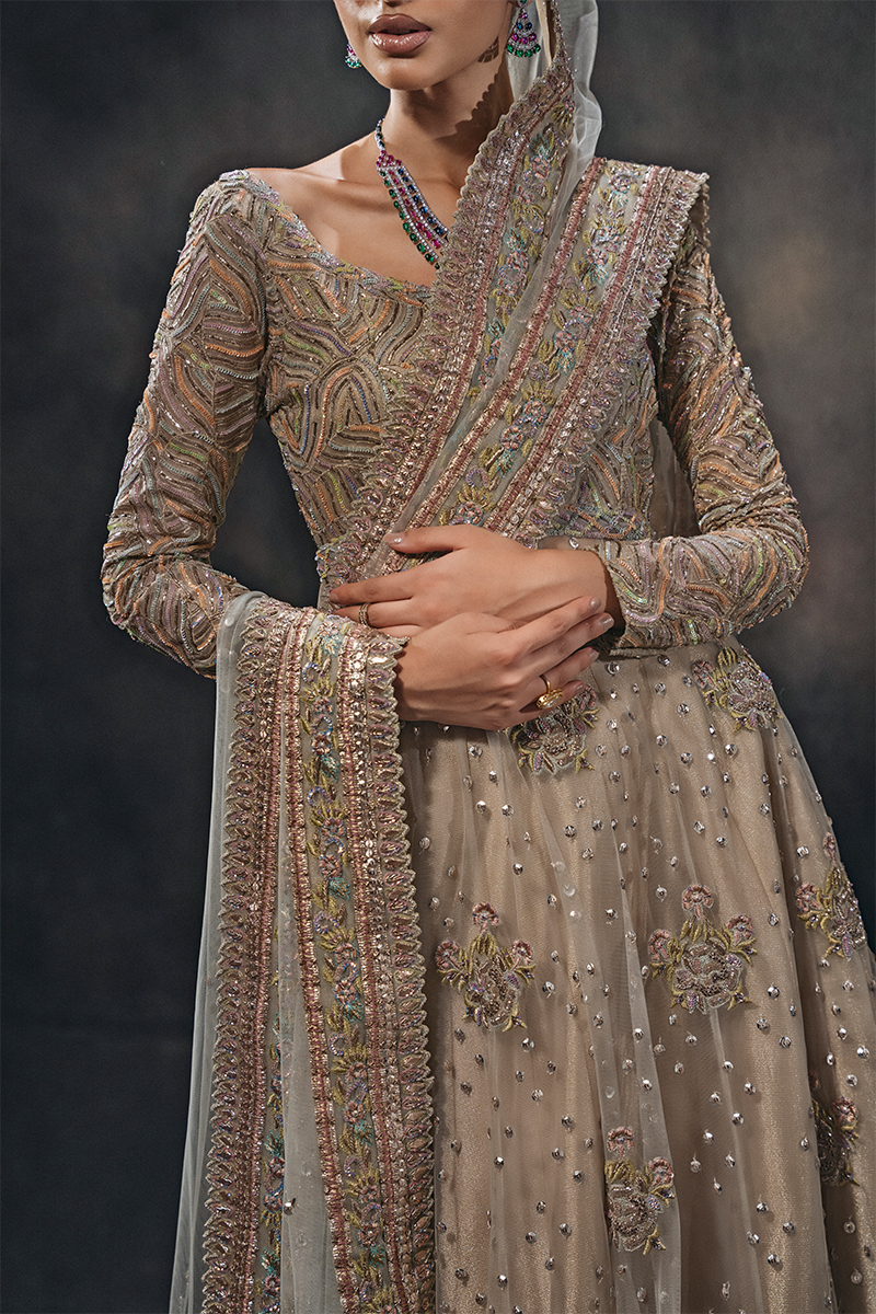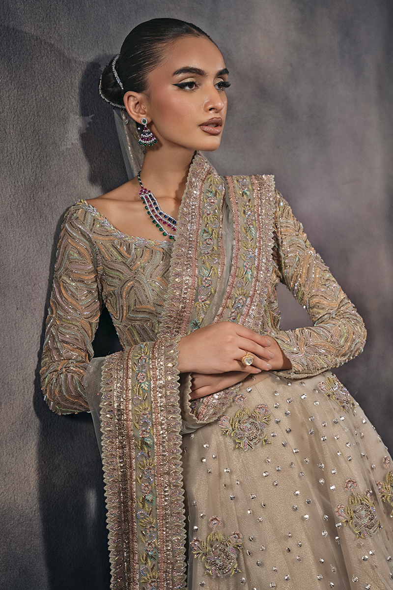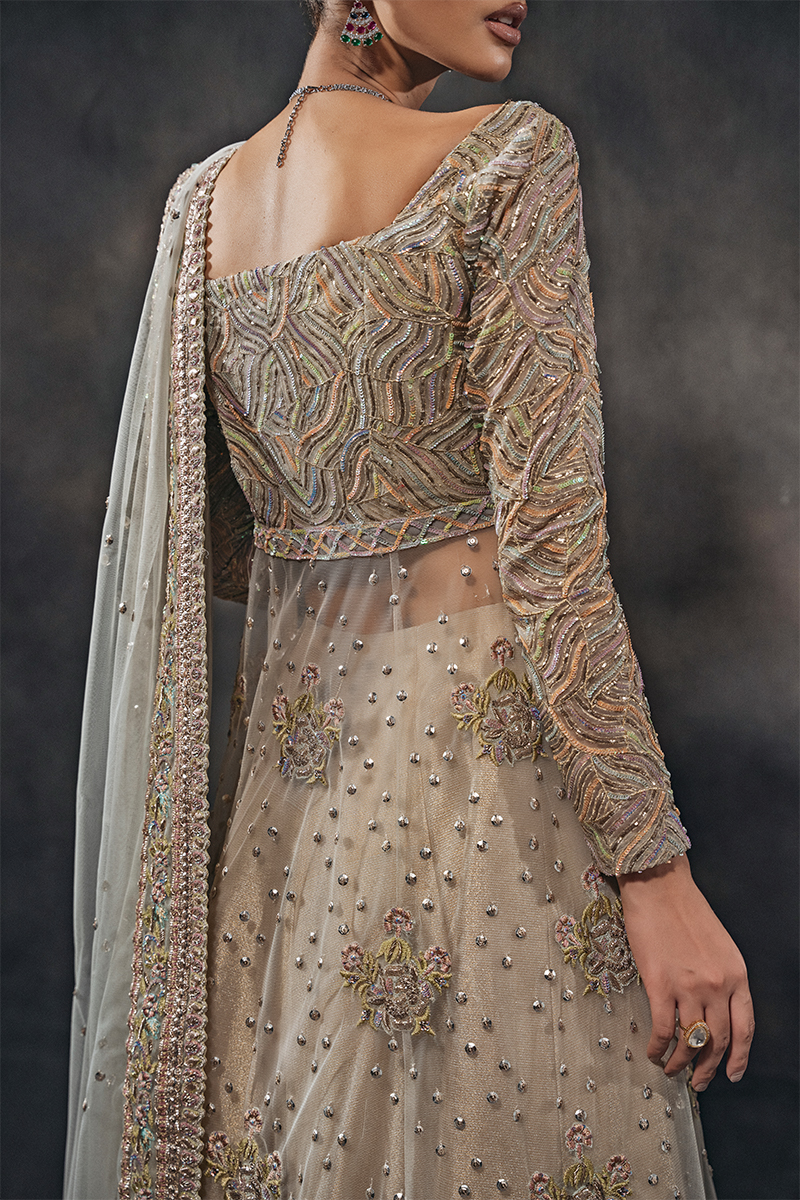 Experience the epitome of luxury and craftsmanship with this hand-embellished tulle heavy formal, showcasing a balanced mix of geometric and floral motifs. This masterpiece features intricate zari, sequin, resham, cut dana, and gotta work on a bold yet delicate tulle canvas. Paired with Zari organza Lehenga and heavy embellished tulle dupatta with complimenting Zari finishing.