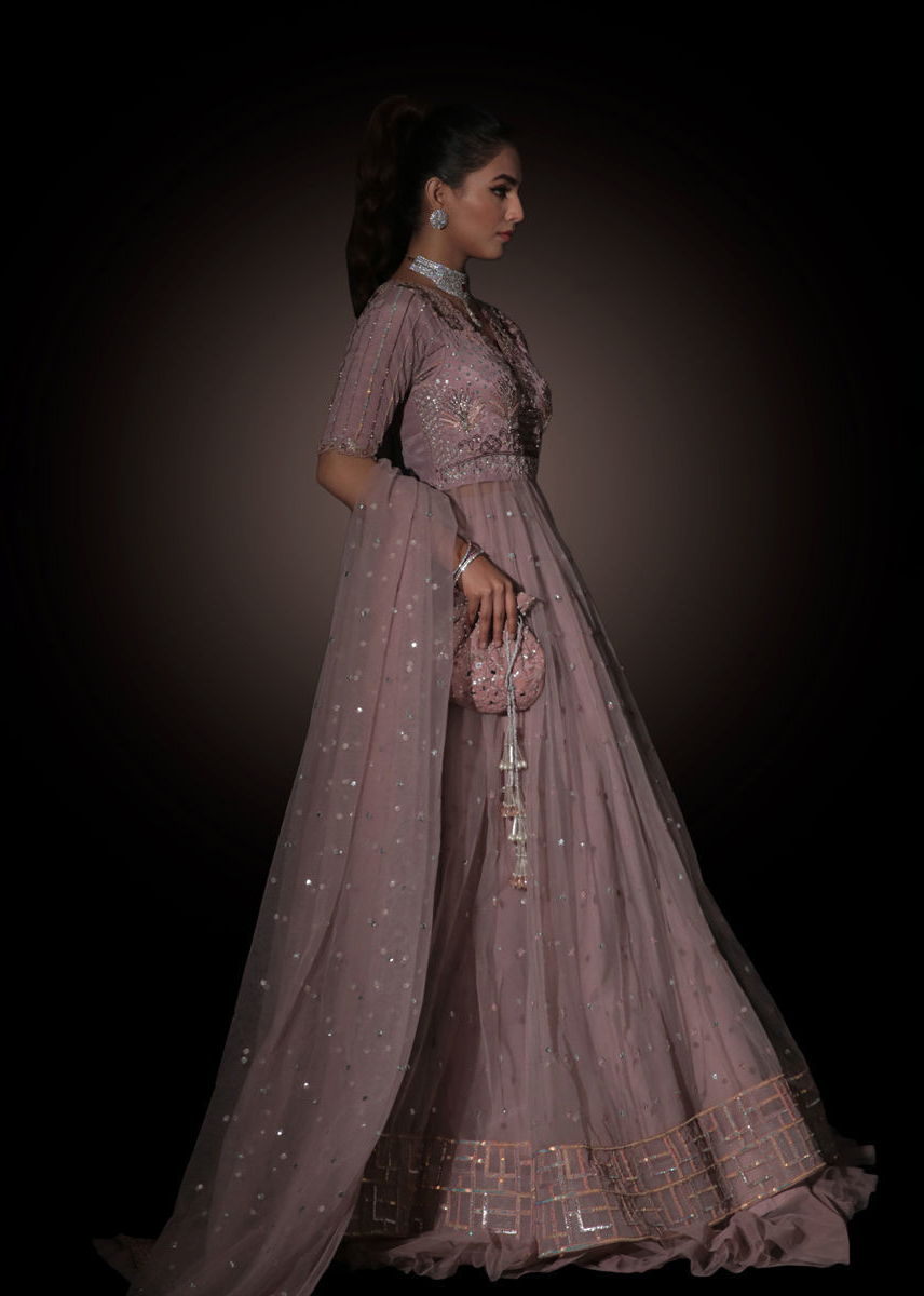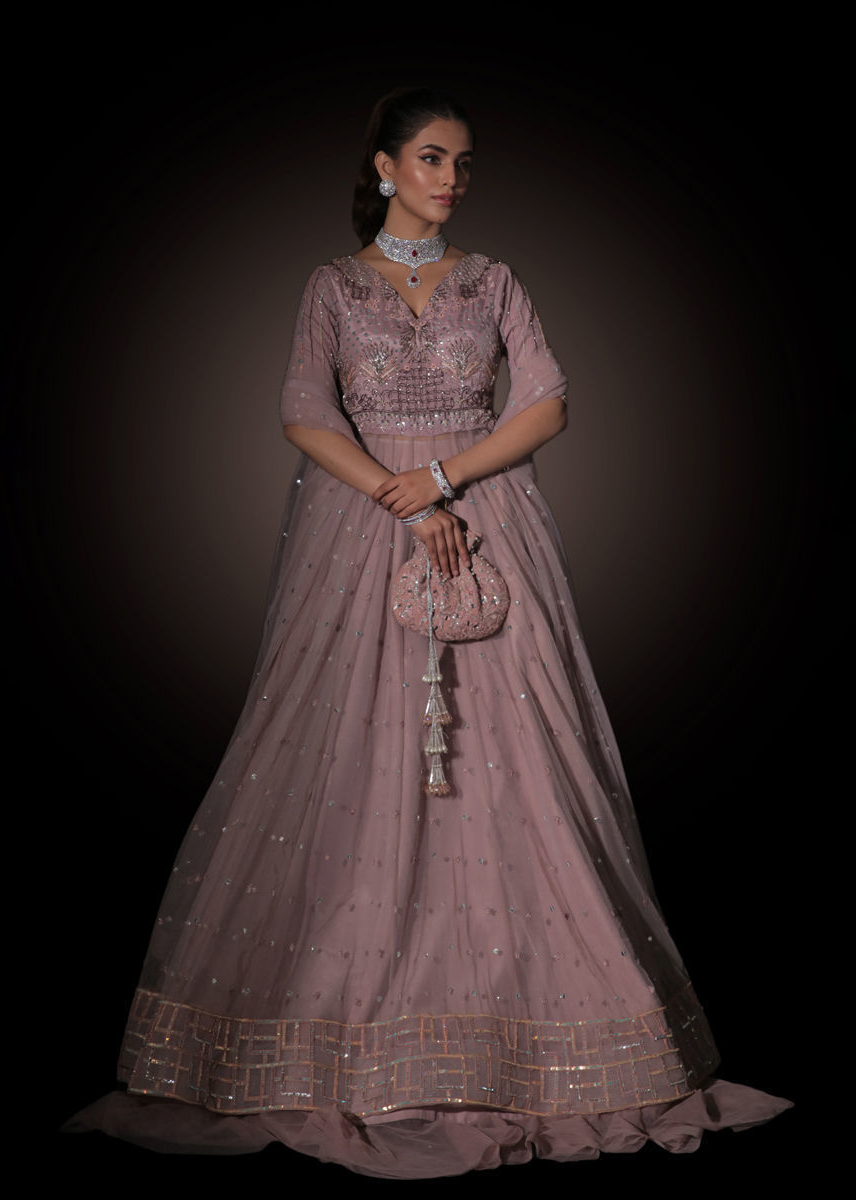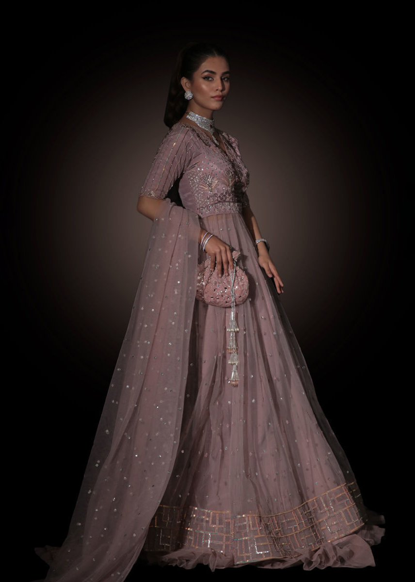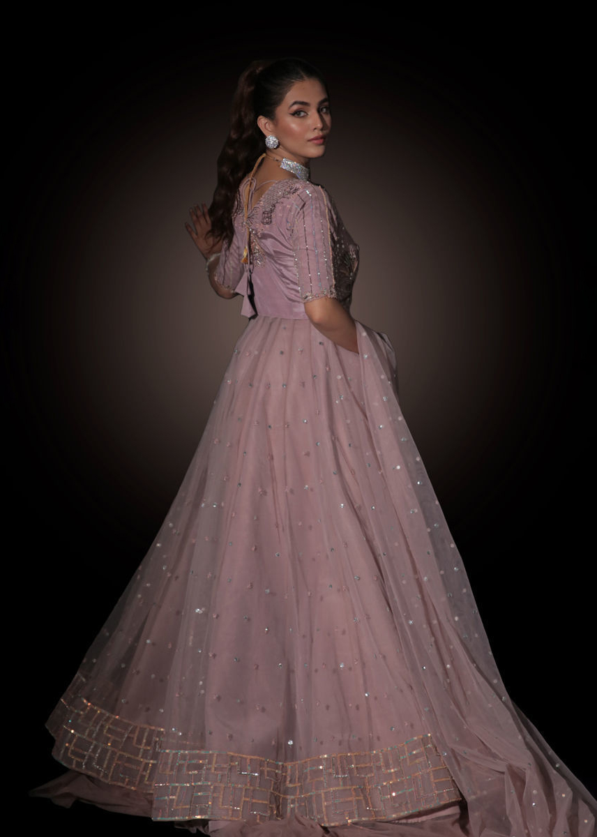 The lilac peshwas has intricate cutdana and zardozi work all over with a geometric sitara border and heavy sitara spray all over. Paired a net dupatta with embellished motifs on all four corners and sequin spray. The regal silk lehnga gives outfit the right structure and flare.