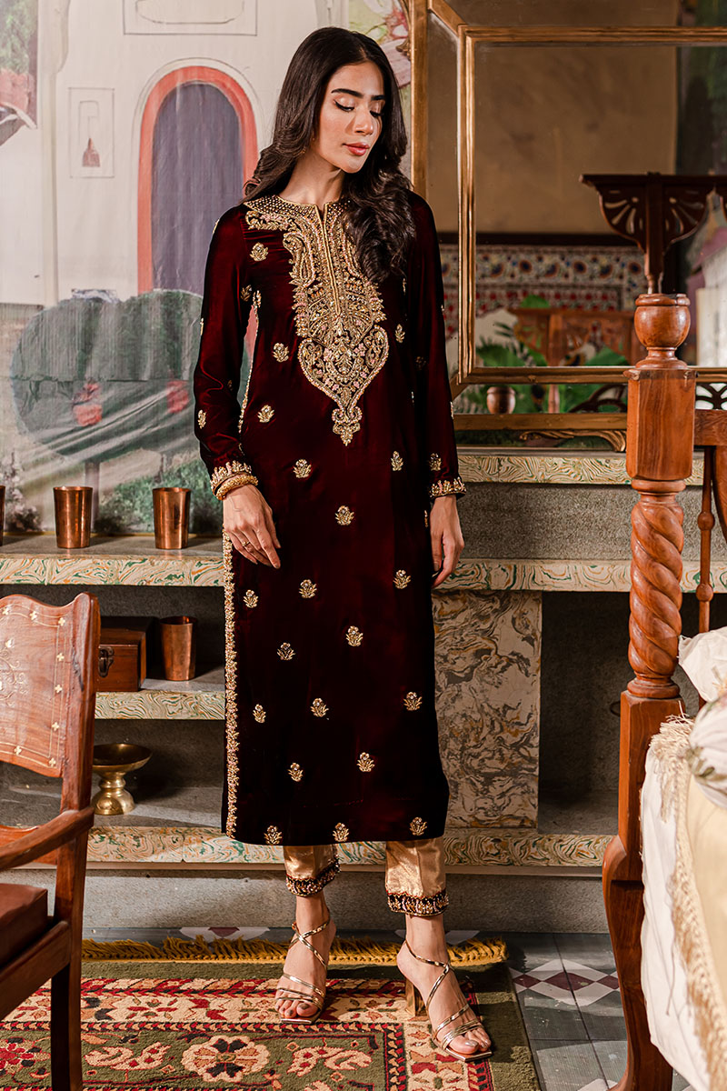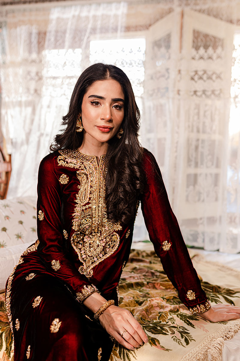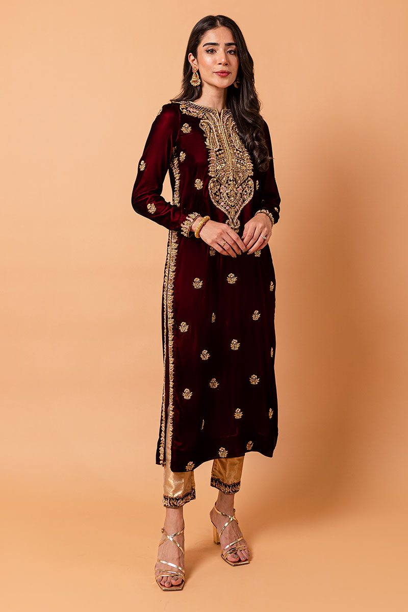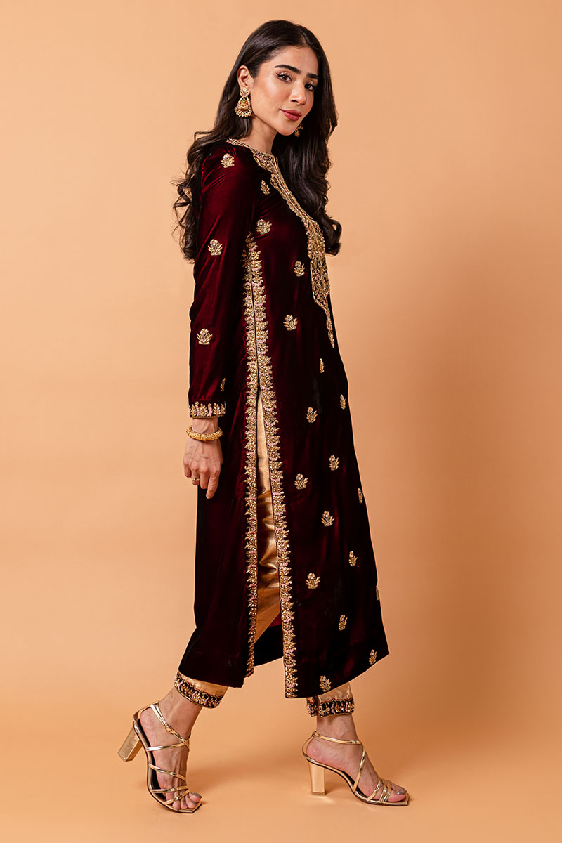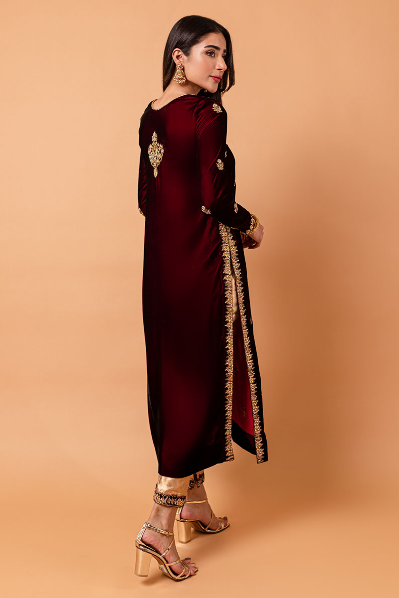 Eternal glamour, for those who want to make an impact. Cut from plush maroon velvet, this universally flattering shirt is richly embroidered and created to last for years to come. Subtly shimmering sequins and Swarovski, silk French knots, pearl and crystals handwork is offset with striking golf zardozi embellishments like on the neckline, side hems sleeves and the motifs dotted on the shirt. The full-length sleeves add a touch of timeless elegance and are perfect for those chilly winter nights. A gold tissue crushed dupatta, completes your outfit with unforgettable style. Pairing it with the ad on embellished gold tissue trouser as shown in the image completes the look!