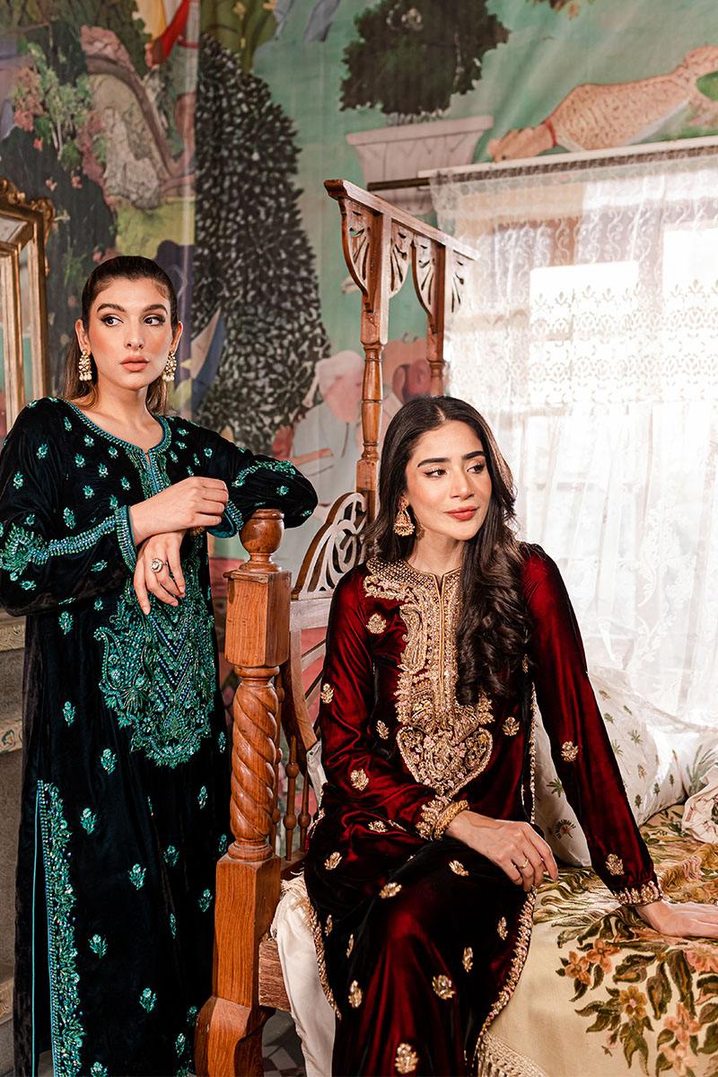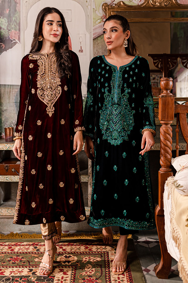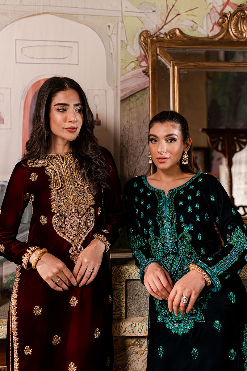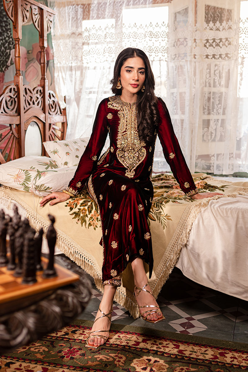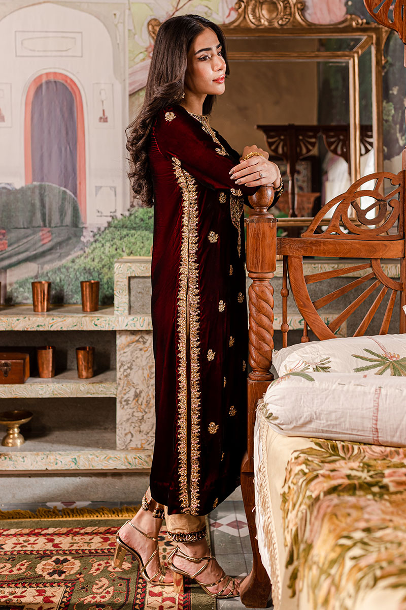 Eternal glamour, for those who want to make an impact. Cut from plush maroon velvet, this universally flattering shirt is richly embroidered and created to last for years to come. Subtly shimmering sequins and Swarovski, silk French knots, pearl and crystals handwork is offset with striking golf zardozi embellishments like on the neckline, side hems sleeves and the motifs dotted on the shirt. The full-length sleeves add a touch of timeless elegance and are perfect for those chilly winter nights. A gold tissue crushed dupatta, completes your outfit with unforgettable style. Pairing it with the ad on embellished gold tissue trouser as shown in the image completes the look!