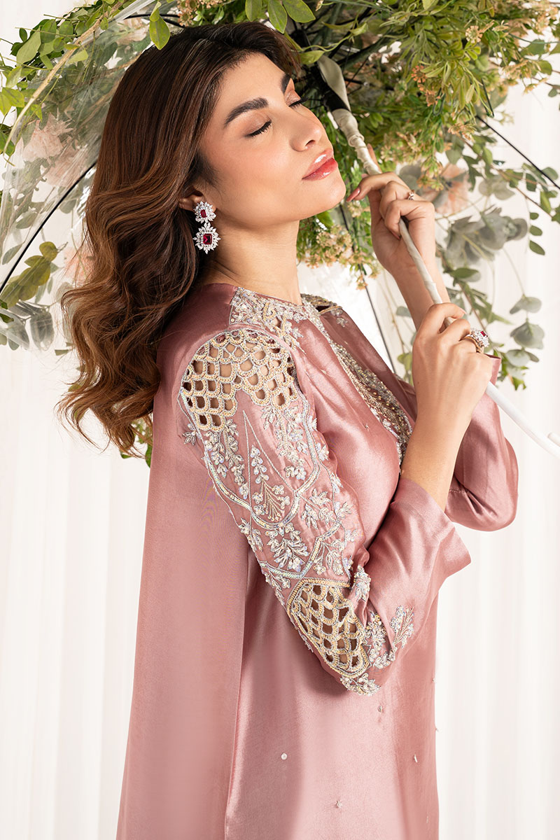 Statement hand embellished cutwork neckline and sleeves on a base of luxurious Sheesha Silk shirt, paired with Korean silk pants with tilla cutwork detailing. The pearl spray net dupatta can be added on to complete the statement look.