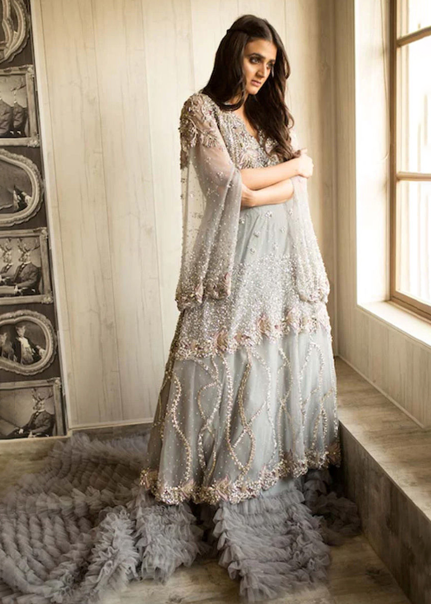 Grey gown, with exaggerated sleeves and tulle textured tail underskirt.