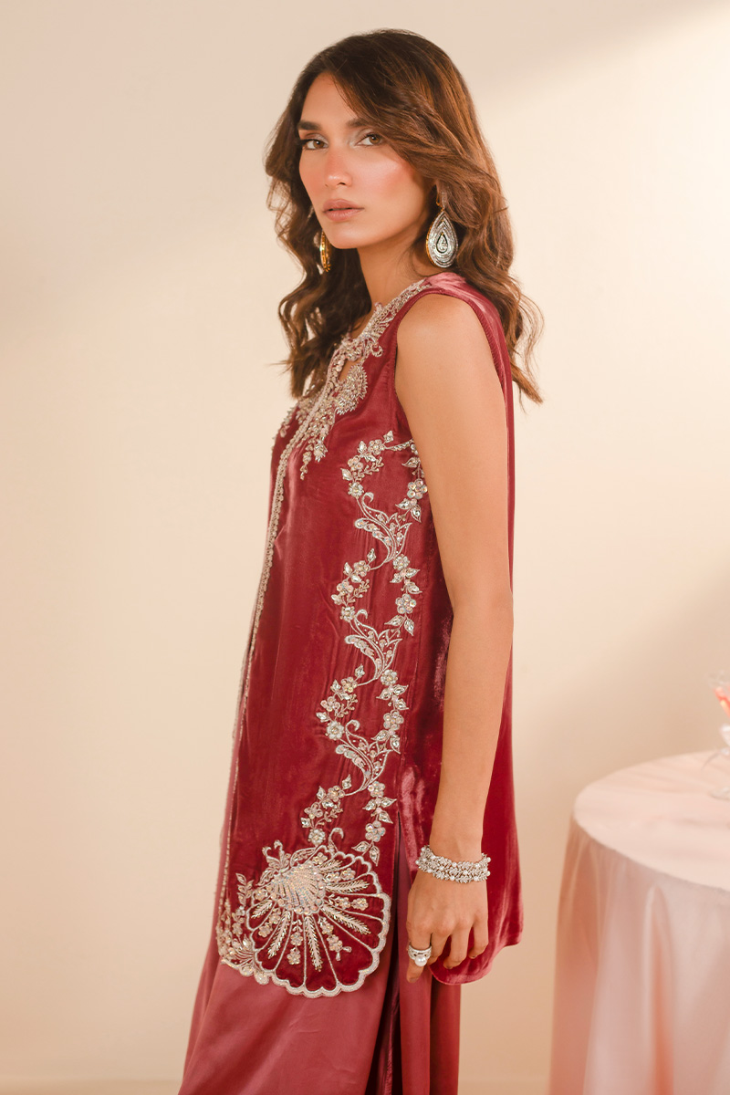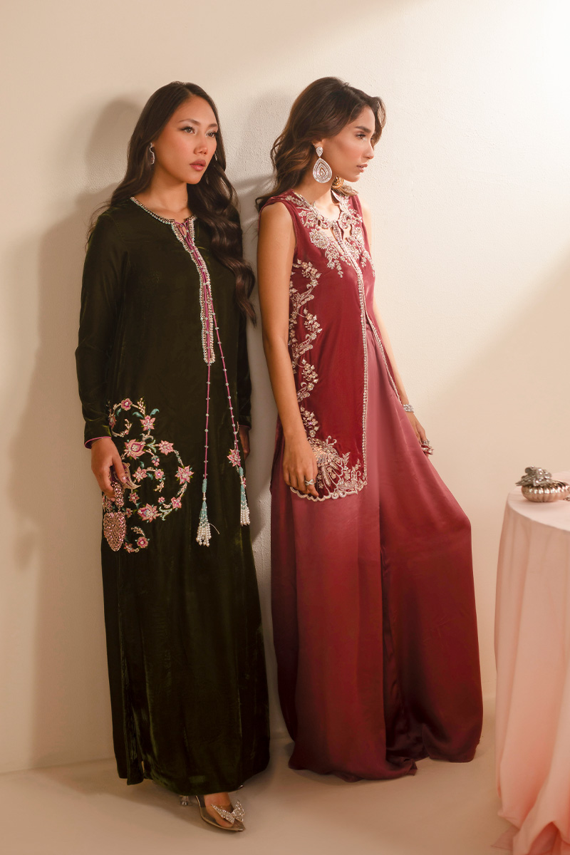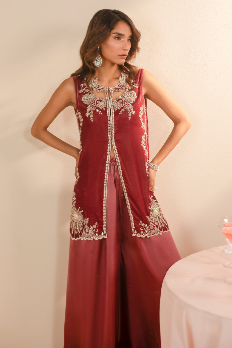 Make a statement with this velvet jacket ensemble in a rich wine hue, intricately embroidered and embellished with shimmering crystals, dabka, nakshi and rich compositions of pearls with sequins. The front open jacket features exquisite floral and scalloped motifs in the front and on the hem as well, creating a very regal and refined look. It is paired with elegant flared pants which perfectly balances elegance and opulence making it the perfect pick for all your festive occasions.