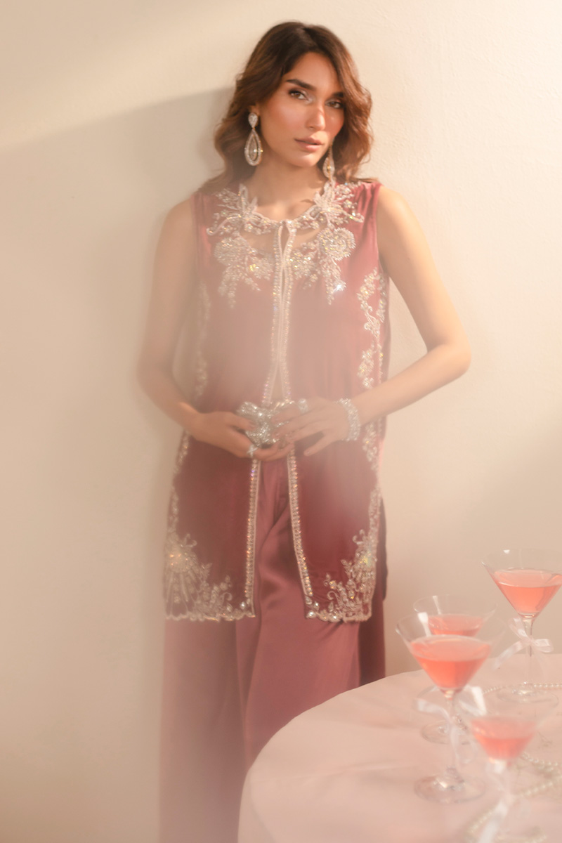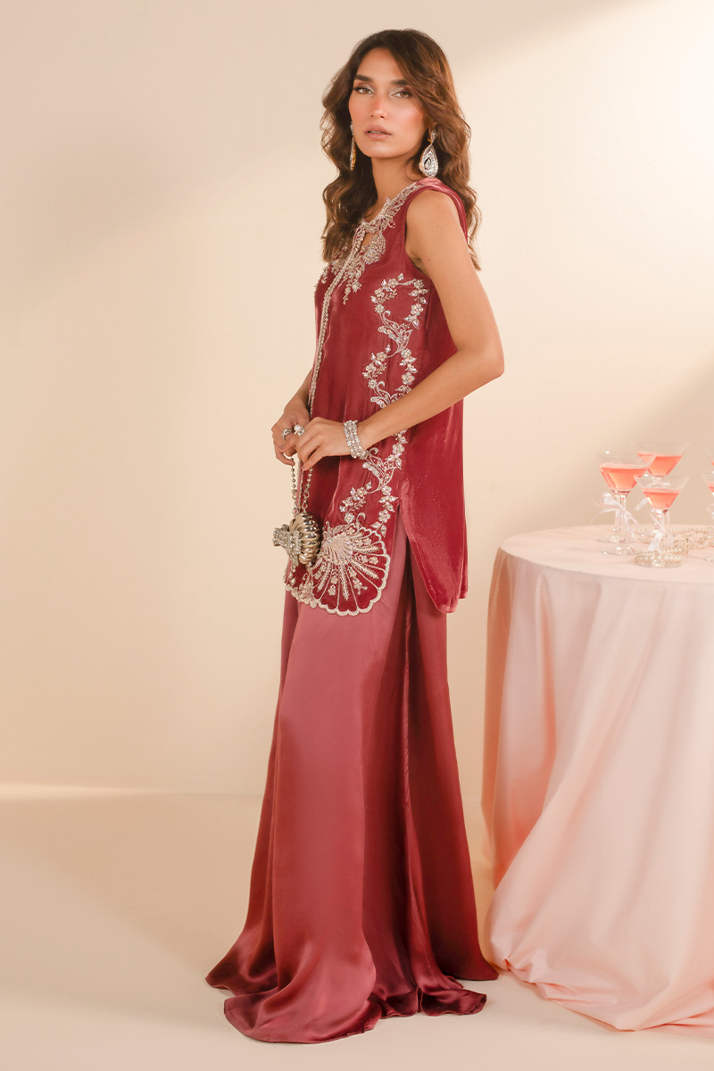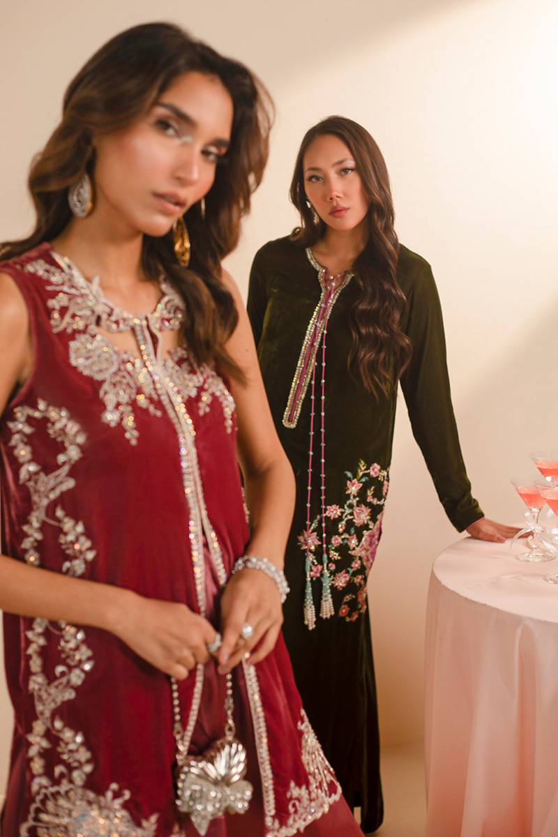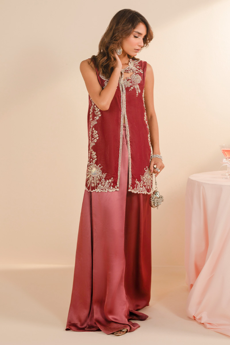 Make a statement with this velvet jacket ensemble in a rich wine hue, intricately embroidered and embellished with shimmering crystals, dabka, nakshi and rich compositions of pearls with sequins. The front open jacket features exquisite floral and scalloped motifs in the front and on the hem as well, creating a very regal and refined look. It is paired with elegant flared pants which perfectly balances elegance and opulence making it the perfect pick for all your festive occasions.