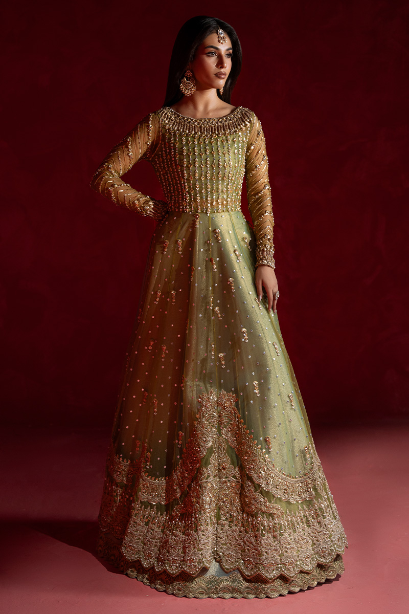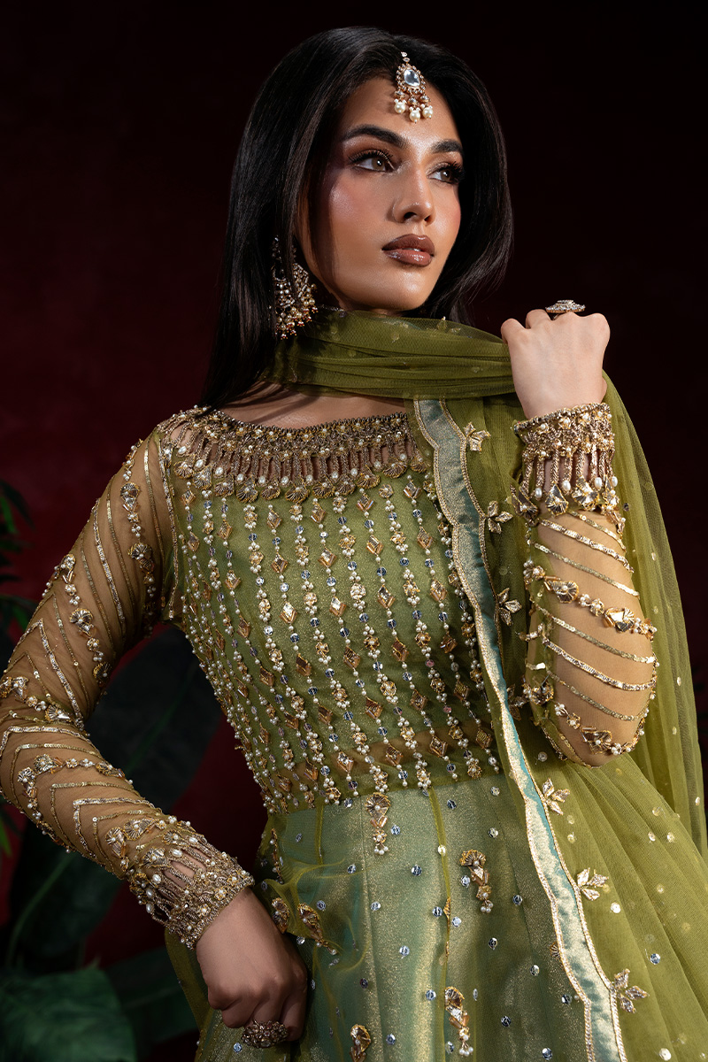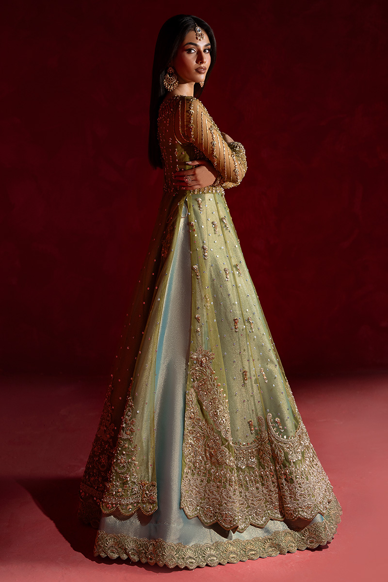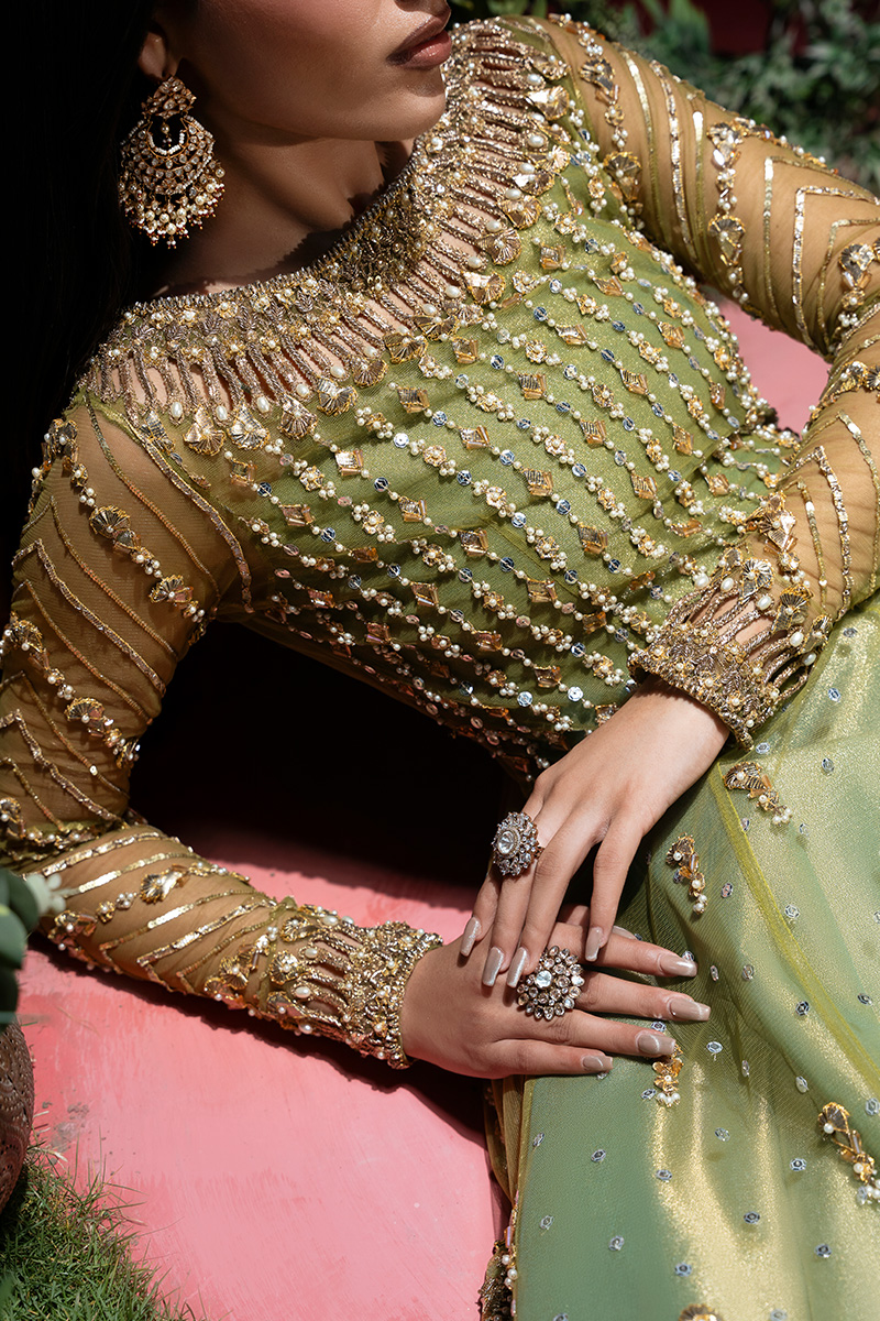 A stunning pear green net A-line shirt, intricately Embellished with a lavish blend of tilla, kora, nakshi, dabka, zero-size cut dana, sitara, pearls, and gota patti. The front and back panels shimmer with fine craftsmanship, while the voluminous flare is brought to life with scattered motifs of gota and pearls, adding graceful movement and depth. Handmade heavy tassels on the side slits lend a luxurious, traditional charm that elevates the entire silhouette.The gown-style blouse is a masterpiece of parallel sitara and pearl work, finished with kulfi detailing and delicate gota patti edging. Sleeves are adorned with geometric patterns in sitara, nakshi, and pearls, enhanced by elegant cutwork and finished with shimmering gokharu accents on both the neckline and sleeve hems—each element thoughtfully placed to create a regal, cohesive look.Paired with a sea pear green tissue lehenga, edged in fine tilla and finished with tissue for a soft, luminous effect. The net dupatta completes the ensemble with scattered sitara throughout, scalloped borders on both lengths, and heavy Embellished edges that frame the look with opulence.This ensemble is a celebration of heritage artistry and modern sophistication—designed for the bride who seeks timeless elegance with a touch of grandeur.