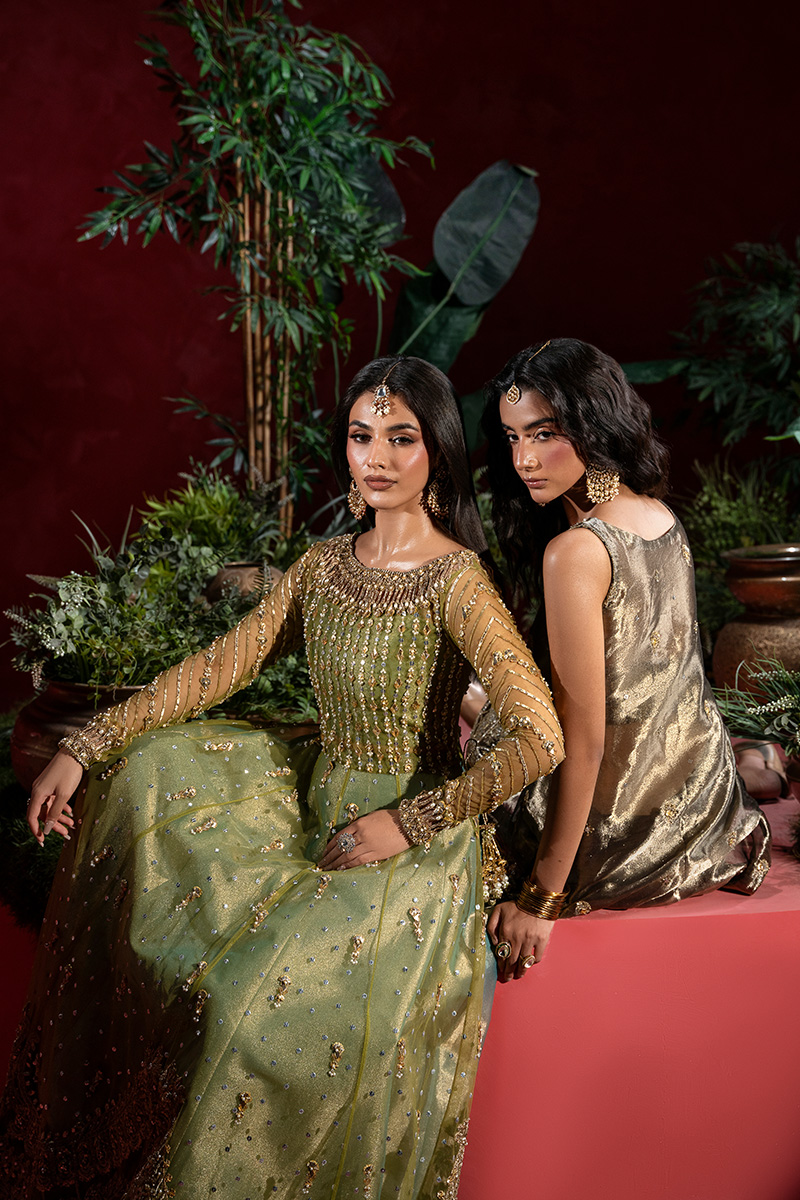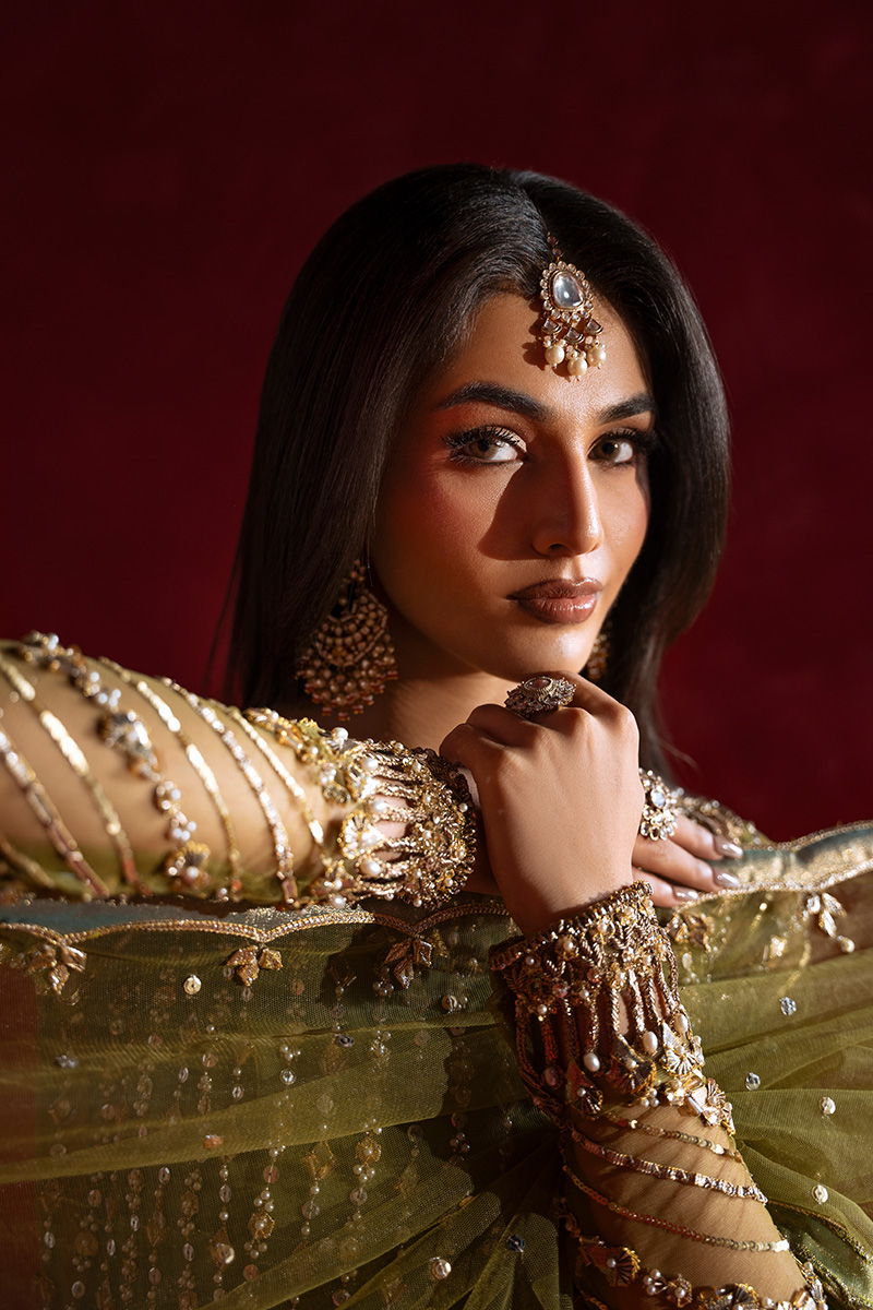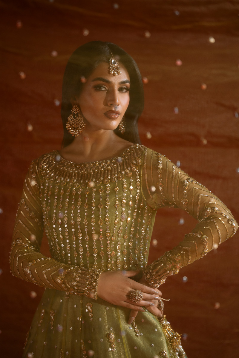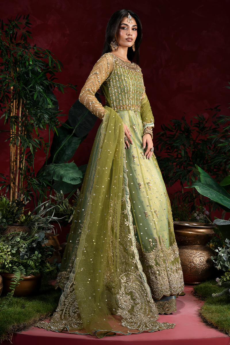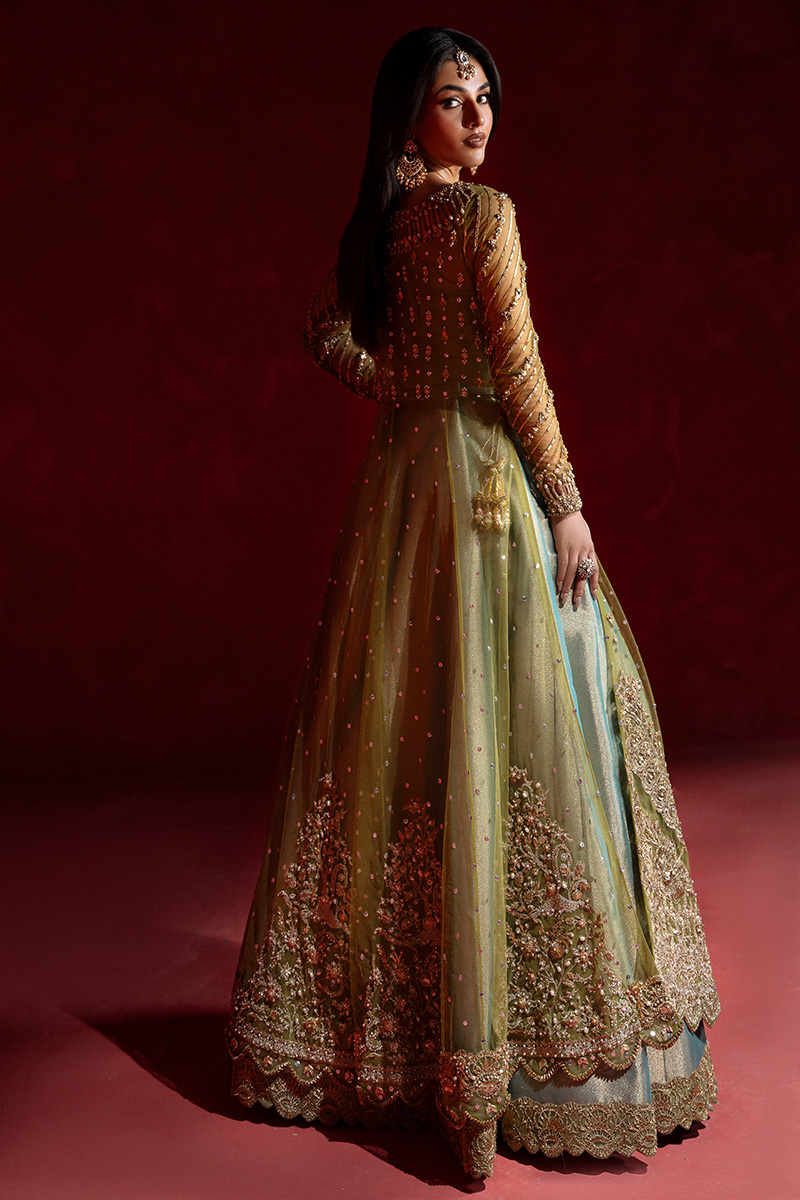A stunning pear green net A-line shirt, intricately Embellished with a lavish blend of tilla, kora, nakshi, dabka, zero-size cut dana, sitara, pearls, and gota patti. The front and back panels shimmer with fine craftsmanship, while the voluminous flare is brought to life with scattered motifs of gota and pearls, adding graceful movement and depth. Handmade heavy tassels on the side slits lend a luxurious, traditional charm that elevates the entire silhouette.The gown-style blouse is a masterpiece of parallel sitara and pearl work, finished with kulfi detailing and delicate gota patti edging. Sleeves are adorned with geometric patterns in sitara, nakshi, and pearls, enhanced by elegant cutwork and finished with shimmering gokharu accents on both the neckline and sleeve hems—each element thoughtfully placed to create a regal, cohesive look.Paired with a sea pear green tissue lehenga, edged in fine tilla and finished with tissue for a soft, luminous effect. The net dupatta completes the ensemble with scattered sitara throughout, scalloped borders on both lengths, and heavy Embellished edges that frame the look with opulence.This ensemble is a celebration of heritage artistry and modern sophistication—designed for the bride who seeks timeless elegance with a touch of grandeur.