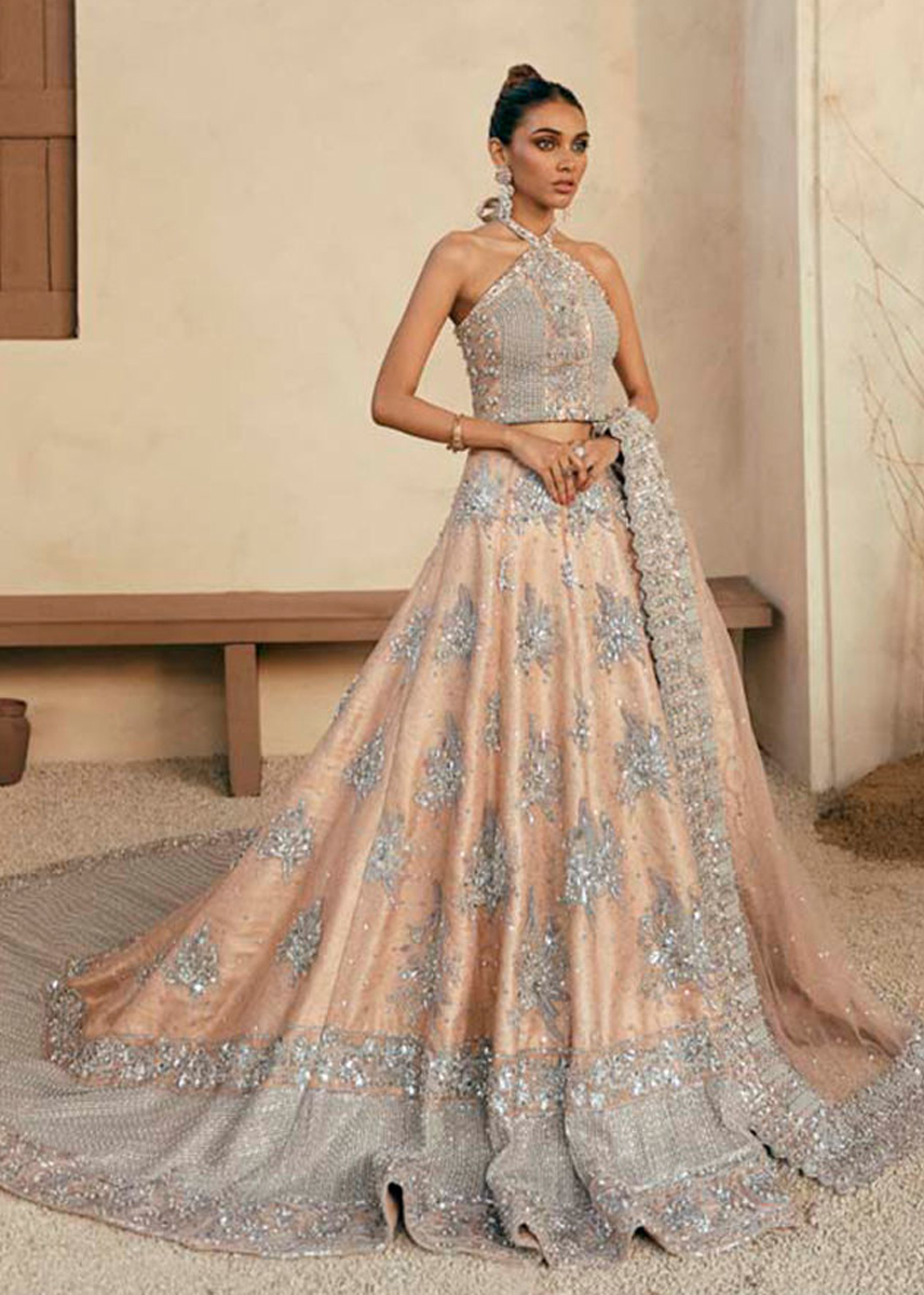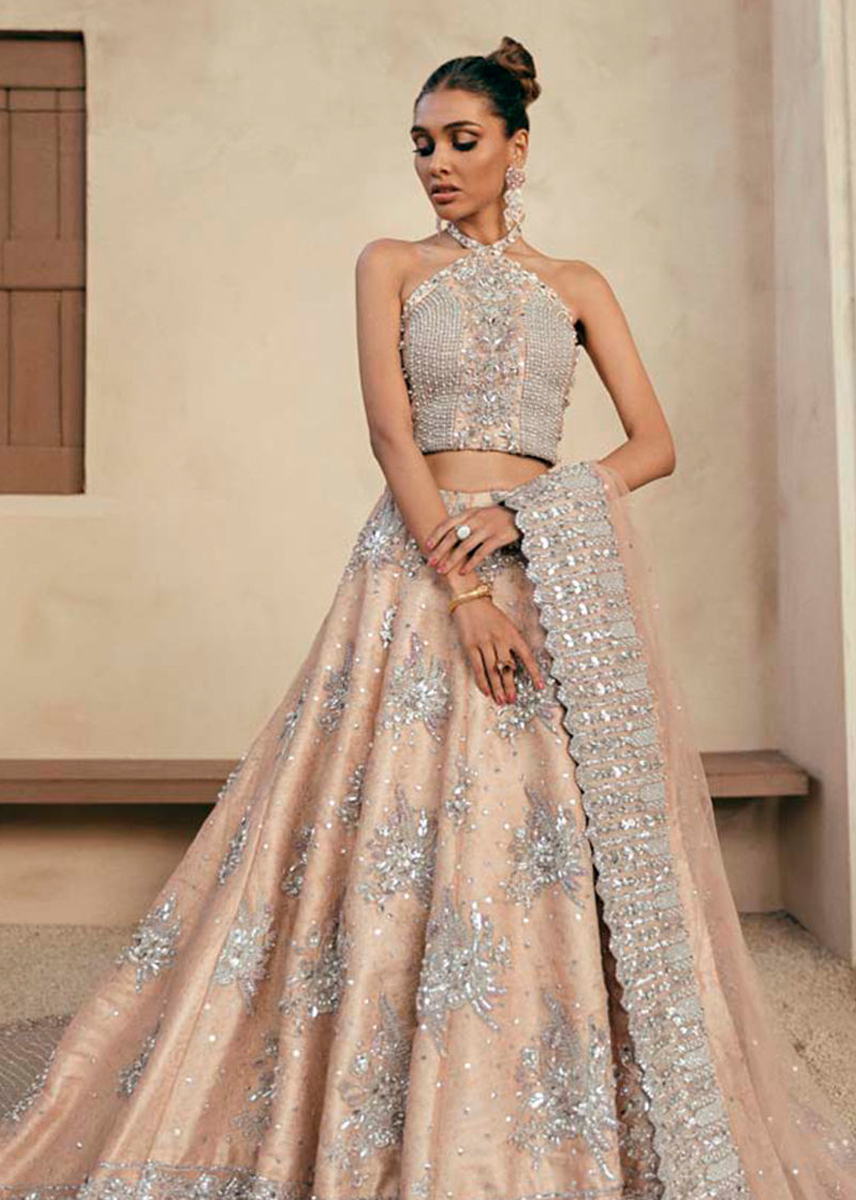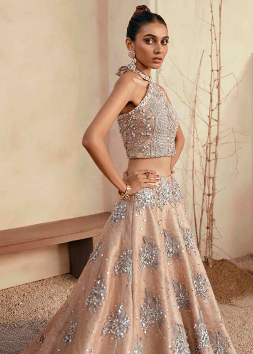 Peach tail skirt with pearl seqiun, silk thread embroidery and resham work. adorned with crystals on a halter blouse blouse, paired with a peach tulle broad border dupatta.