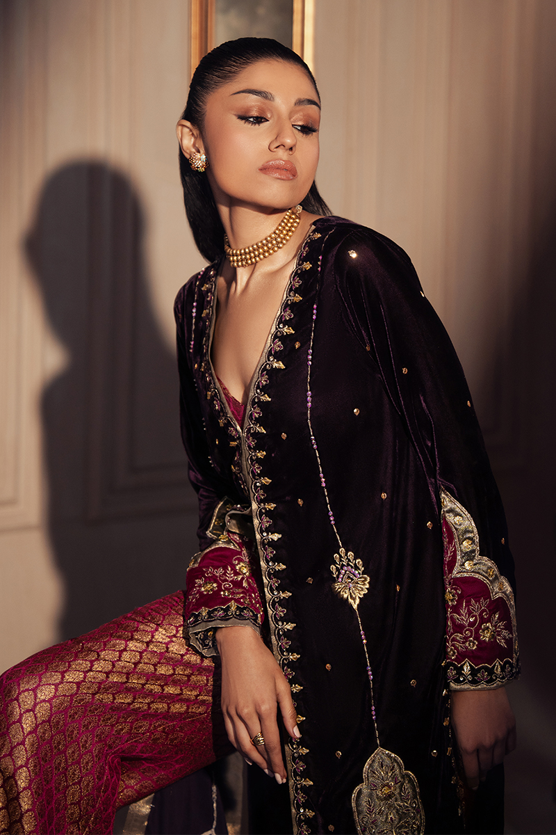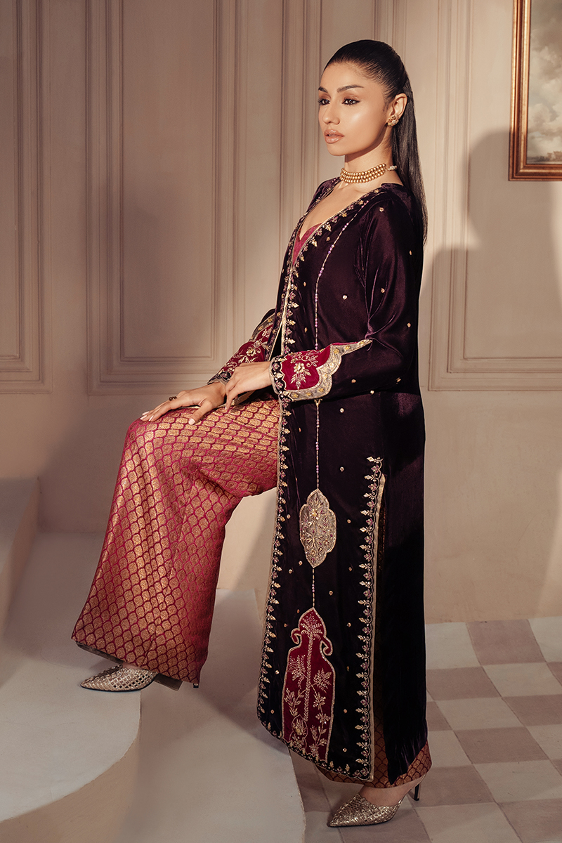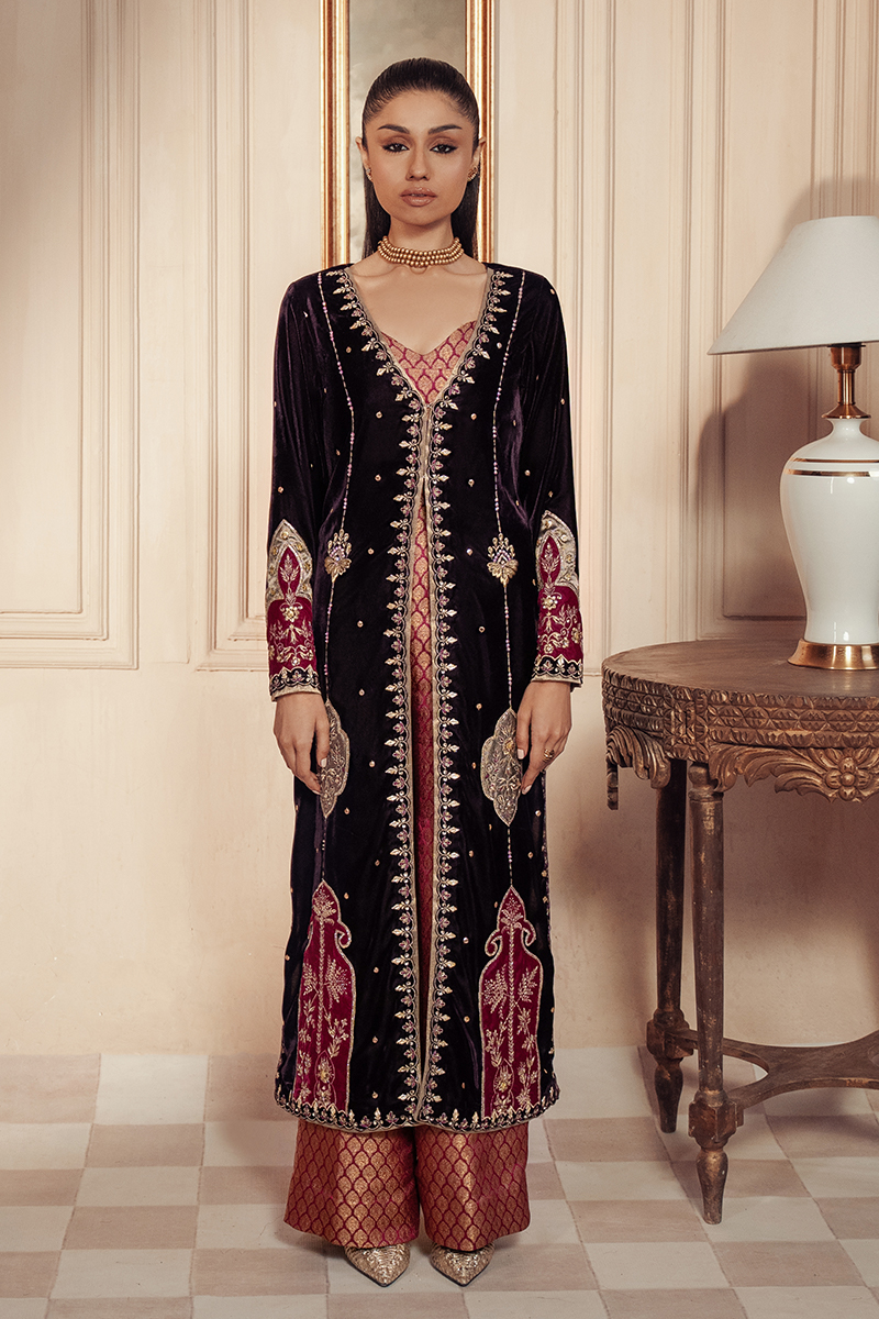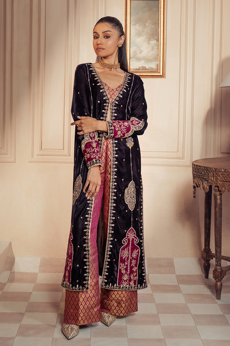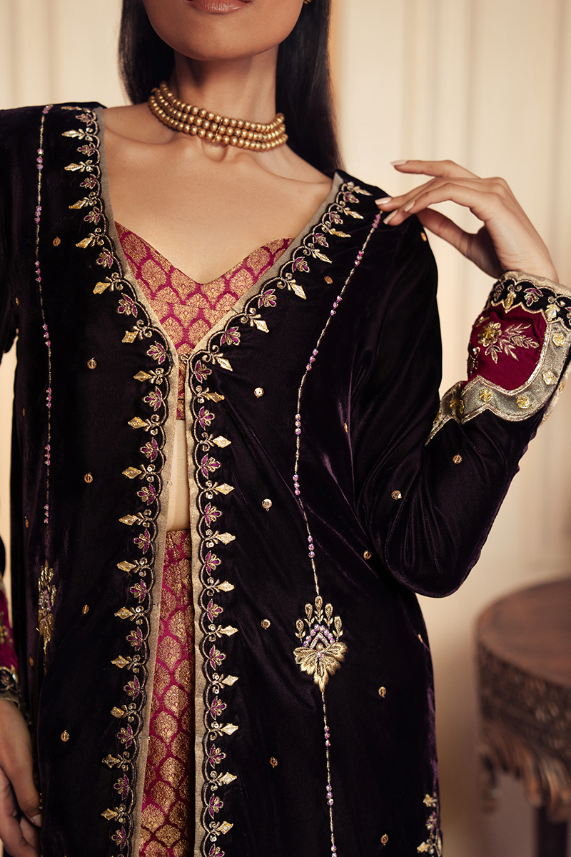 An eggplant purple velvet front-open gown adorned with hand-embellished dabka, gota, and sequin work, featuring intricate gold and pink appliqué patterns on the gown and sleeves. Paired with a Banarasi undershirt and trousers, this ensemble is both regal and breathtakingly beautiful.