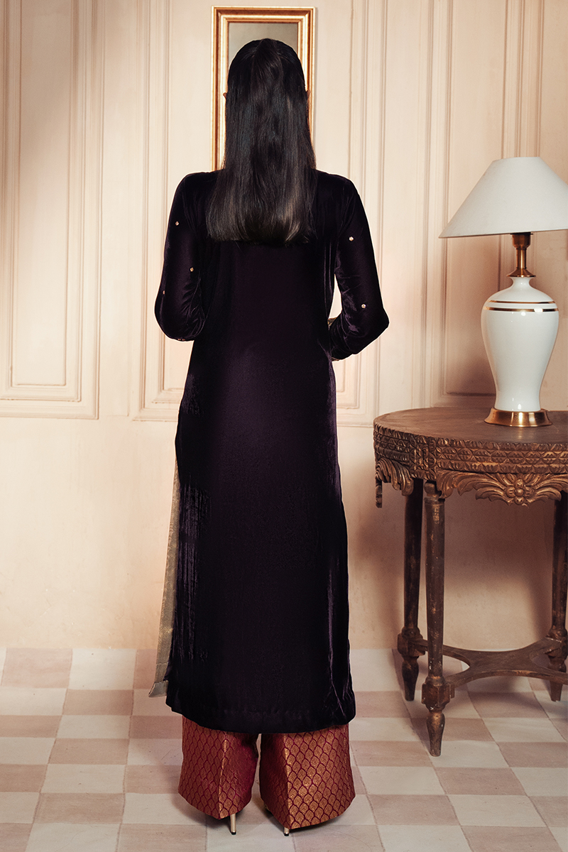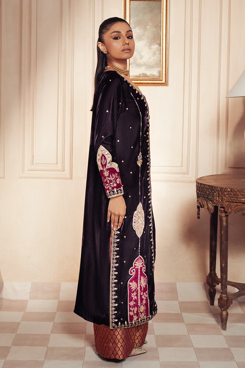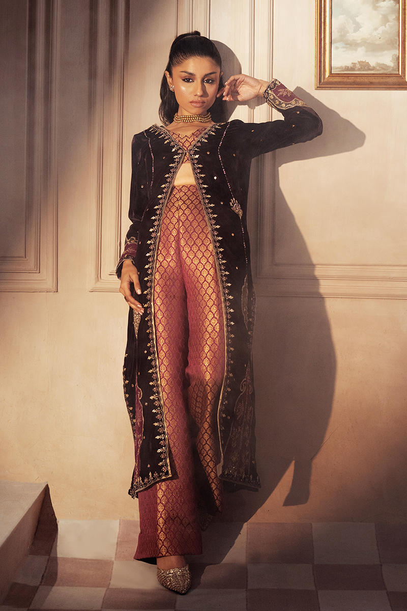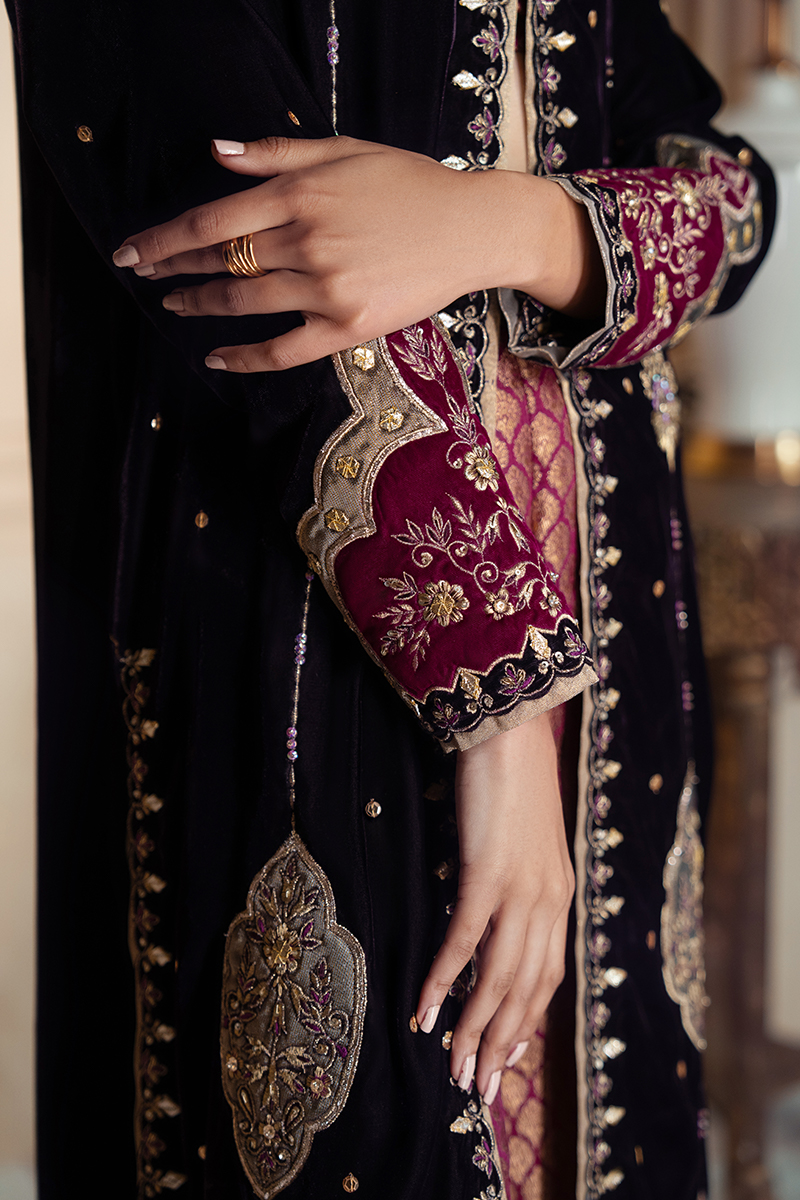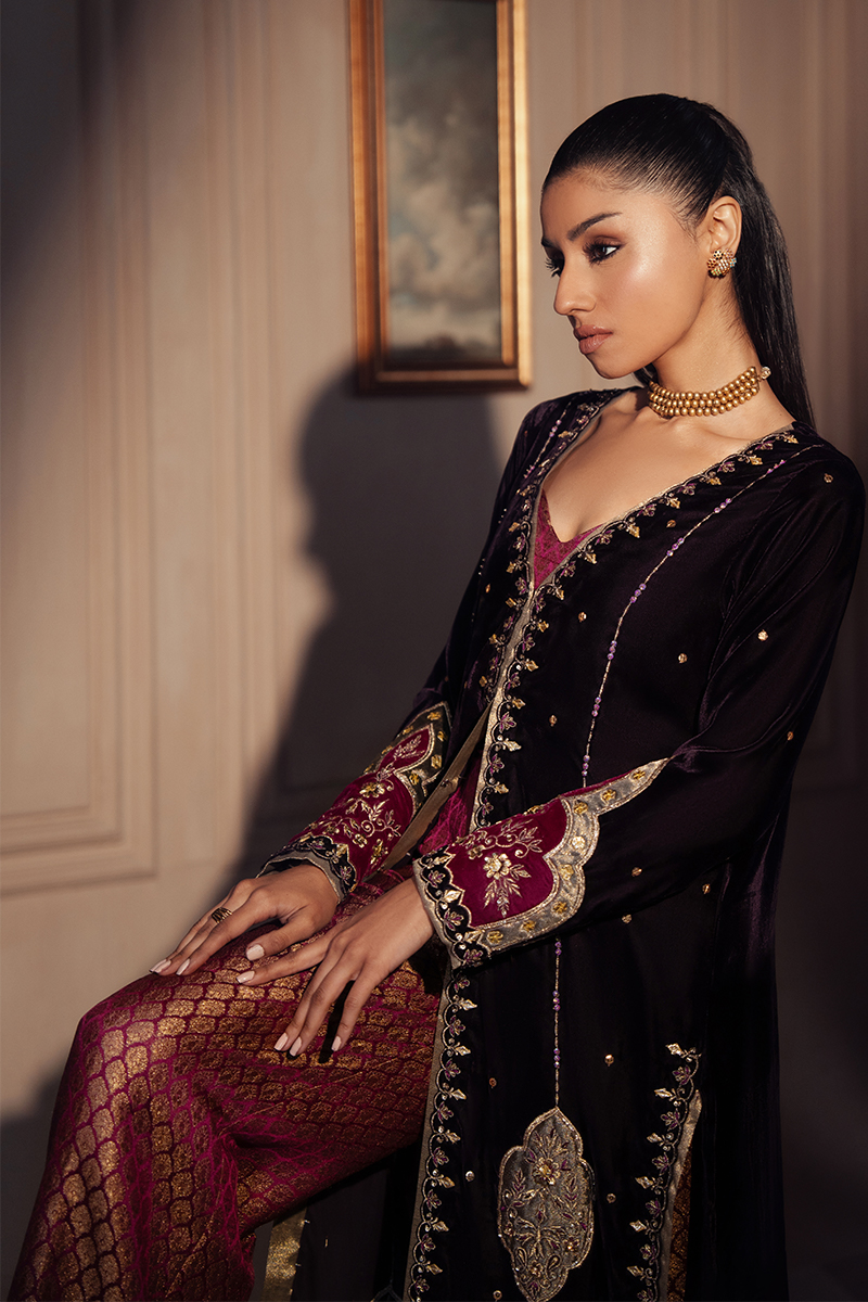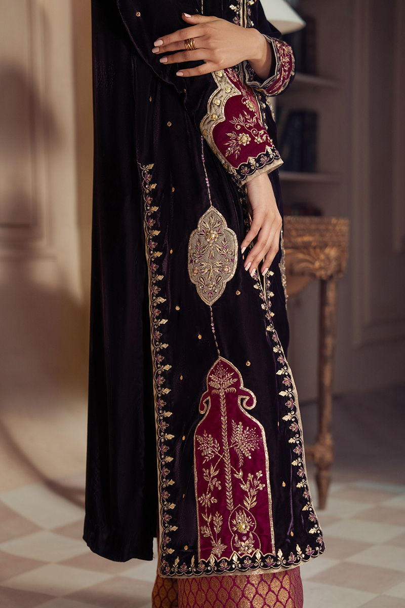 An eggplant purple velvet front-open gown adorned with hand-embellished dabka, gota, and sequin work, featuring intricate gold and pink appliqué patterns on the gown and sleeves. Paired with a Banarasi undershirt and trousers, this ensemble is both regal and breathtakingly beautiful.